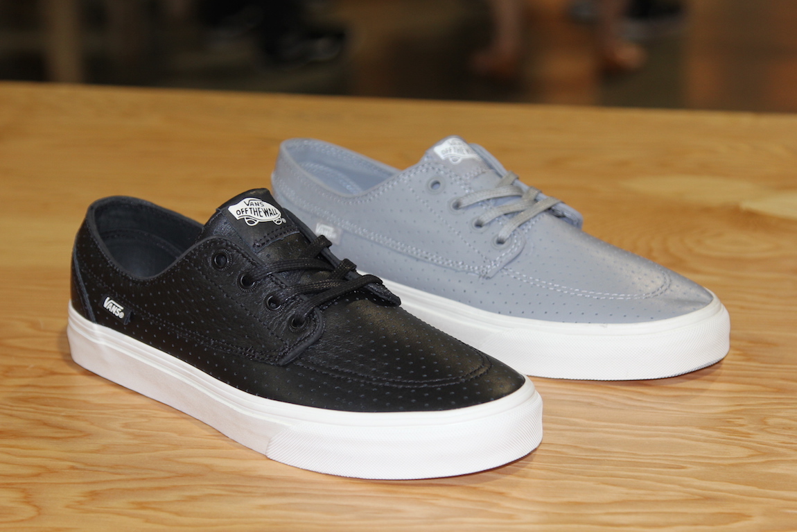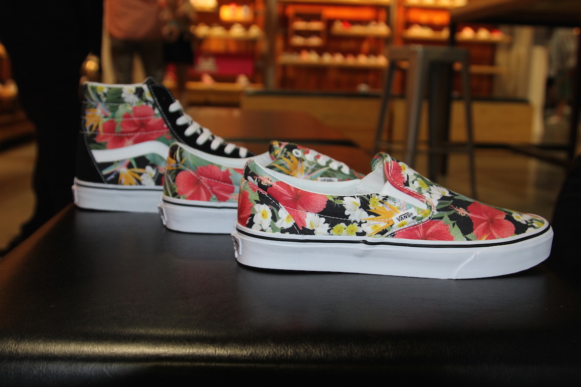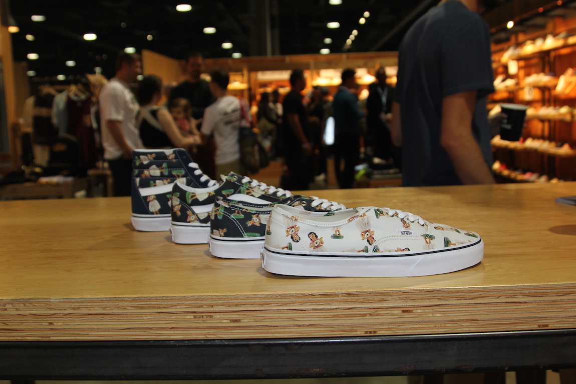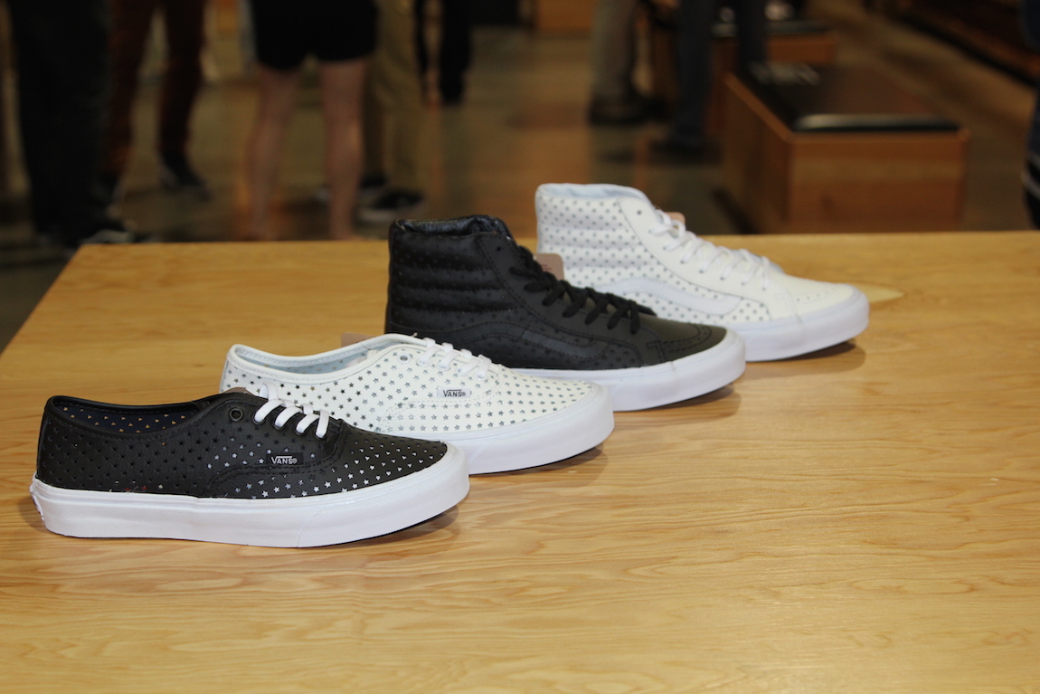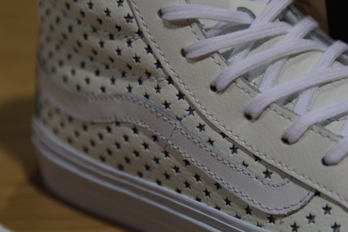 Last week was the Agenda Trade Show in Long Beach, and Nice Kicks was on location, peeping the new product for this upcoming year, and Vans looks to be dropping a few nice additions to their lineup. They’ve revisited the aloha floral print, this time in a new pattern featuring a large hibiscus flower as the main focal point, which will be available in a Sk8-Hi, an Era, and a Slip-On. The next set is a familiar one. The Hula Girl has been featured on a few apparel pieces in the past, as well as on some SAMPLE Authentics that were given out at a golf charity event, which I have a pair laying around somewhere that I scored off eBay. It looks like they’ve created a black pair as well, and included an Old Skool and a Sk8-Hi to the collection. The pairs that stole the show I must say, are the “star-perforated” Black or White leather tonal Sk8-Hi and Authentic. These are awesomely original and should do quite nicely. I can see these being customized by just about everyone. Look for all of these to drop later on in the year!