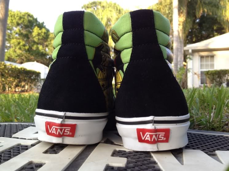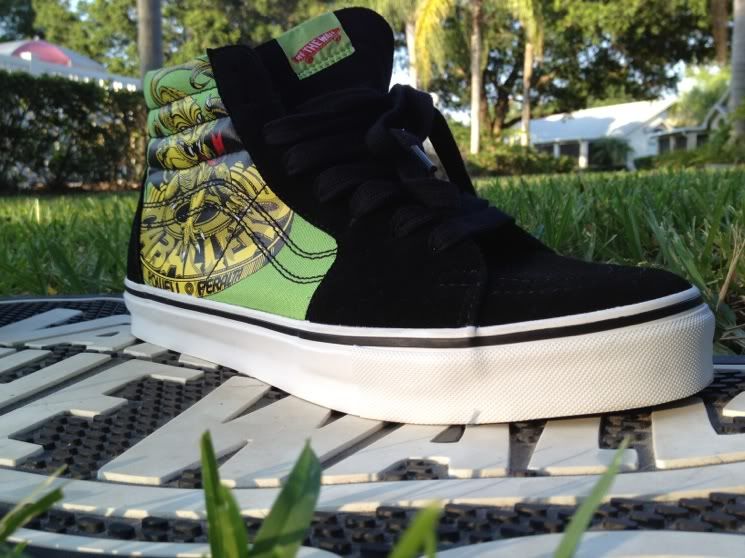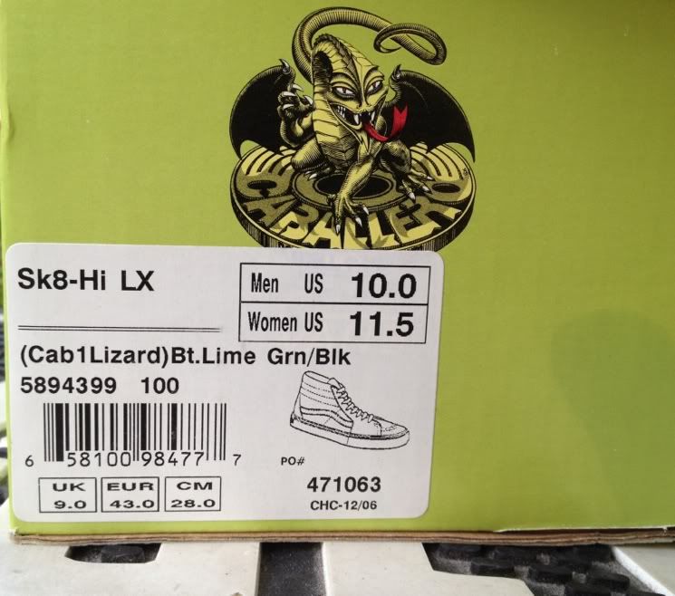 vans vault cab 1 sk8 hi's.. personally really sad to see these go.. on of those shoes that just was iconic to me, the graphic , early vault years, soo much attachment and after i beat my 1st pair, it turned into one of those never ending hunts.. good luck finding another pair in this condition.. basically flawless. worn once in the house, even the little rubber "nipples" where they poured the rubber into mold are there ( and pictured ) lol