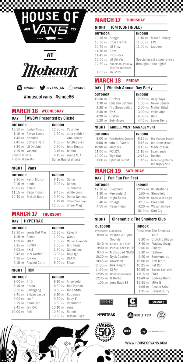 Kicking off March 16, Vans returns to the SXSW Music Festival for a week-long pop up edition of its cultural hub, House of Vans, at Austin’s historical live music venue, the Mohawk. The House of Vans returns for the fourth year and honors Vans’ 50-year legacy of creative expression across action sports, art, music and street culture. To ring in the celebration, House Vans at the Mohawk calls upon Texas local and genre defying icon, Erykah Badu, for a special live performance exclusive to House of Vans. A wide array of musical genius including Neon Indian, Kelela, White Lung, Quinn, Kevin Morby, James Supercave, Hinds, Domo Genesis, Downtown Boys and Sheer Mag are set to take the stage for a celebration of a lifetime. House of Vans at the Mohawk parties will feature an eclectic lineup of “Off The Wall” talent. Programming partners include Cliché, Hypetrak, The Windish Agency, Middle West Management, Fun Fun Fun Fest and Cinematic Music Group.