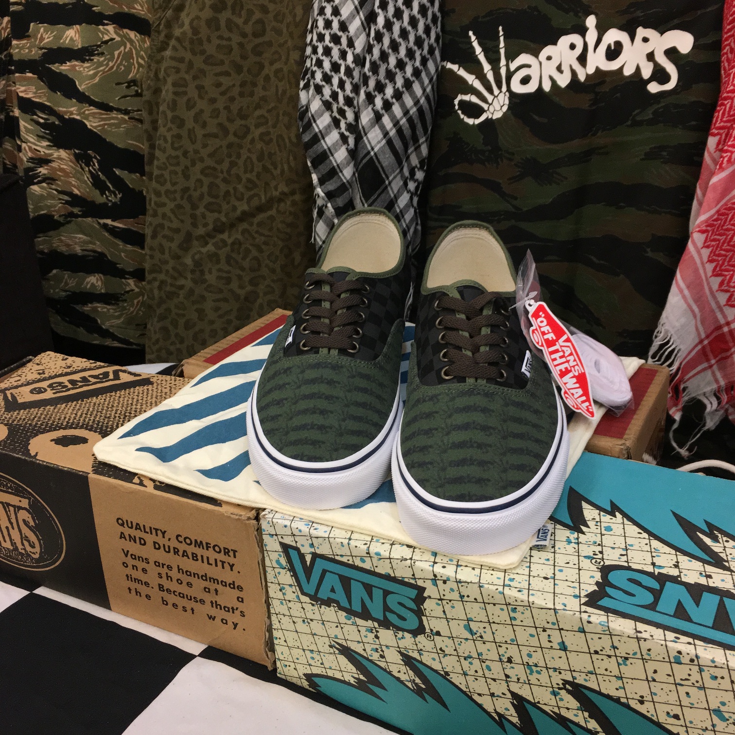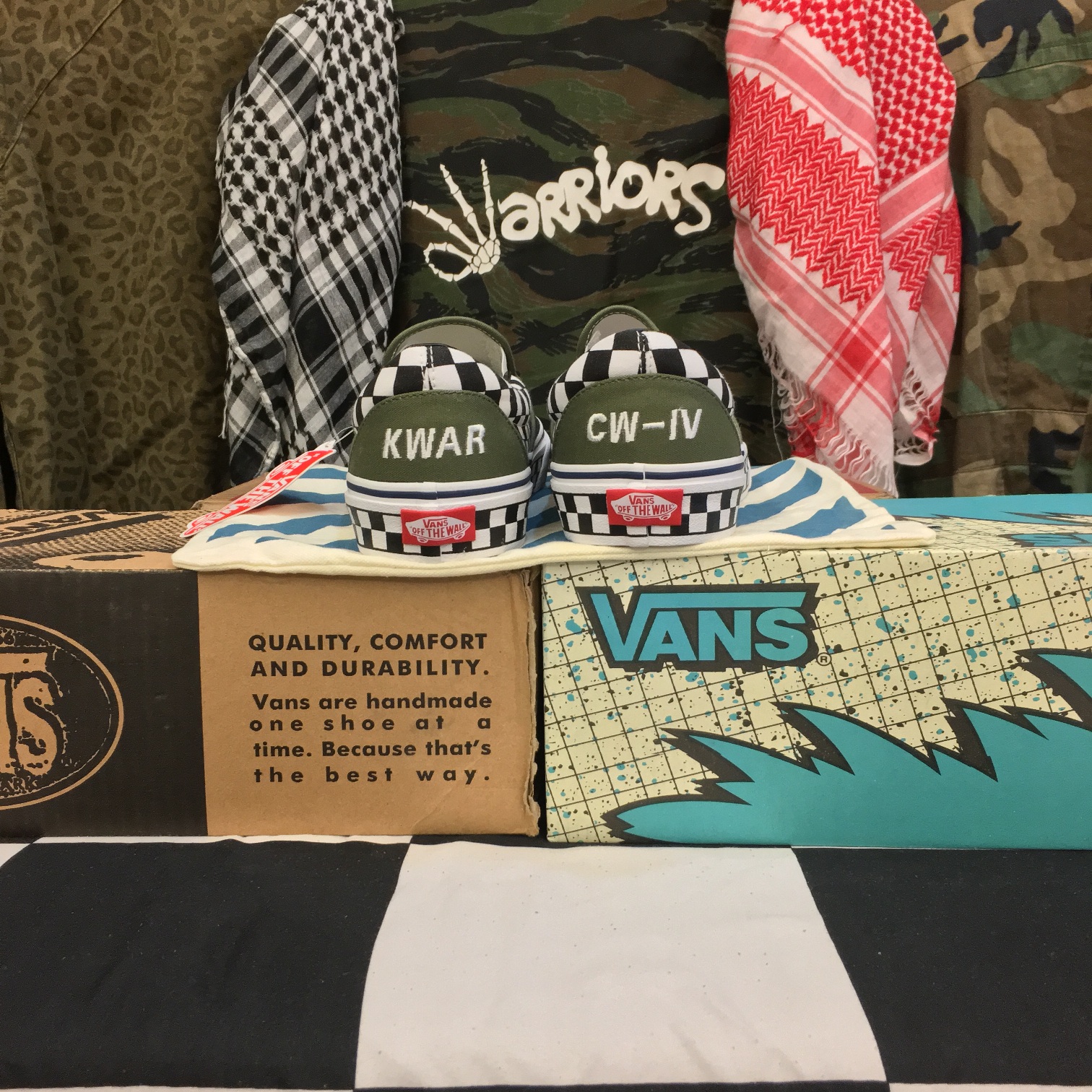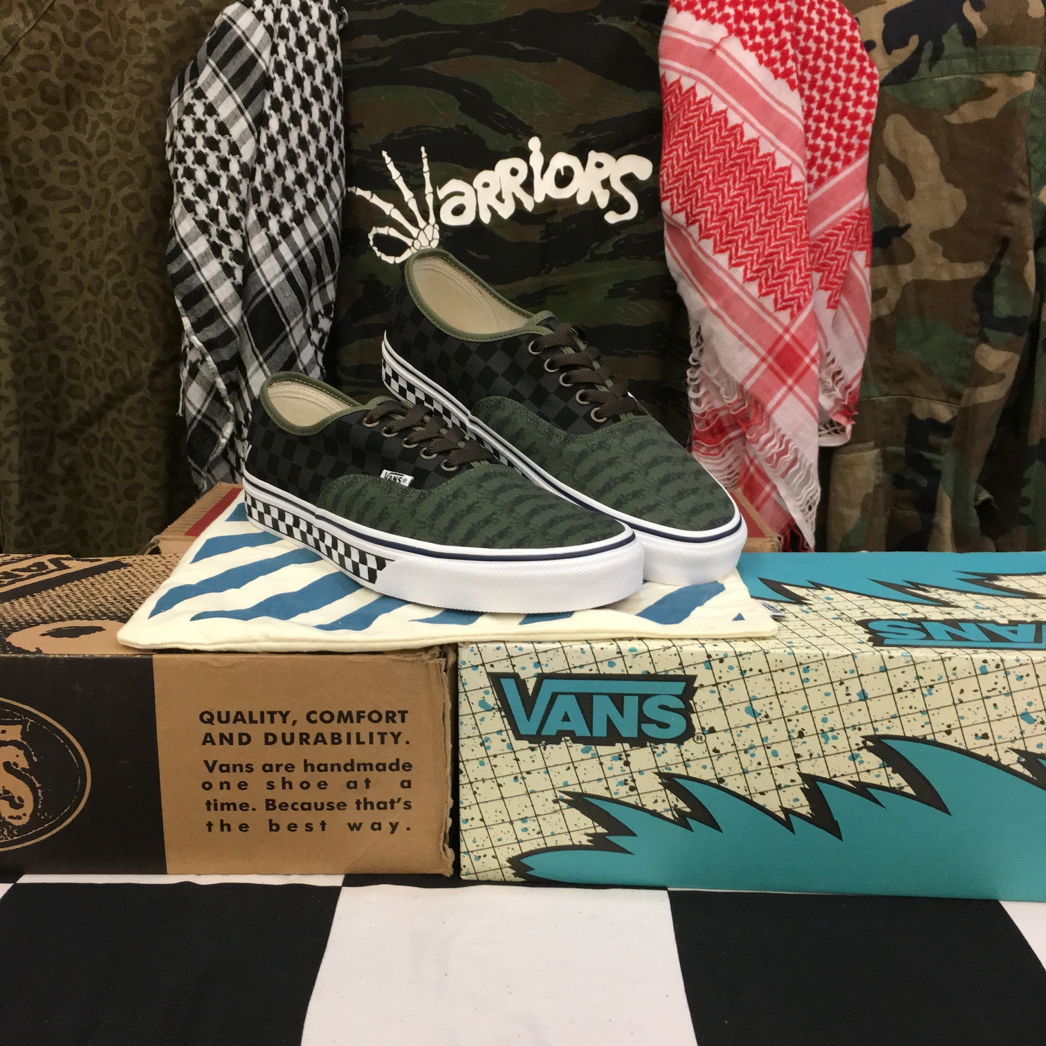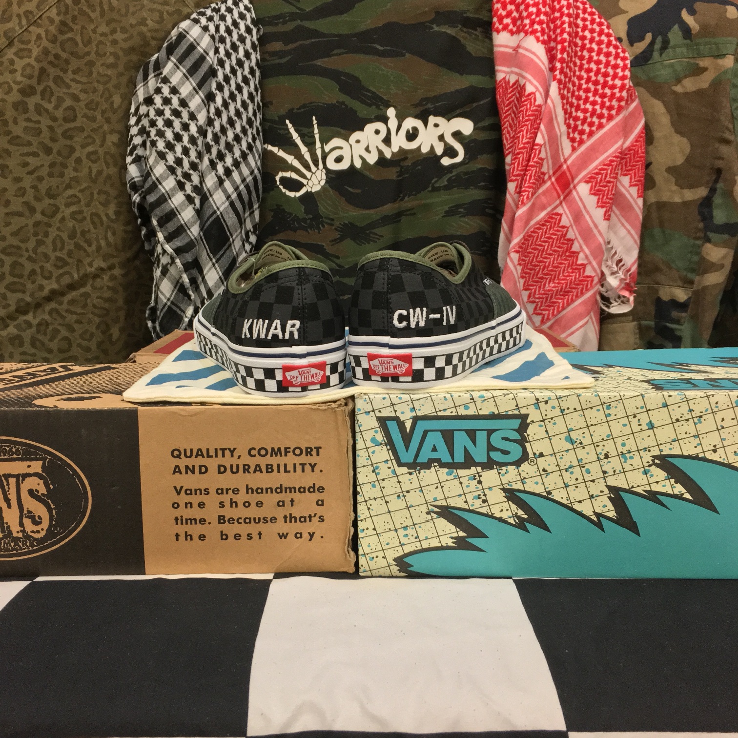 The ‘CW-IV’ defines the Kadirwarriors and our love of Vintage Japanese Americana style, especially the vintage Vans look, with the iconic checkered foxing. We chose the checkerboard motif as it commemorates every single one of us to why we are here in the first place. The olive (Army Green) theme was added as it has been instilled in most of us, having that military vibe in our style. The ‘Warriors’ repeat pattern on the Authentic was selected to commemorate one of our favorite classic designs, the FuckingAwesome x Vans. I remember we were all looking forward to the Authentic releasing. Fun fact: Under The Palms made a repost of all the official 3 colors released worn by us in the @underthepalms IG account. We were all so stoked!