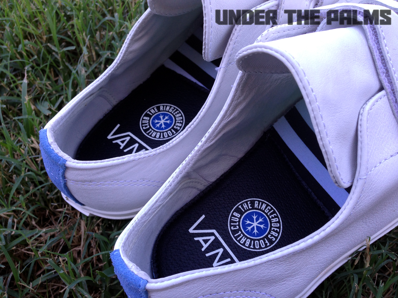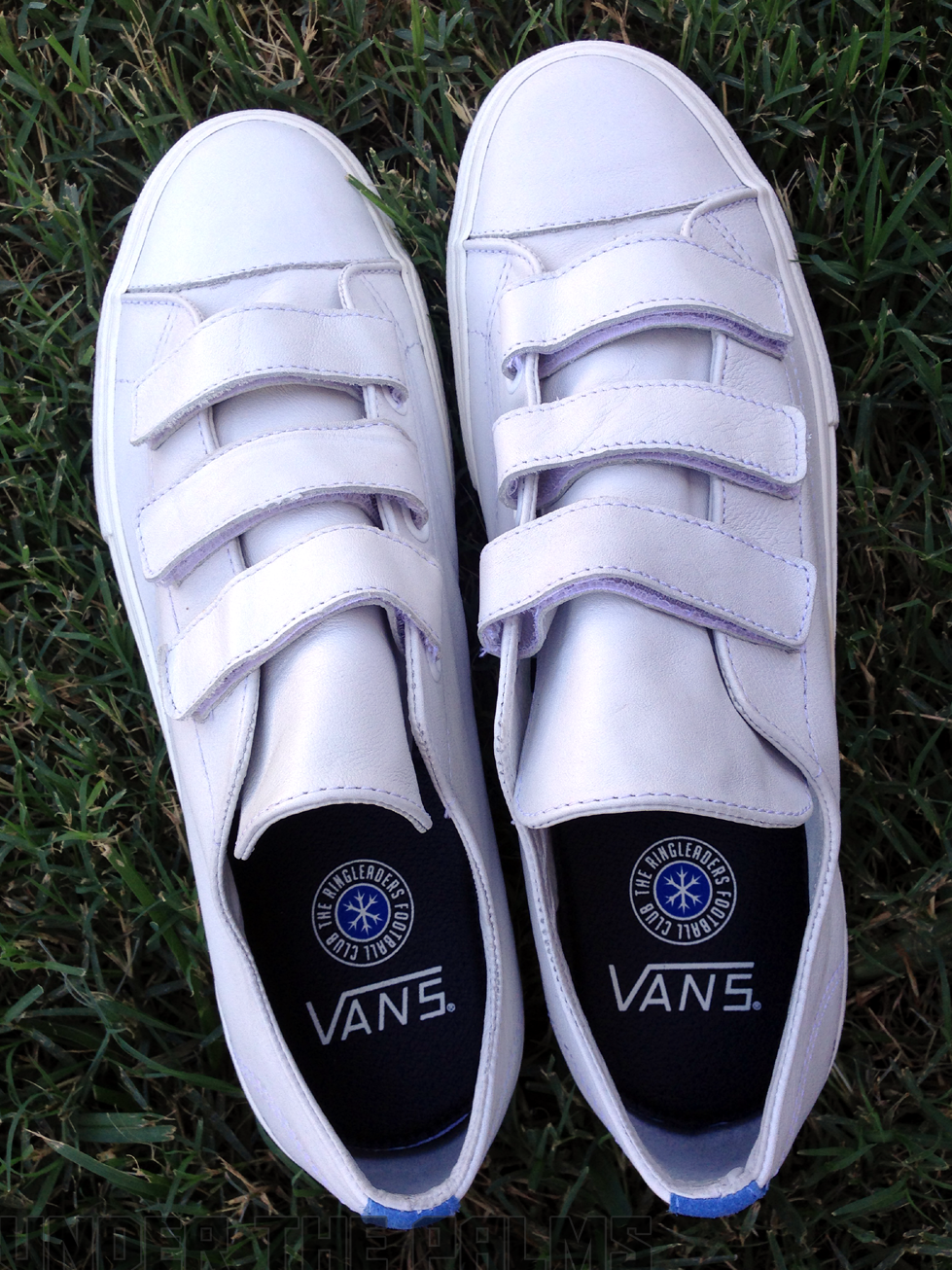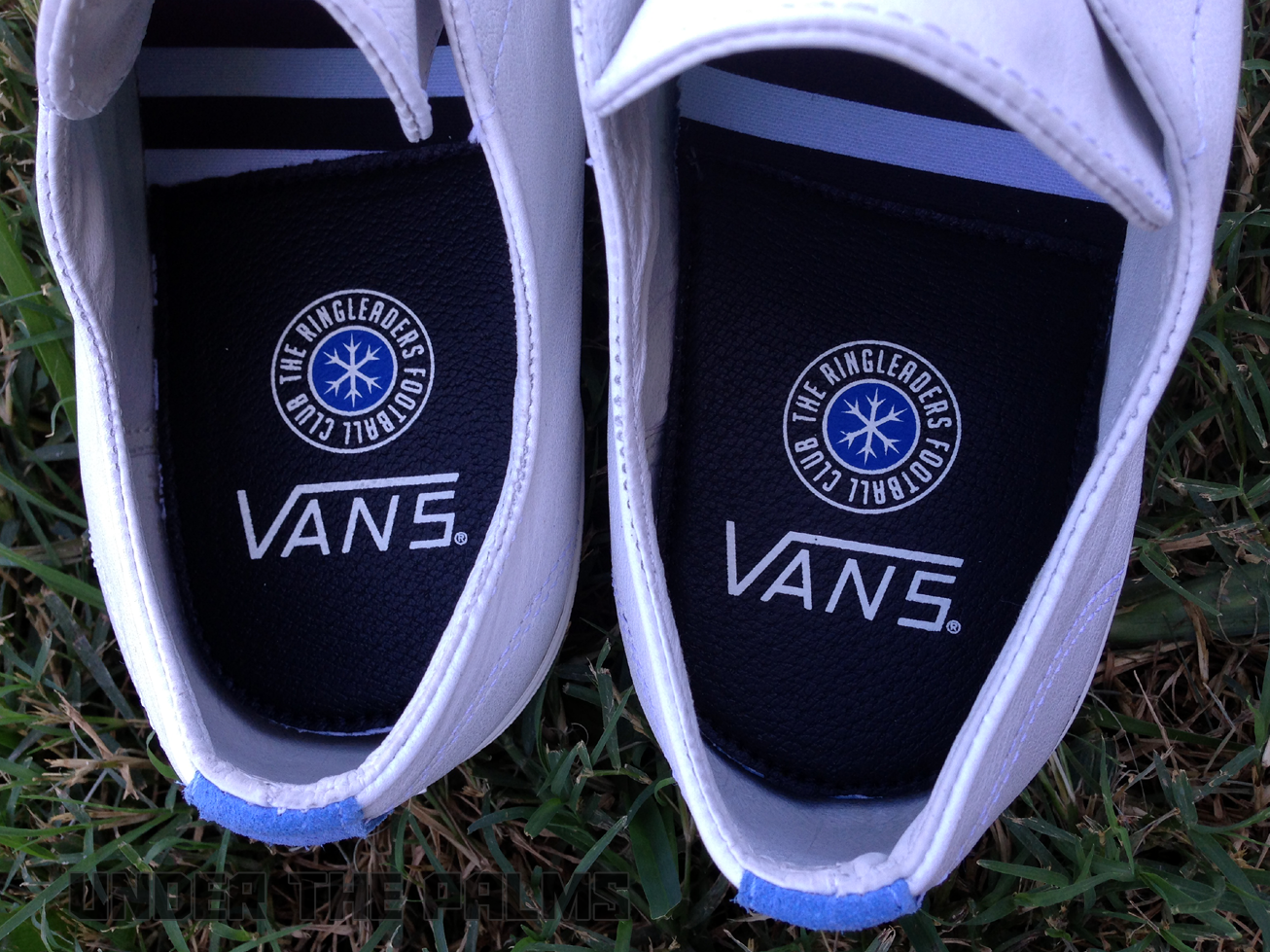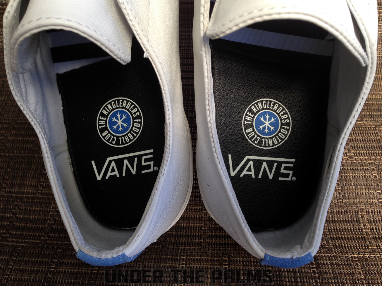 First off, the choice of using a Prison Issue was an awesome idea. This model doesn’t come around often, and if so, it’s buried amongst a lineup of other general releases at your typical Vans store, and the last premium pair we saw were the Vault perforated nubuck edition. The shade of white utilized on this Prison Issue LX is pure, and I’d say it has just a slight tint of gray compared to the all-white Vault leather pack that just re-released. The contrasting blue suede heel strip lets you know these aren’t your average pair, and the very minimal RFC lettering on the side of the heel doesn’t distract from the overall aesthetic. The heel pad lining has the Ringleaders custom logo, as every proper collaboration should include, and the rest of the footbed has a unique black and white pattern on it. Your favorite gum waffle sole finishes these off nicely.