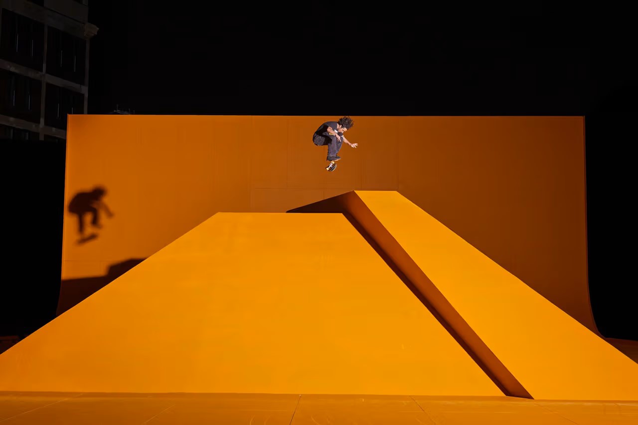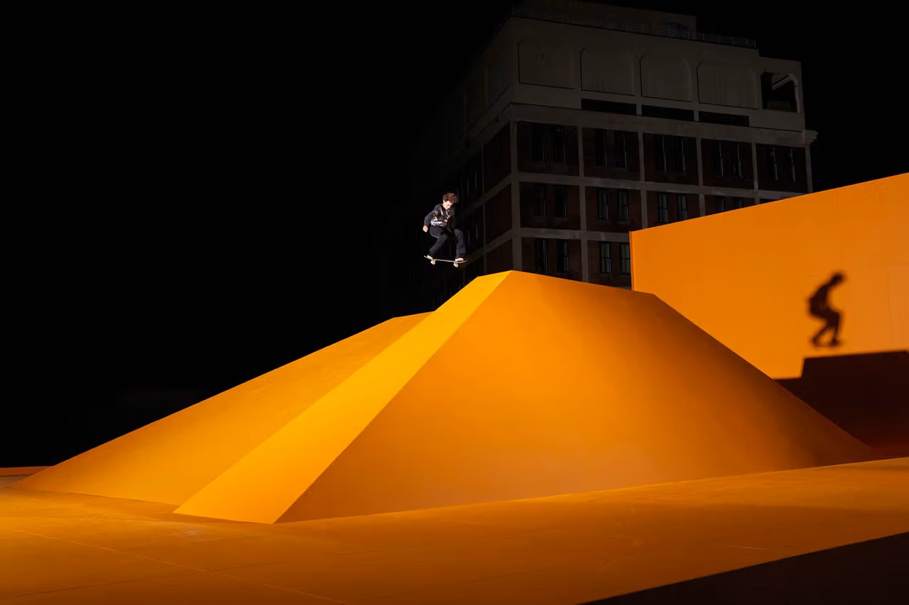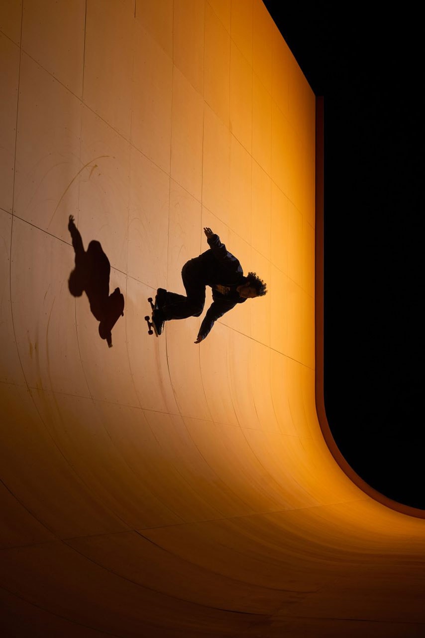 “At the center of the installation is a pyramid, split and shifted to create angles and edges for skaters to play off of. This pyramid is placed within a massive cyc wall, which serves both as a skate feature and an immersive visual color field.”