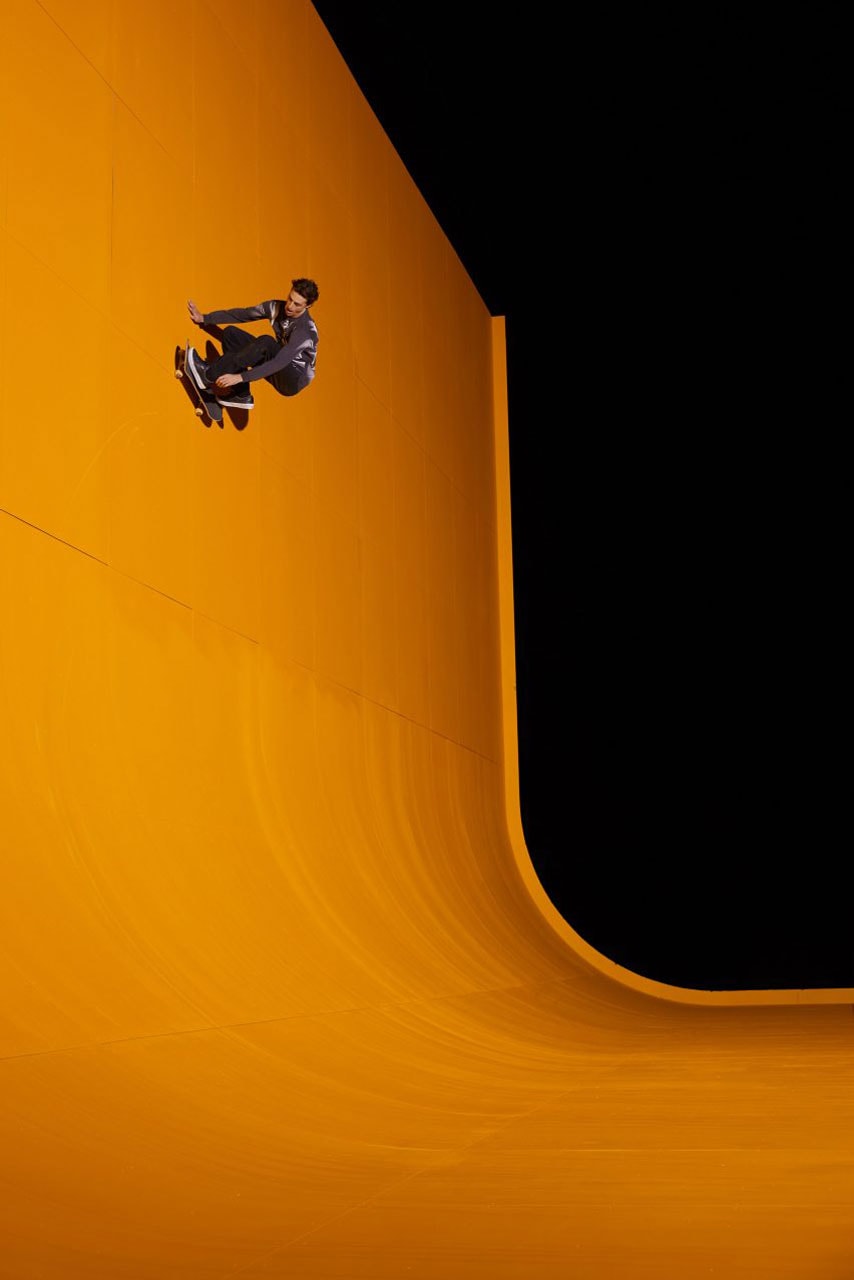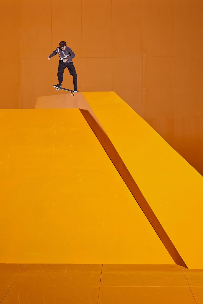 Drenched in a bright orange hue – one of Ruby’s signatures, and also one of the colorways of the “Clash the Wall” sneaker – the pyramid is a fully functioning skate ramp. The ramp stands at a whopping 12 feet tall and rests – clashes, that is – amidst an otherwise bland, void-of-color, industrial complex.