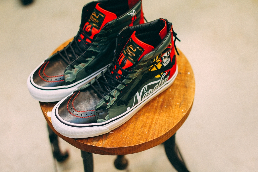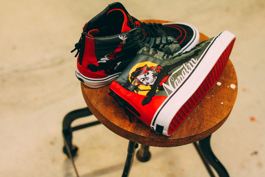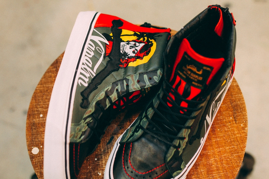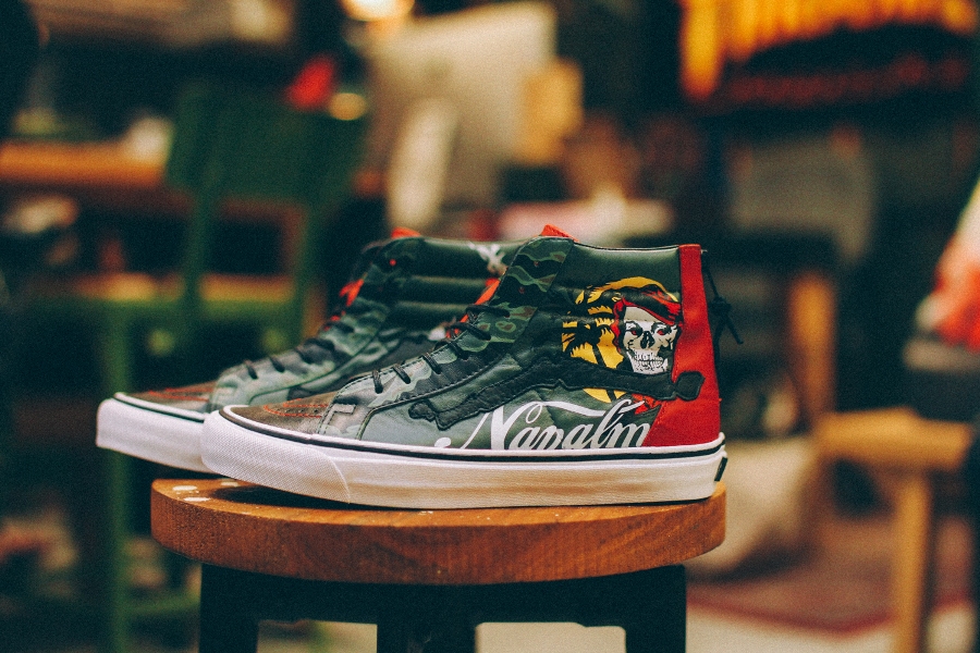 Check out this elaborate custom painted Blends x Vans Vault “Chili Pepper” Sk8-Hi Reissue Zip LX, by none other than our friend Mark Ong aka “SBTG or @mr_sabotage“, for our Vans community friend Dave Metcalf, who most of you know as @nu_dav on Instagram. I’m sure it was no easy decision, to send off a high-value sneaker to be completely painted over in a whole new design, but I guess when you’ve got SBTG on the job, you can ensure they will be done flawlessly and tastefully. The red base model was the perfect backdrop for the vintage military-apocalyptic aesthetic of SBTG’s “Enjoy Napalm” series, which he left the heel and part of the tongue untouched. They came out perfect, and Dave will be happy to add these to his new Vans sneaker room!