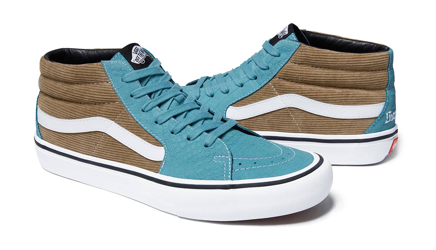 Supreme will be releasing new versions of the Vans Lampin and Sk8-Mid. Both shoes features premium croc embossed suede and 12-wale corduroy uppers with leather linings and insoles, vulcanized waffle outsoles and Supreme heel labels. The Lampin features a logo embroidered tongue while the Sk8-Mid features a logo embroidered heel.