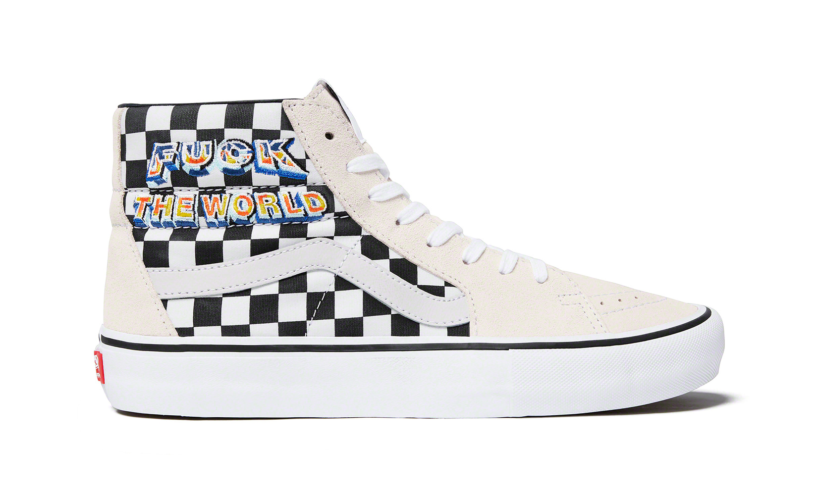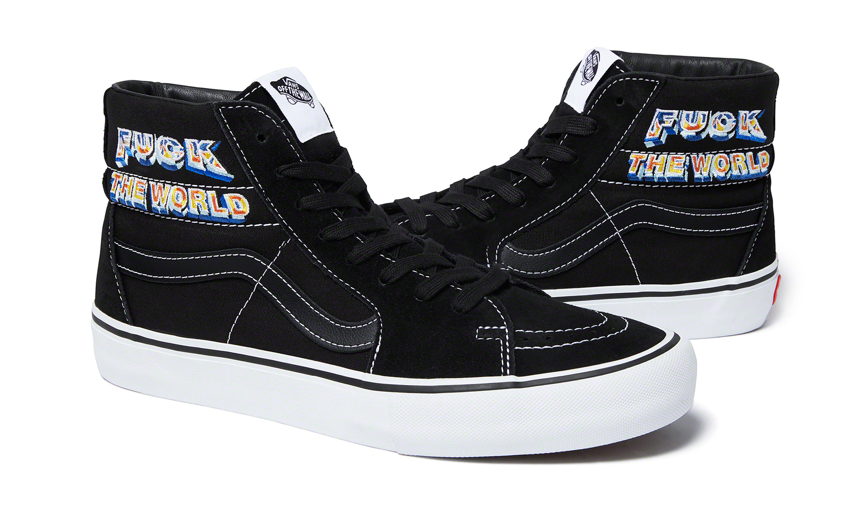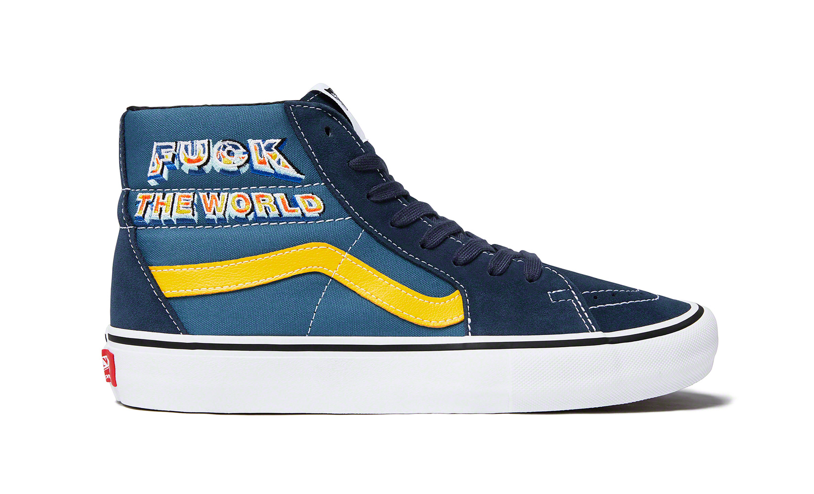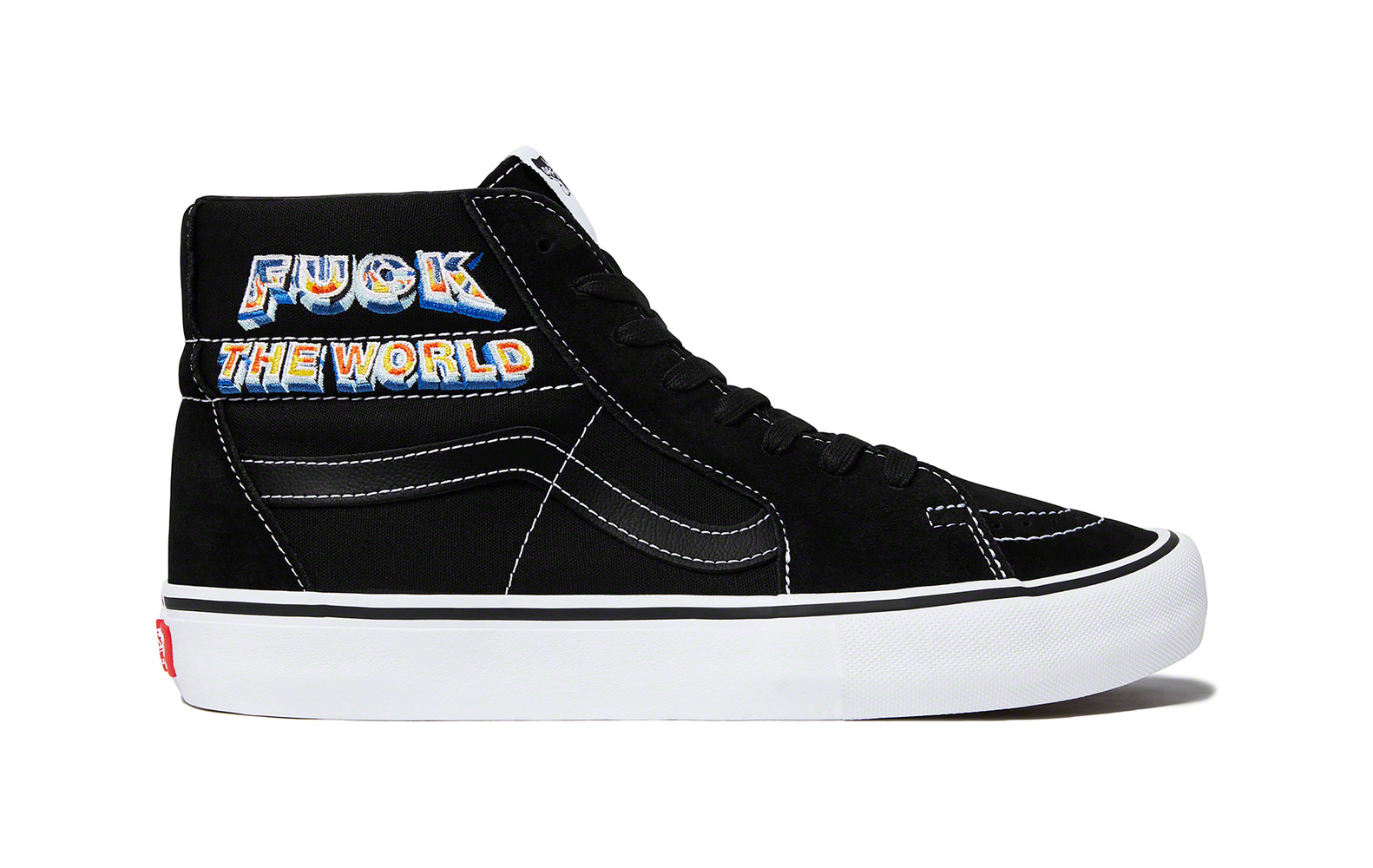 This fall, Supreme will release a new version of the Vans® Sk8-Hi Pro. The shoe features a premium suede and canvas upper with embroidered graphic, leather lining and vulcanized waffle outsole.