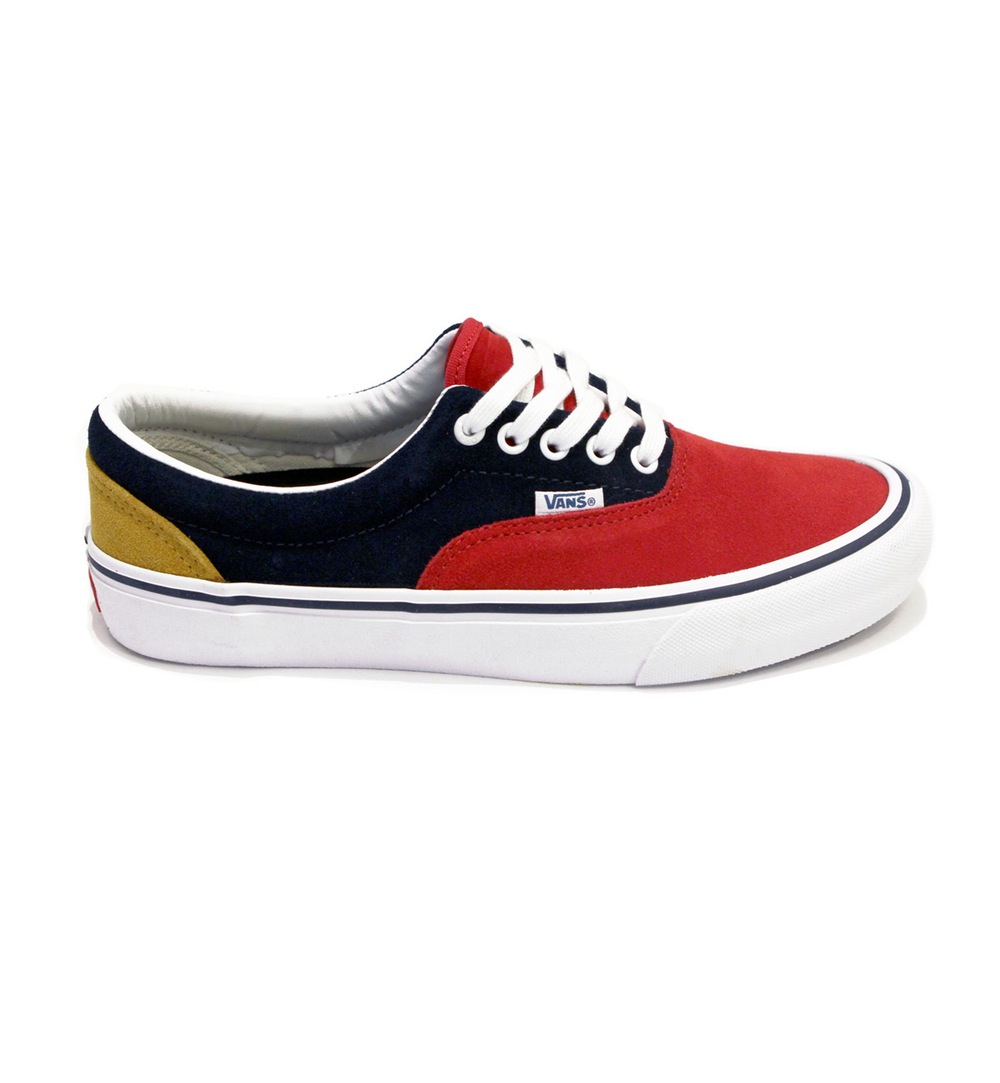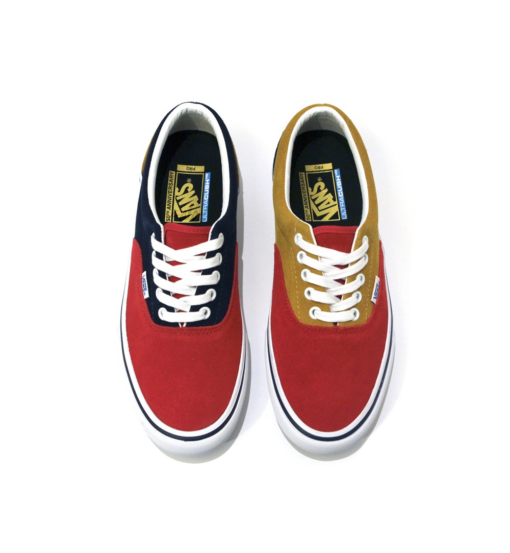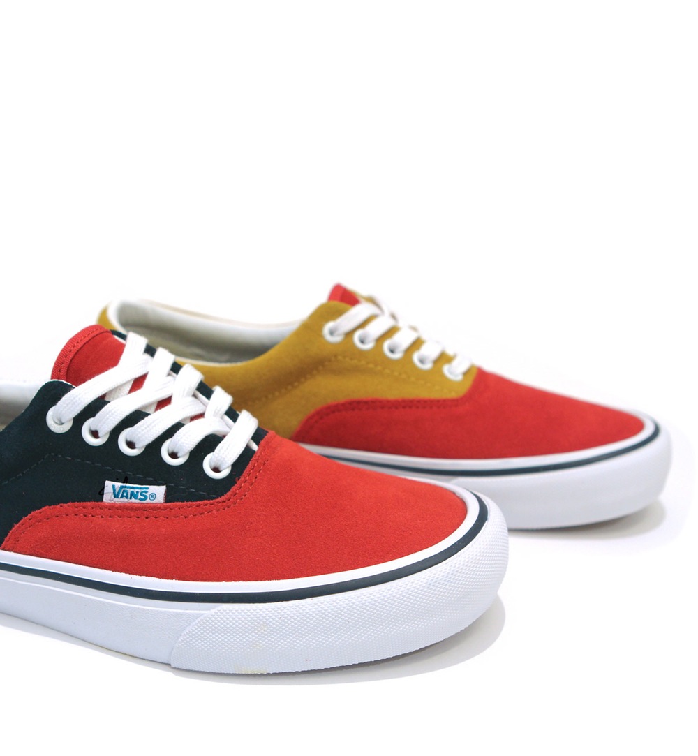 Here’s a nice surprise. It appears that along with each release of 50th Anniversary Pro models, there will be a more limited edition shoe releasing only at your core skate shops. Pretty much those same shops that carried Vans Syndicate. The first shoe being offered up is an Era Pro, with the same 50th Anniversary labeling, representing 1976, in a red suede toe and tongue, but in a mismatched yellow/navy back half of each shoe. Very interesting, and unique. Silo, as well as your other local former Syndicate carriers should be getting these this Saturday.