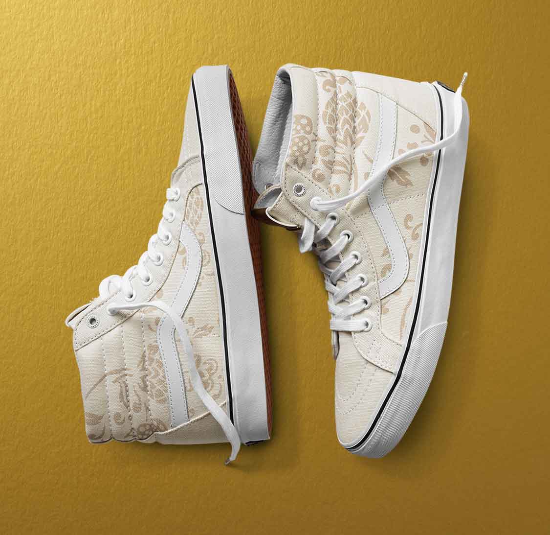 In a continued celebration of its 50-year anniversary, Vans releases the Gold pack to further commemorate the momentous milestone of “Off The Wall” heritage. With an aesthetic inspired by its golden year, Vans presents a collection of footwear and apparel that features gold embellishments and archived prints to honor its design legacy. This robust 22-piece assortment includes iconic Vans silhouettes such as the Authentic, Classic Slip-On, Era 59, Old Skool and Sk8-Hi Reissue alongside a deluxe range of hoodies, hats, bags and tees.