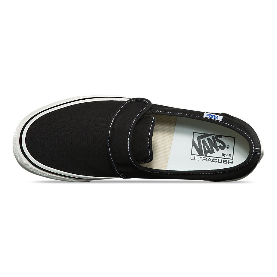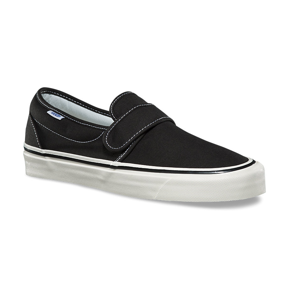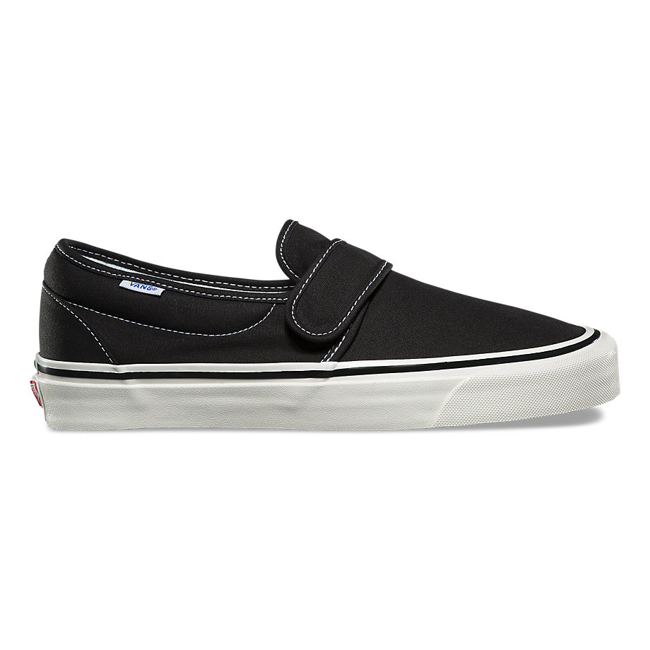 “The Anaheim Factory Slip-On 47 V DX pays tribute to our first Vans factory in Anaheim, California, by borrowing details from the original Classic Slip-On and offering modernized comfort with upgraded UltraCush sockliners. The Anaheim Factory Slip-On 47 V DX also includes throwback details, higher glossed foxing tape, original drill lining weight, and textile uppers with a hook-and-loop closure to complete the look.”