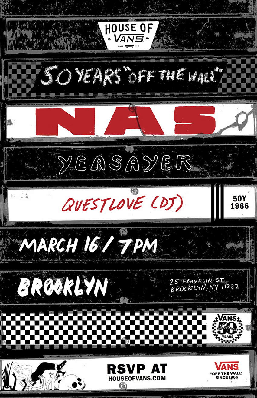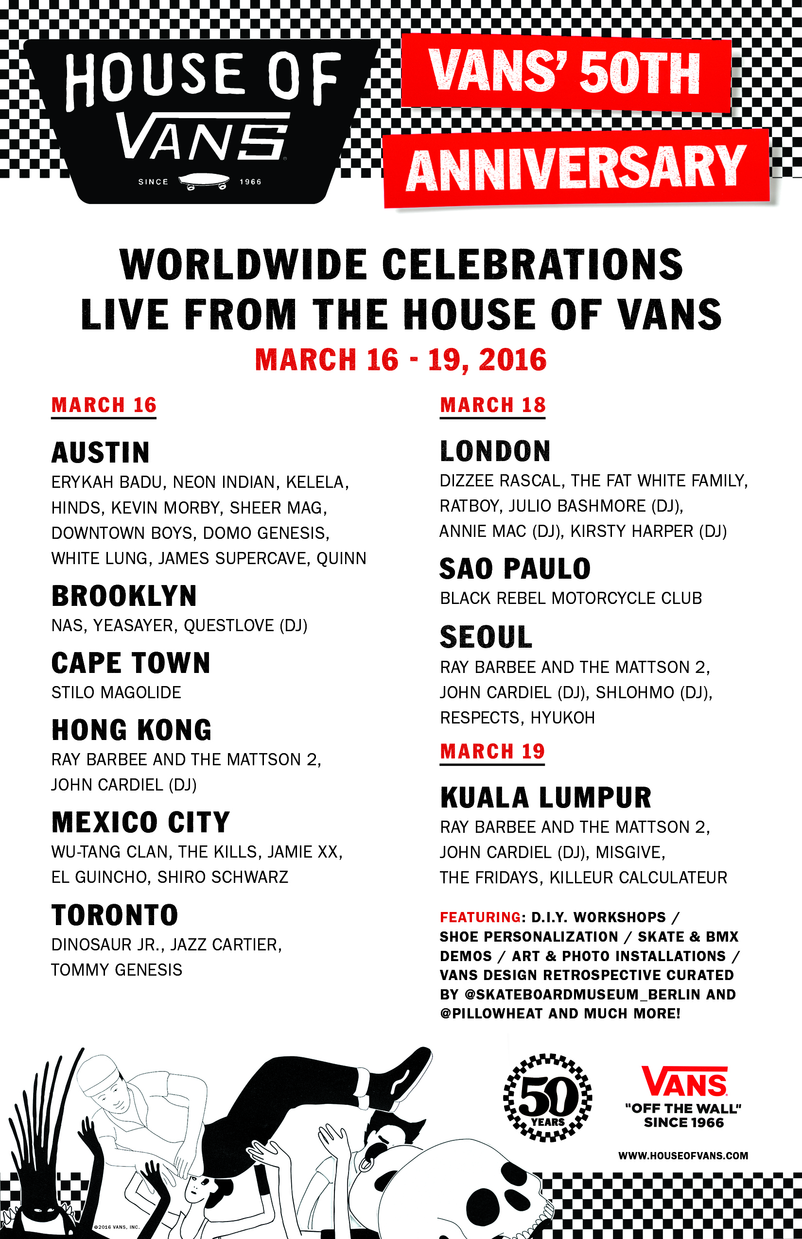 On March 16, 2016, Vans brings together 50 years of “Off The Wall” heritage in action sports, art, music and street culture for a worldwide celebration of creative expression at the House of Vans. Vans’ legacy will be brought to life in ten cities across the globe to celebrate its 50th anniversary alongside the extended Vans family that have made the brand what it is today. From New York to London to Hong Kong, Vans is thrilled to welcome a mix of eclectic performers including Nas, Dinosaur Jr., Wu-Tang Clan, The Kills, Erykah Badu, Jamie xx, Dizzee Rascal, Yeasayer, Shlohmo and more, within an immersive brand environment specially created for Vans’ anniversary year. Additionally, guests at every location will be welcomed to participate in a range of workshops for a hands-on experience that is truly Vans.