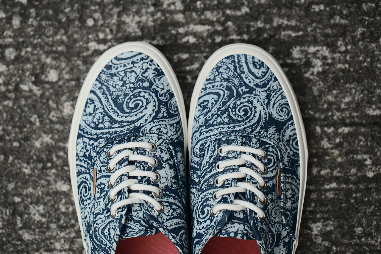 “Vans California presents the Authentic “Paisley” pack for Fall 2013. For this release, the Vans Authentic silhouette is featured in two paisley-based colorways: blue and green. The blue colorway features a blue canvas base with a light blue, all-over paisley print; inside is a bold red lining which mimics the color of the shoes outsole. The green colorway sports a green canvas base with a light green, all-over paisley print and a lime green lining with echoes the color used for the outsole. Both colorways feature metal eyelets, rope laces and vulcanized rubber soles. Look for the “Paisley” pack at select Vans California stockists now.”