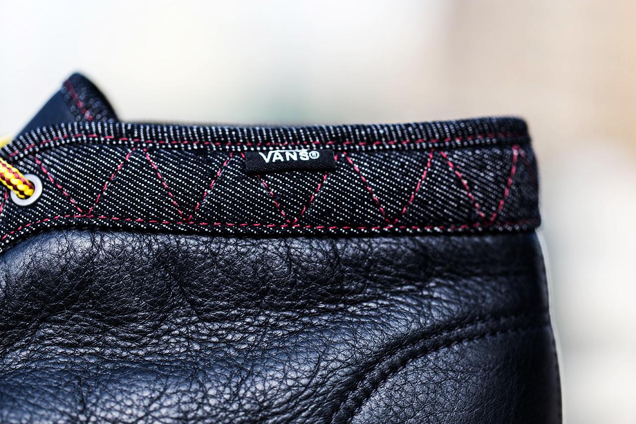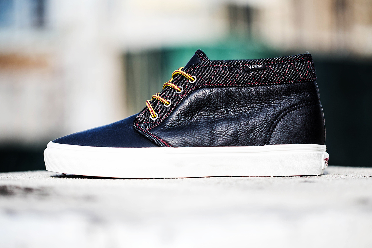 “Vans California adds to its 2013 holiday collection offerings by bringing back the Chukka Boot CA in a classy mix of denim and leather. Combining two different textures of chocolate-brown leather — smooth pebbled on the front and heel and weathered on the sides — the boot is finished with indigo blue denim running along the lace closure, collar and tip of the tongue. Helping to unite the denim-on-leather look are the thick yellow boot-style laces while the plain white rubber outsole with textured foxing helps to balance out this recognizable Vans release. The chukkas are kept cold weather-ready thanks to the special inner linings and gusseted tongue.”