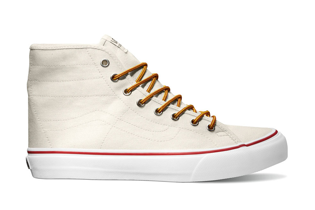 “Inspired by the classic Sk8-Hi, Vans and its California line have created the Sk8-Hi Binding CA for Spring 2013. Taking the silhouette of the original high-top and deconstructing it by stripping all padding and excess materials, Vans reinforced the kicks with a simple binding for a clean all-canvas aesthetic. Completed with rope laces, metal eyelets and intricate stitch detailing to retrace the Jazz Stripe and ribbed collar, the Vans California Sk8-Hi Binding CA is due for an official drop this March in Dress Blues, Marshmallow and Red colorways.”