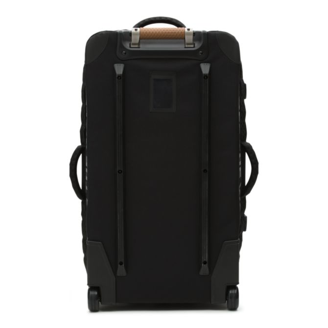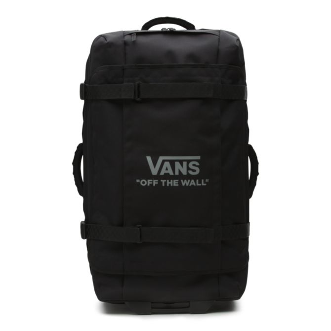 The Vans Check-In Luggage is a 100% polyester rolling duffle bag with a D-shaped opening, a zip divider that creates two packing compartments or opens to make one large compartment, and an extendable handle with a release button and a molded waffle grip. This bag is made with CORDURA® fabrics trims that are recognized for their long-lasting durability and resistance to abrasion, tearing, and scuffs. Featuring adjustable skate and compression straps, it also includes multiple exterior grab handles, exterior zipper pockets, interior zip mesh pockets, lockable zippers at the main compartments, and oversized skate-style wheels. Measuring 30″ L x 16″ W x 13″ D inches, it has a 96-liter capacity. This suitcase meets TSA size regulations.