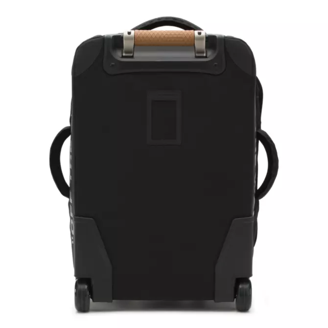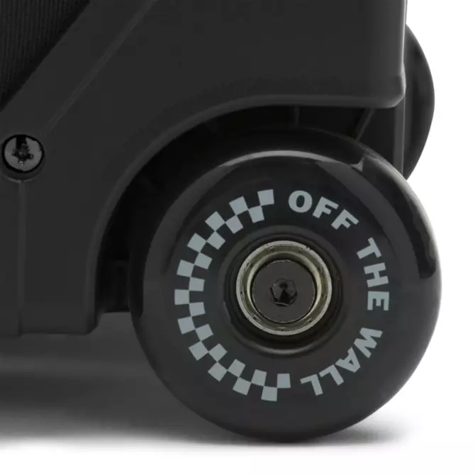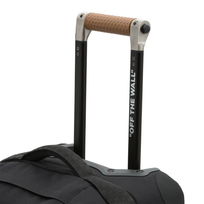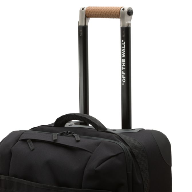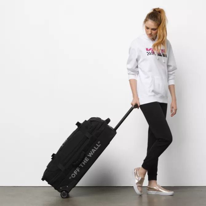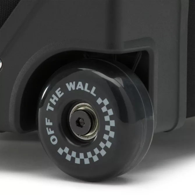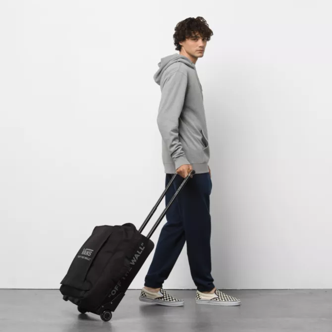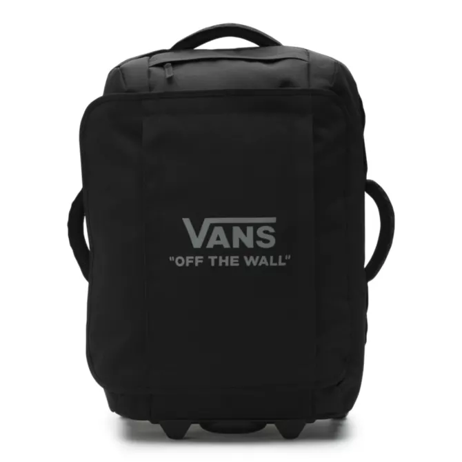 The Vans Carry-On Luggage is a 100% polyester rolling duffle bag with a D-shaped opening, lockable zippers at the main compartments, and an extendable handle with a release button and a molded waffle grip. This bag is made with CORDURA® fabric trims that are recognized for their long-lasting durability and resistance to abrasion, tearing, and scuffs. It also includes multiple exterior grab handles, exterior zipper pockets, interior zip mesh pockets, and oversized skate-style wheels. Measuring 22″ L x 13″ W x 8.5″ D inches, it has a 45-liter capacity. This suitcase meets TSA size regulations.