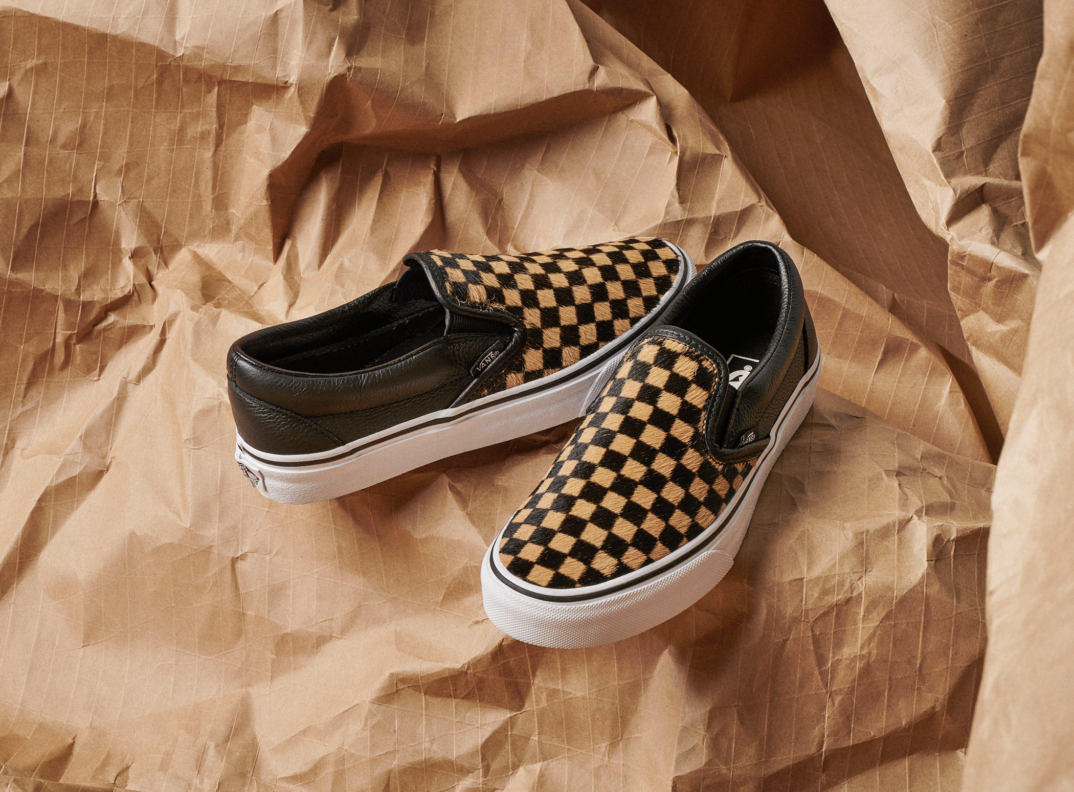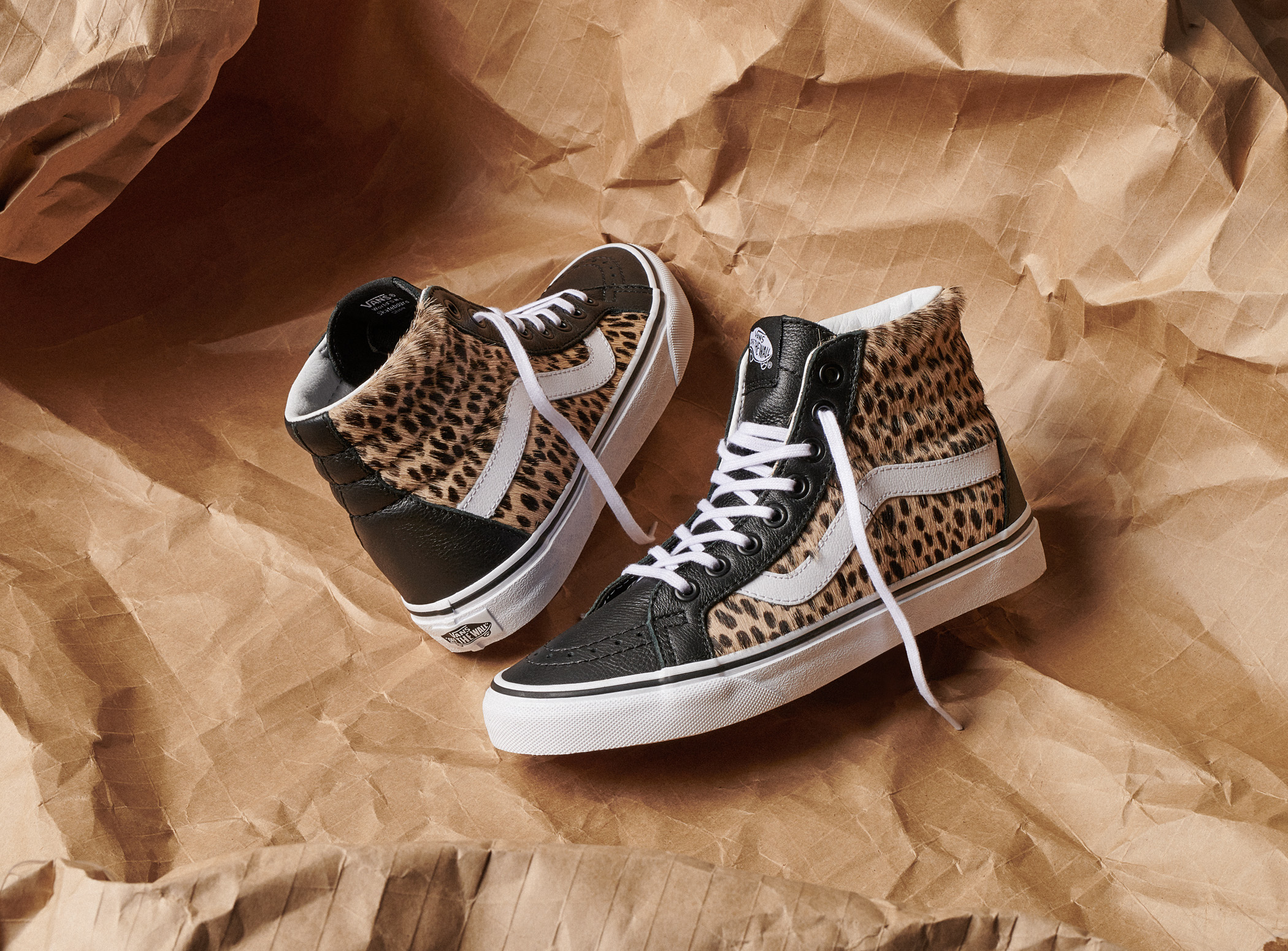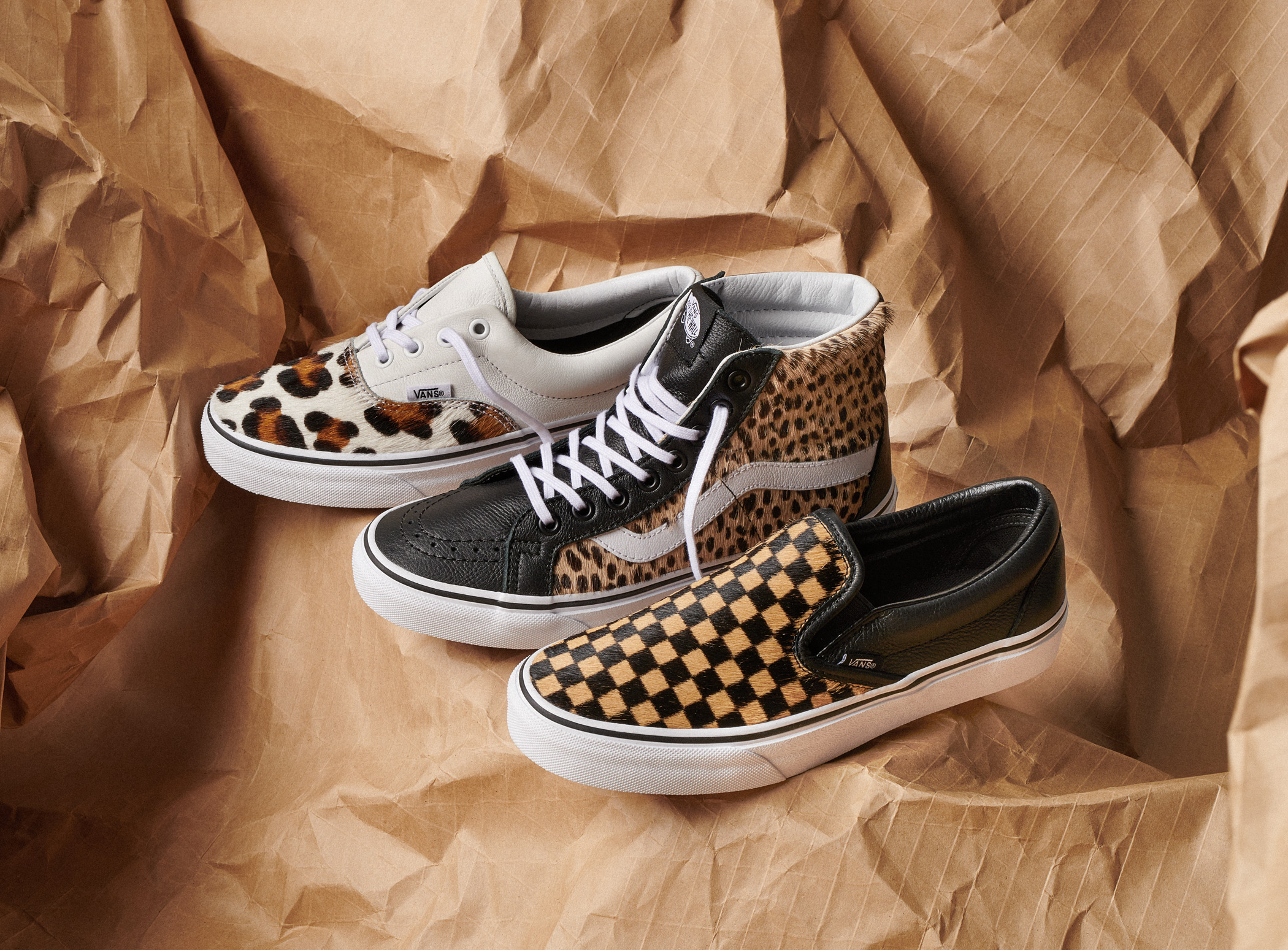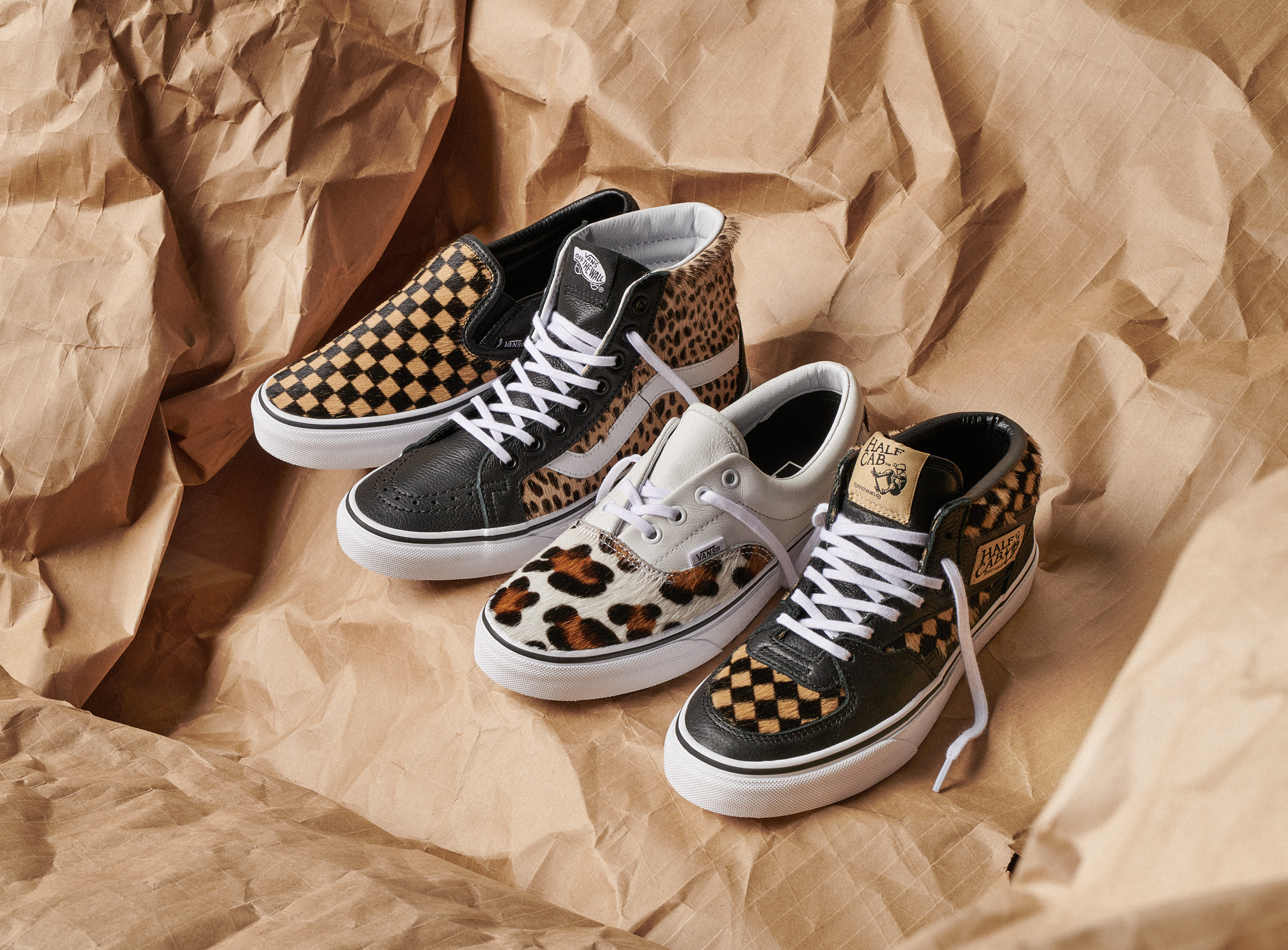Kicking off the assortment, the Sk8-Hi Reissue showcases cheetah-printed calf hair on the lateral side of the hi-top. The Sk8-Hi model is accented with black leather quarter-panels and is finished with white laces and a white leather Sidestripe. Vans’ first skate shoe, the Era undergoes a fashionable update with jaguar-printed calf hair across the heel and upper, accented with premium white leather. Vans’ very own checkerboard print has been remastered across the Half Cab and Classic Slip-On styles, giving a brand-new take on one of Vans’ most iconic prints.”