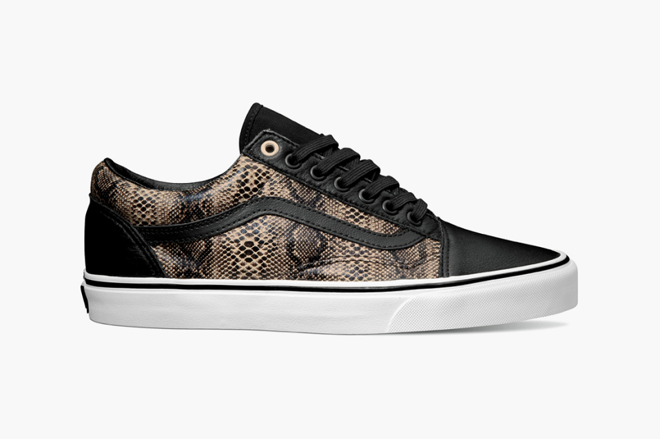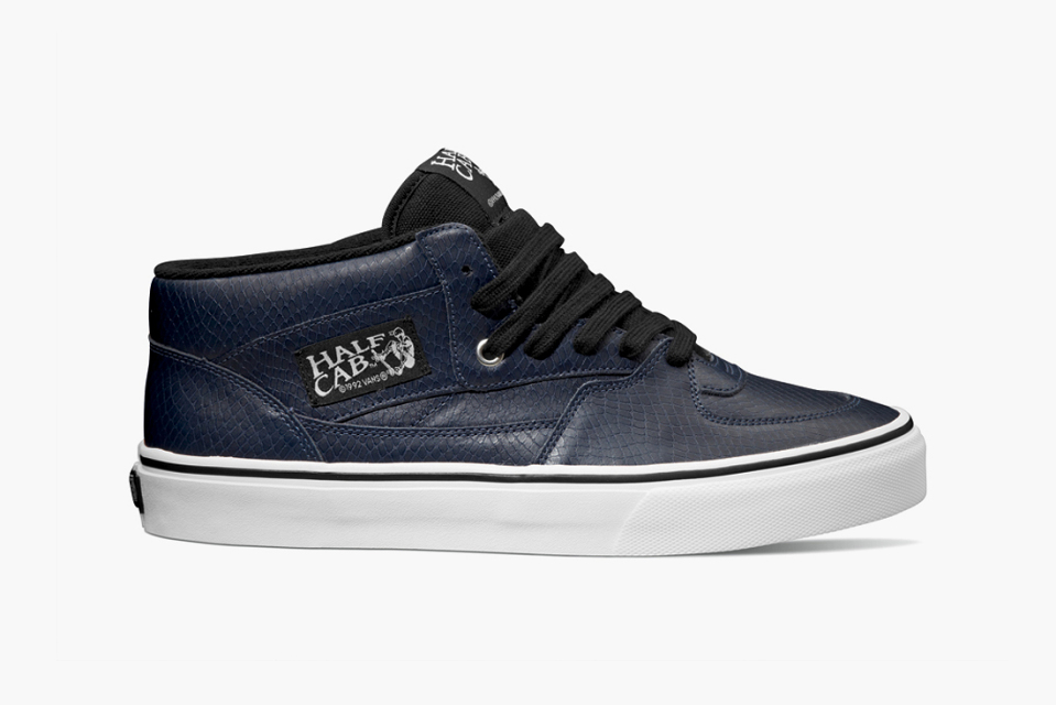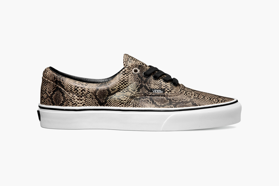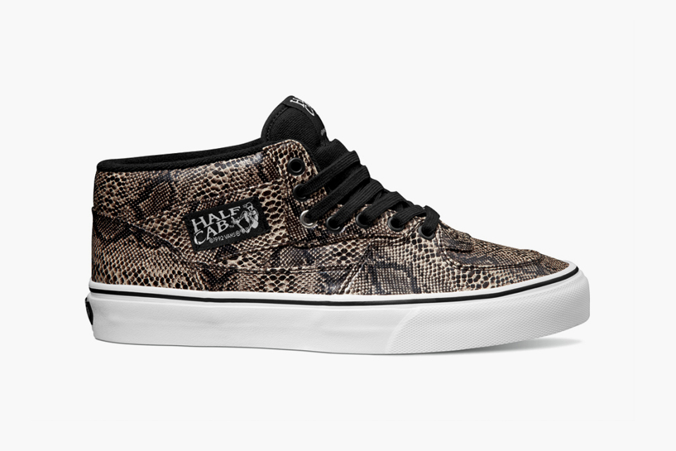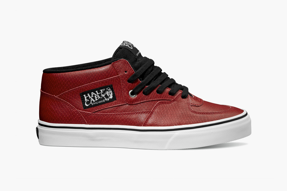 “The forthcoming season of Vans Classics revisits the forms of the Era, Old Skool and Half Cab for a five-piece set of snake colorways. Steve Caballero’s signature mid-top, the Half Cab, dominates the pack with a trio of styles in the range. Outfitted in embossed reptile-styled uppers and paired with a padded tongue, the Half Cab presents tonal red and eclipse colorways alongside a mixed khaki/brown offering. The mixed scale materials extend to the low-top portion of the collection with allover coverage of the Era and quarter panel detailing on the Old Skool. Clean white midsole finish and vulcanized waffle outsoles put the finishing touches on the assortment. The Vans Classics Fall 2014 “Snake” pack is now available at select Vans retailers.”