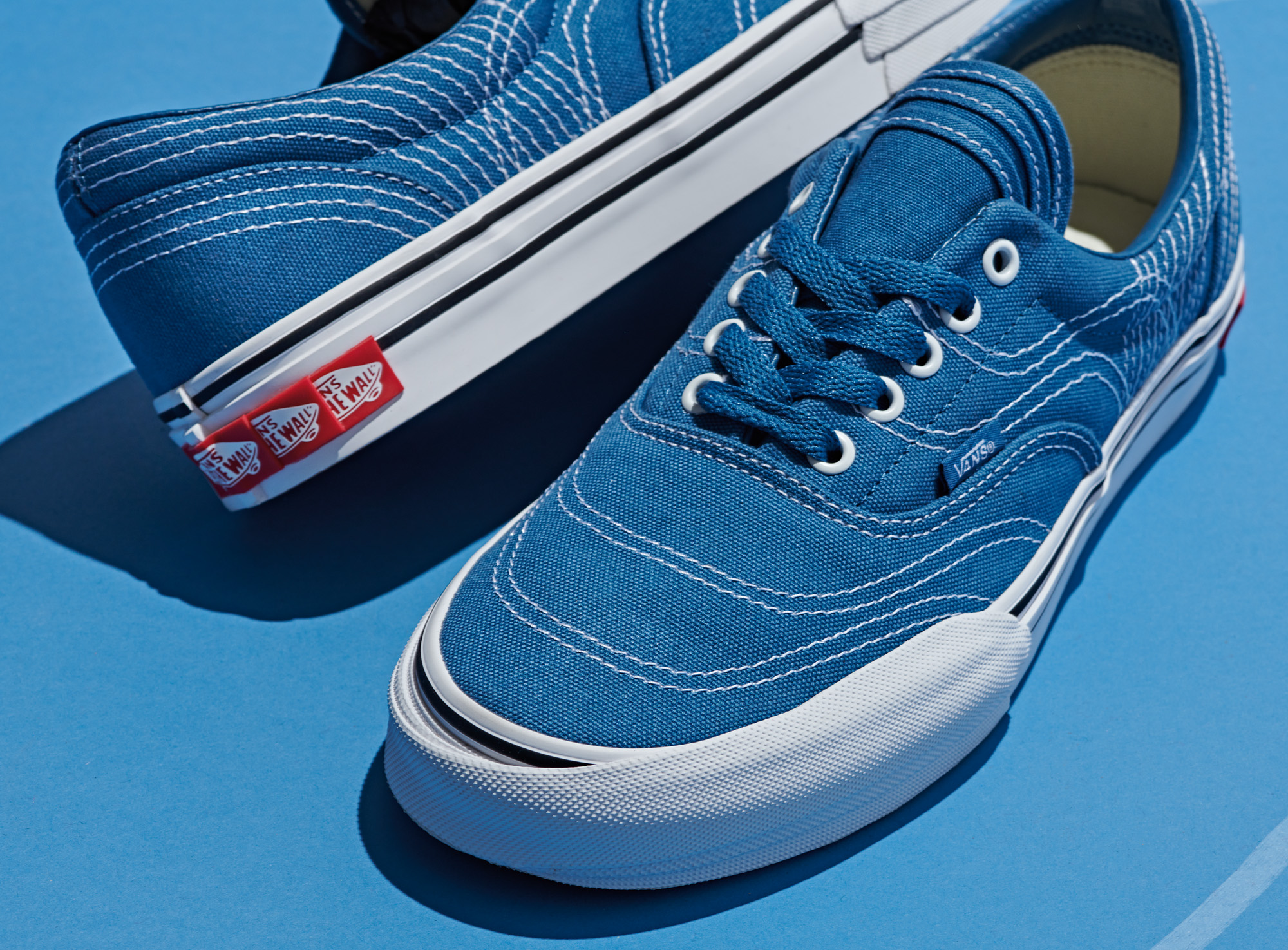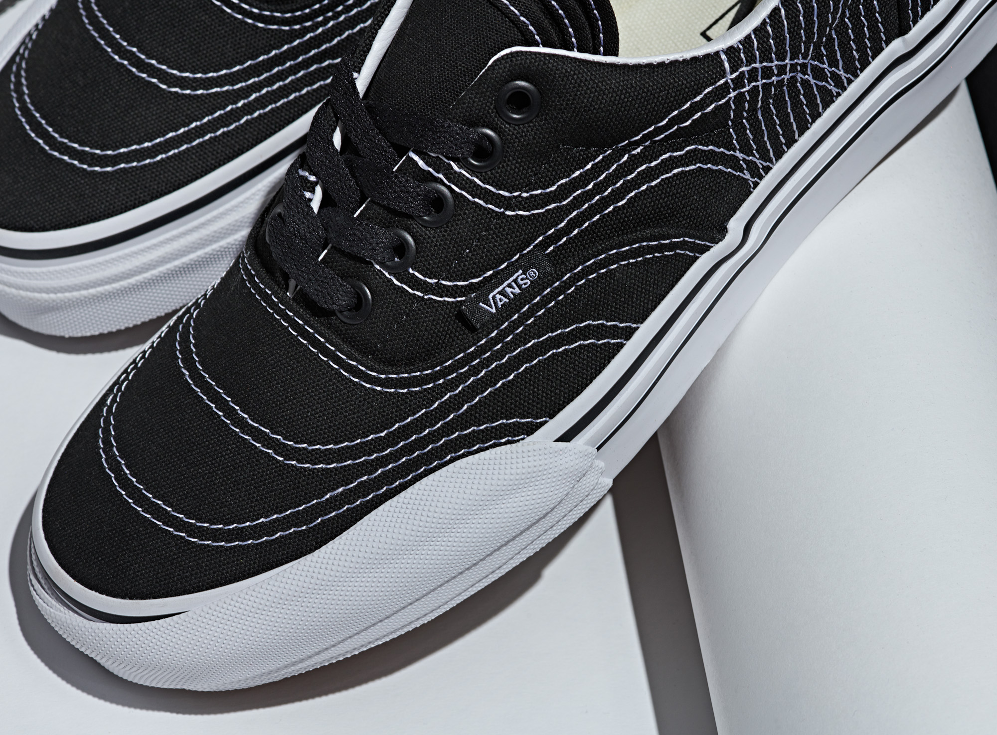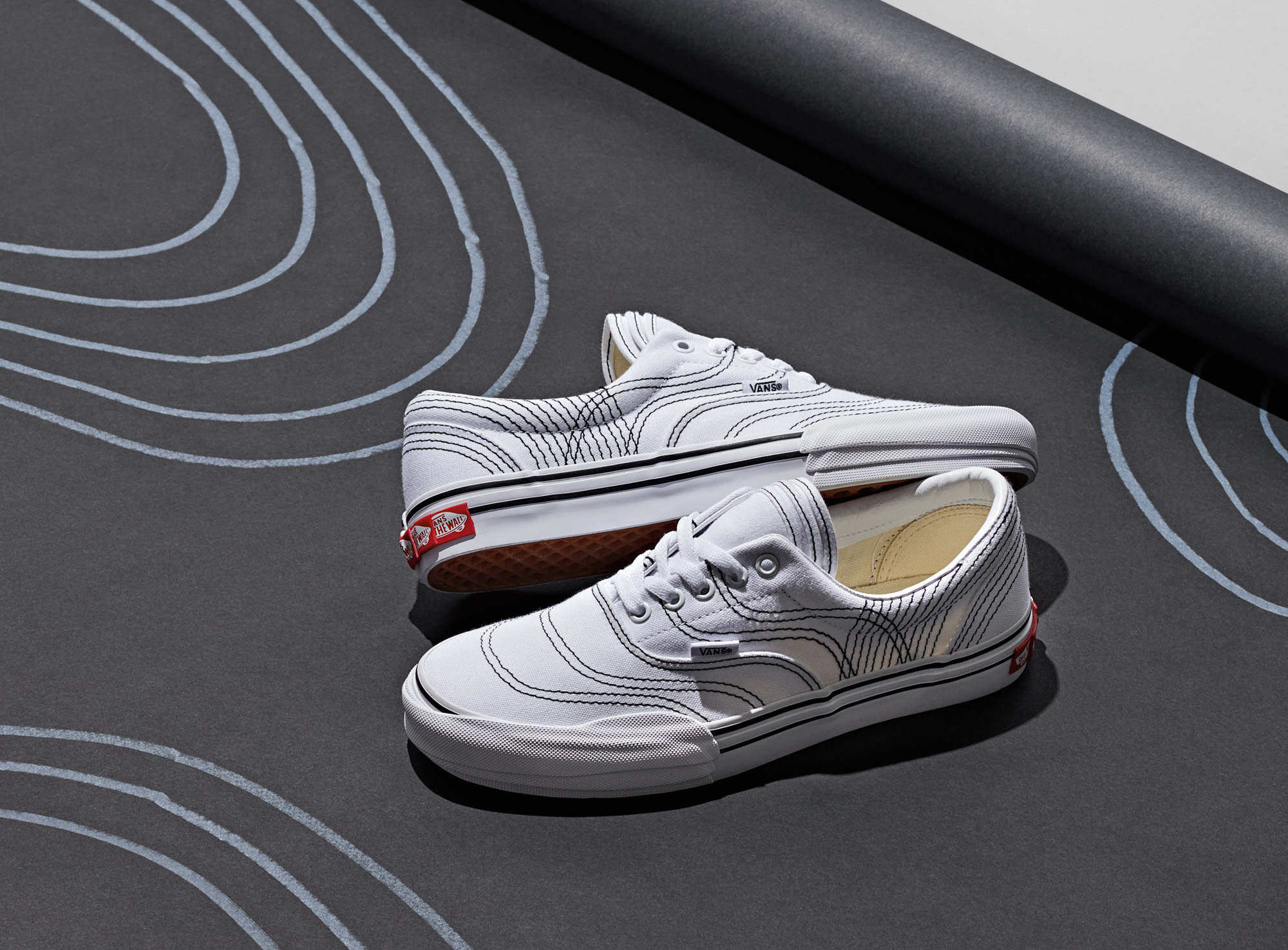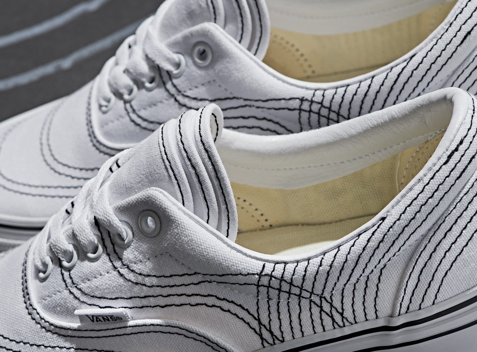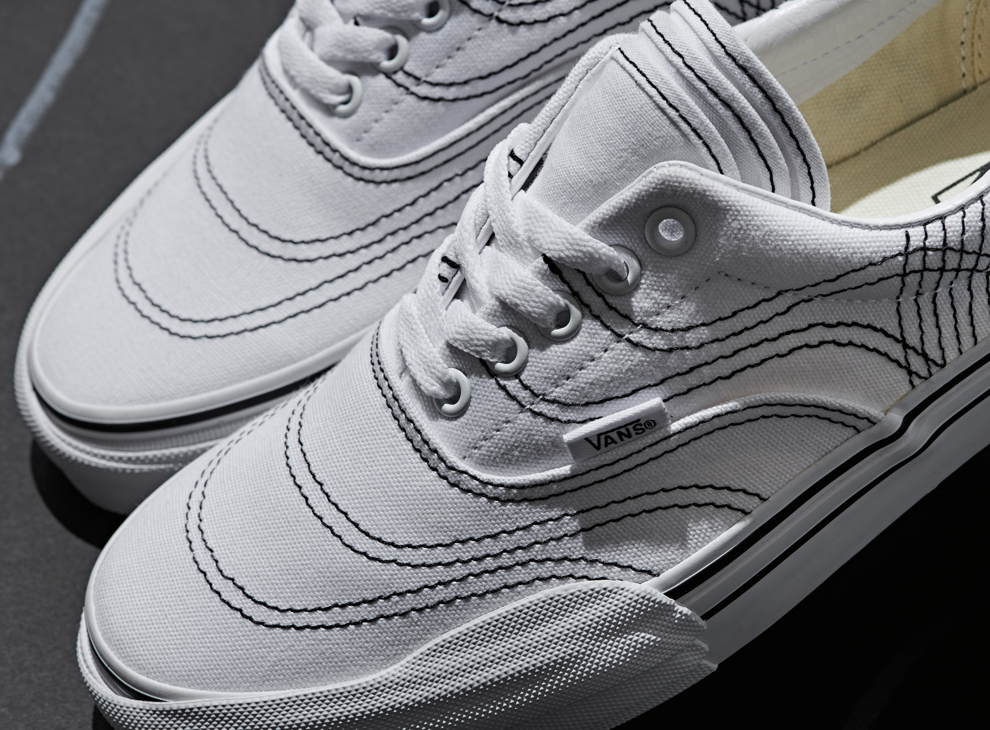 The design process begins with Vans original construction of the navy Era which are marked by stitching at each intersecting panel. Every original stitching placement extends and transforms the canvas of the Era with multiplied deco stitching. The tongue is layered with three executions – one atop another. The Era 3RA continues with three layered foxing stipes, toe bumpers and three heel scabs. The Era 3RA will be available in three colorways including navy, black and true white.