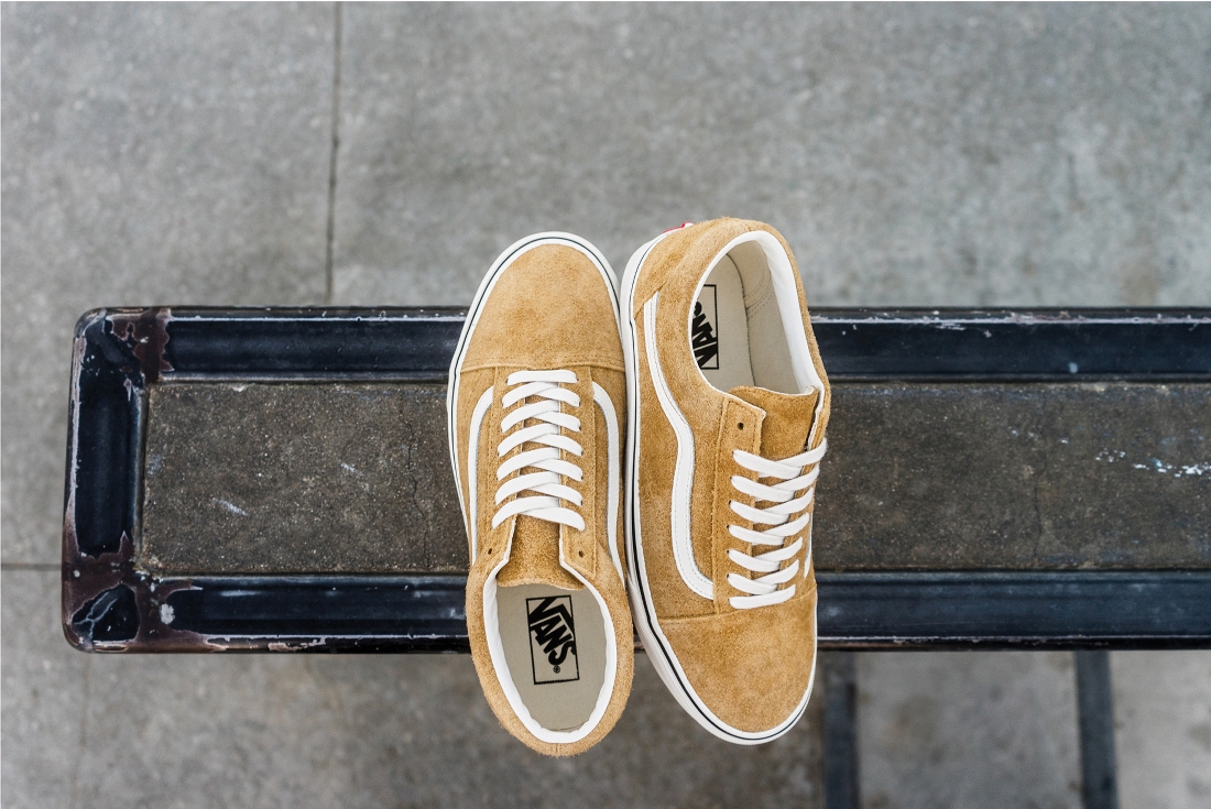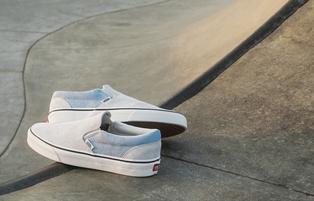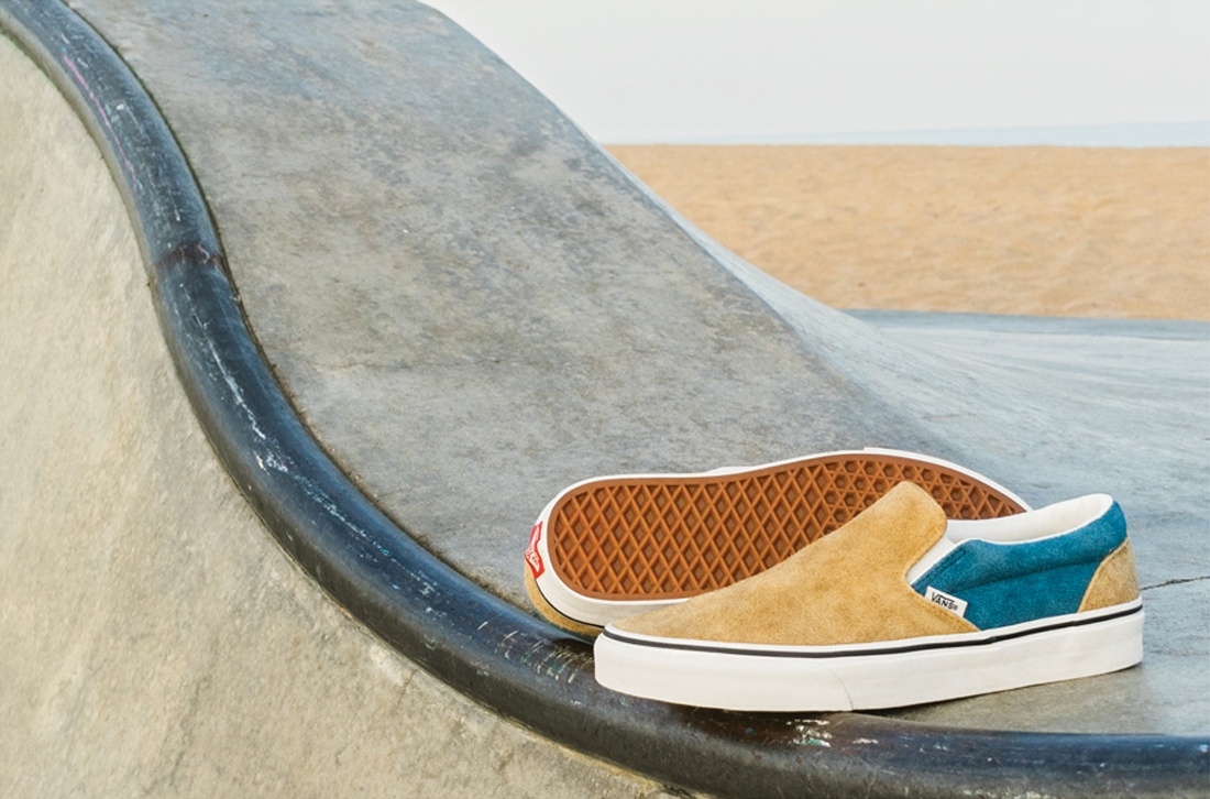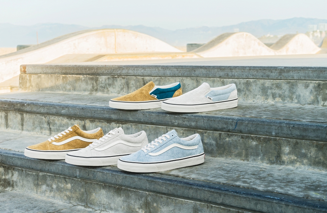The fuzzy suede adds a textured look and feel to the Old Skool and Classic Slip-On. The Old Skool is available in three retro-inspired colorways including medal bronze, birch and ballad blue all which have been resurged from the Vans archives. Each Old Skool is finished with cotton laces, a marshmallow outsole and white suede Sidestripe. Two Classic Slip-On executions are color-blocked to showcase matching vamp and heel panels that are accented by blue quarter panels.”
