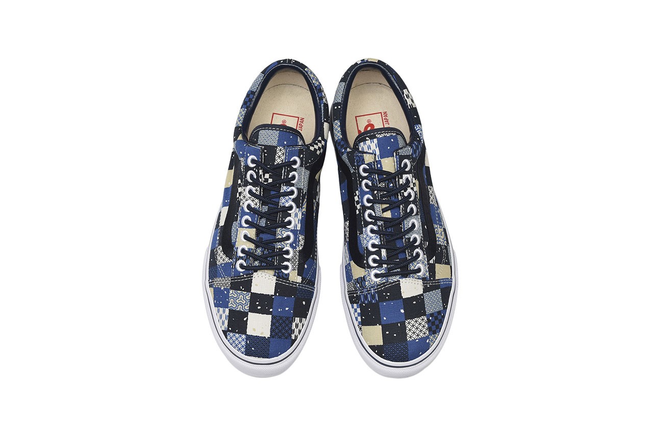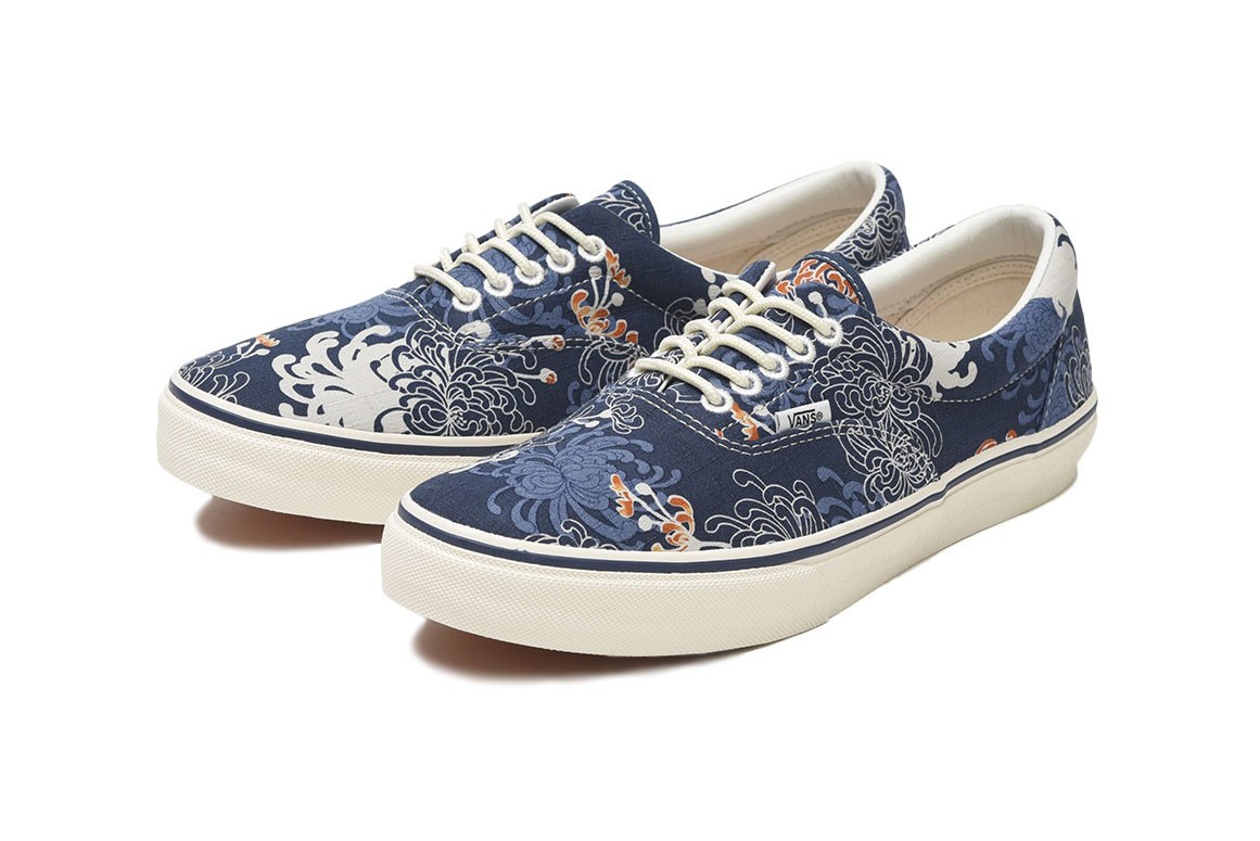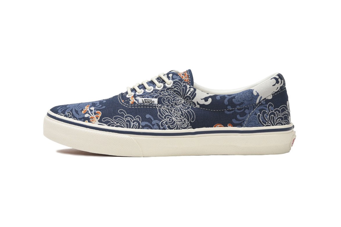 Vans’ Old Skool is tweaked with an “Ichimatsu” pattern, so-named for an Edo-era pattern that was used to create kimono and accessories. Here, the technique is rendered as a checkerboard-style pattern, and printed upon lightweight cotton tissue. Meanwhile, the Era sports a Spider Chrysanthemum-inspired jacquard print (“Rangiku”), with indigo and red tones mingling upon a slubby cotton upper. Finally, the humble Slip-On gets graphic with a jacquard goldfish (“Kingyo”) pattern — the elegant fish flows across a sturdy cotton fabric known as “shantung,” most commonly used for curtains in current-day Japan.