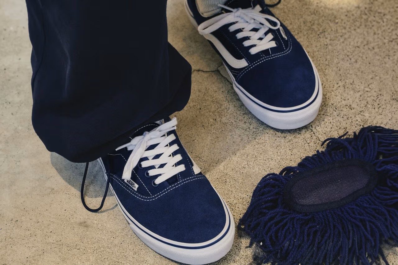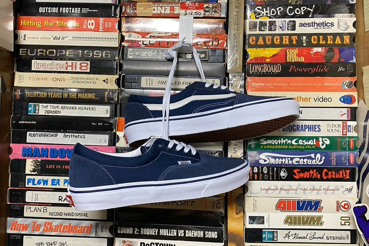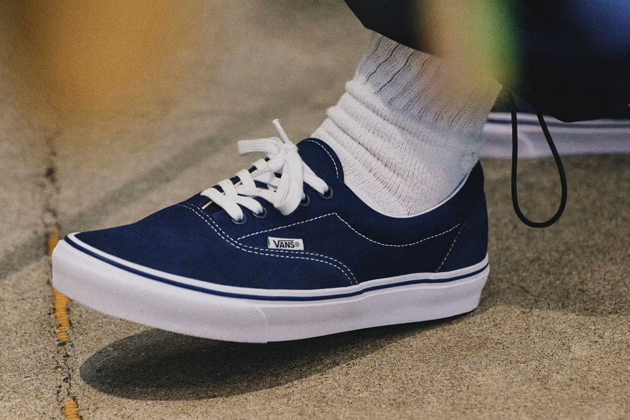 The sneaker combines the design of both iconic models, envisioning a hybrid silhouette dipped in a navy hue and accented with white detailing. On the lateral side of the silhouette, the sneaker resembles a classic Vans Era, with white stitching and a signature Vans tag. As for the medial side, this is where the Old Skool comes in, boasting the Old Skool’s signature side striping.