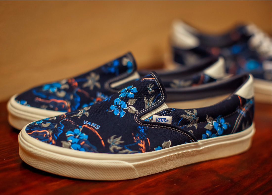 The set will both boast a navy aloha “Off the Wall” motif printed uppers. Both will also sit upon a stripeless midsole and have white leather detailing on the heels.