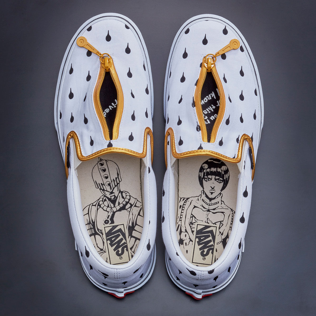 The Slip-On is understated in comparison, seeing a clean black-on-white upper with metallic gold trimming. Featuring a standout vamp zip compartment which reveals quotes from the characters, the pair again features the lateral midsole tab and opt for a white sole unit.