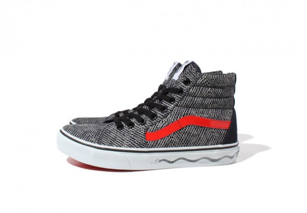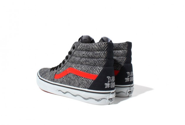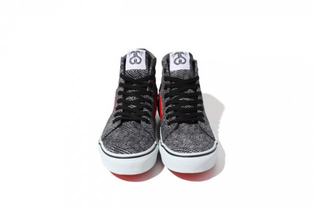 Vans Japan has teamed up with Stussy on this dope looking Sk8-Hi to commemorate this being the year of the snake. Covered in an all-over snakescale print, with red jazz stripe, and a snake graphic on the sidewall of the vulc sole. These are finished off nicely, with an embroidered title on the heel panel, in the signature Stussy font, saying “YEAR OF THE SNAKE”. It’s been a long time since Vans USA has collaborated with Stussy, in fact it was over 10 years ago! Come on Vans! Hook up the stateside peeps!!! Available in Japan, sometime this year.