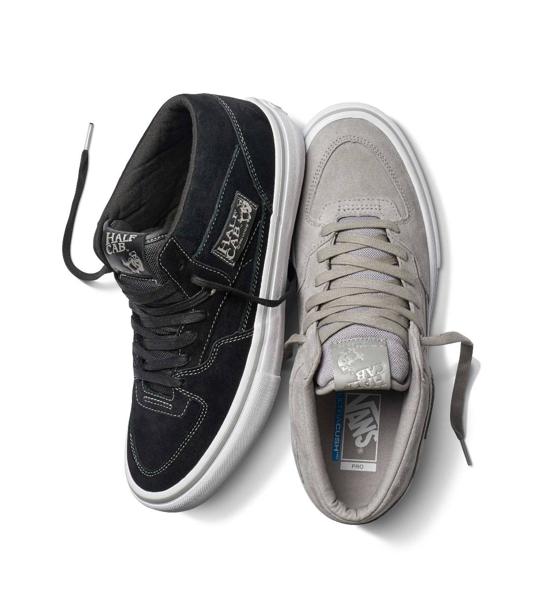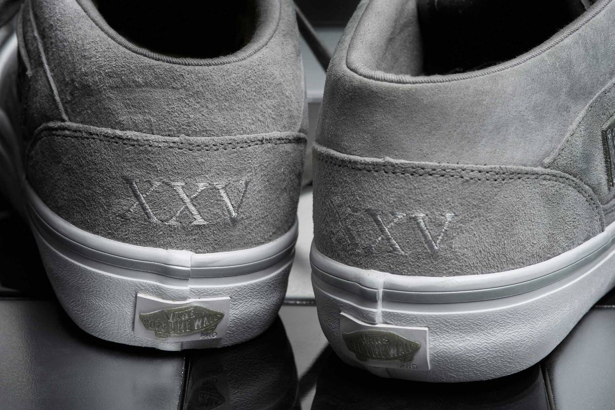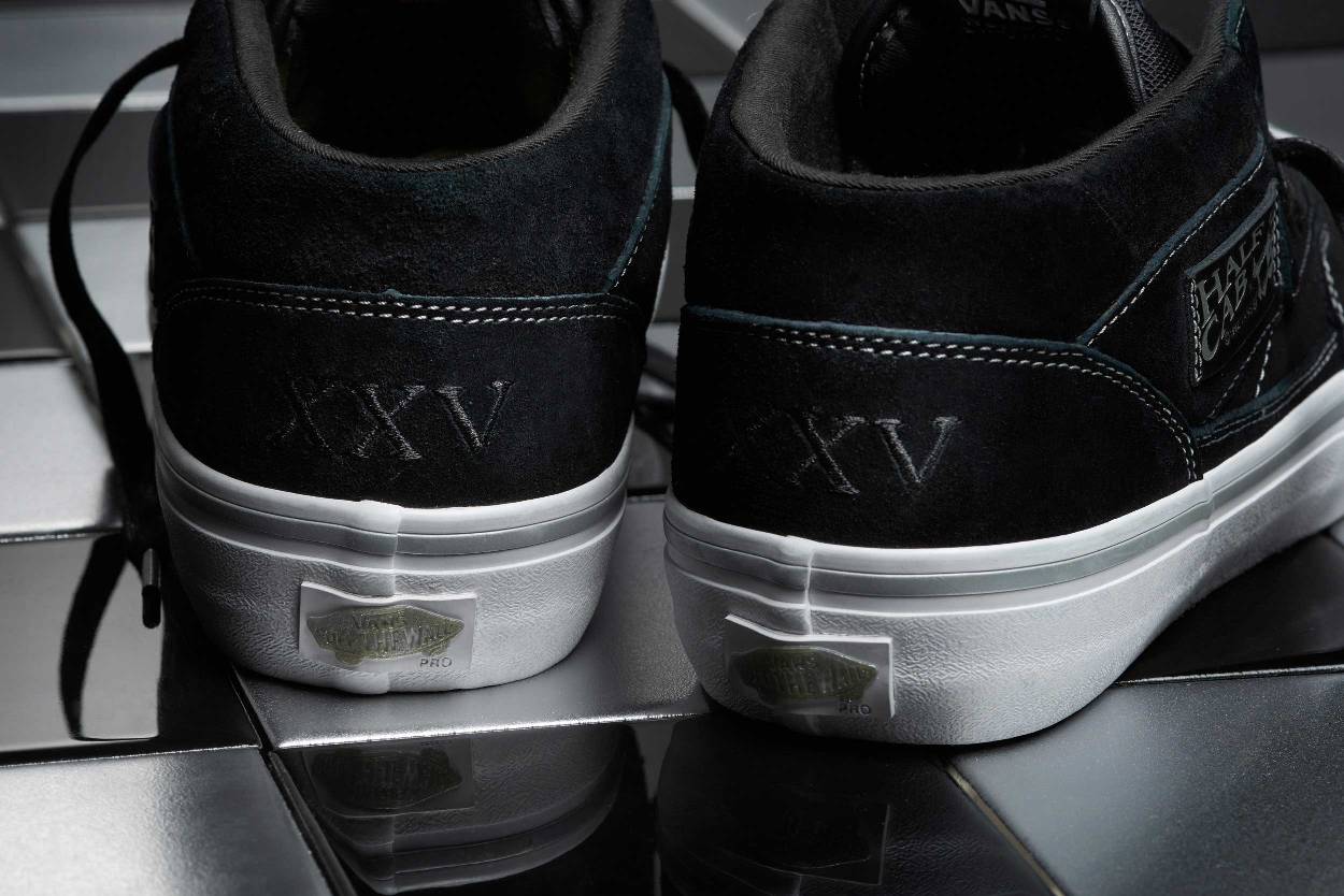 Highlighting premium pig suede uppers, metallic silver details, and a tonal embroidered “XXV” on the back heel for a commemorative touch, the 25th Anniversary Vans Half Cab is equipped with Vans Pro Skate’s signature Pro Classics performance innovation, featuring supportive ULTRACUSH HD sockliners for resilient cushioning and advanced comfort, and DURACAP reinforced underlays in high abrasion areas for premium durability and consistent fit.”