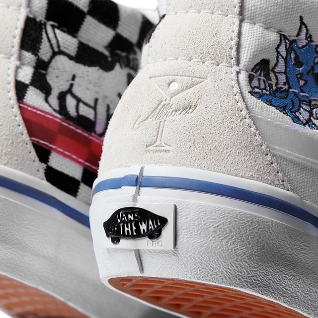 Available in yellow and blue colorways, the Sk8-Mid Pro LTD sneakers sport checkerboard jacquard panels, asymmetrical designs and embroidered depictions of the dog mascot on each inner ankle. A translucent side stripe informs the medial sides, creating the illusion that the shoe’s pattern is viewed through Alltimers’ martini glass logo. The plain canvas panels on the lateral side of each shoe are embroidered with the endearing dragon character. Staying true to Vans’ quality craftsmanship, the shoes feature UltraCush HD sockliners, vulcanized rubber outsoles and premium suede overlays.