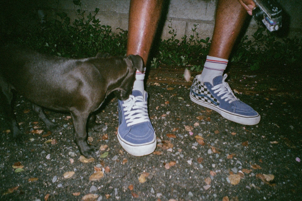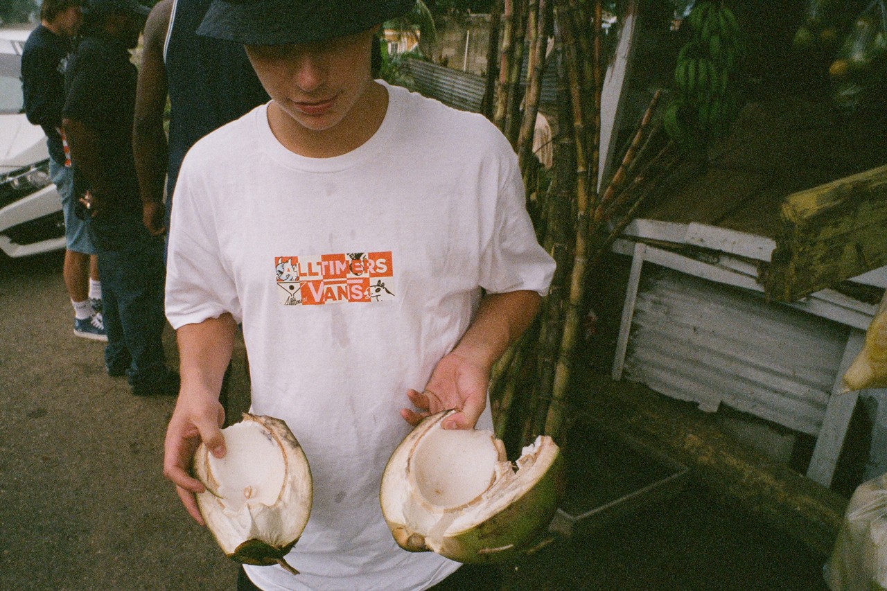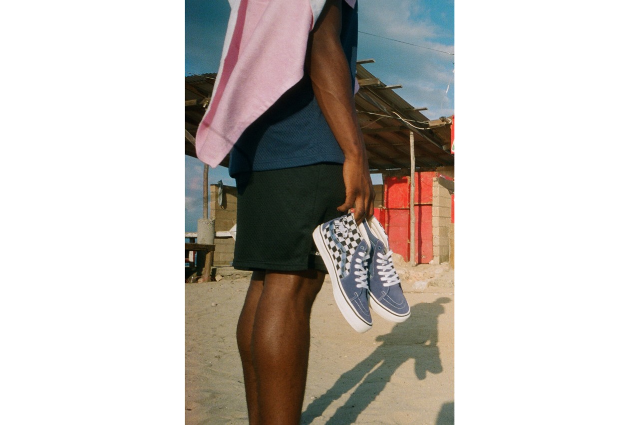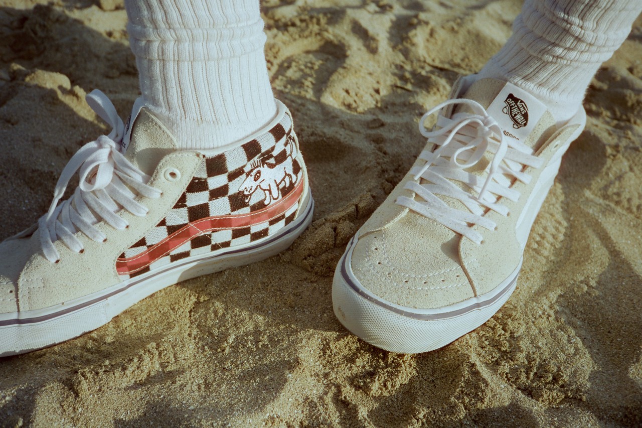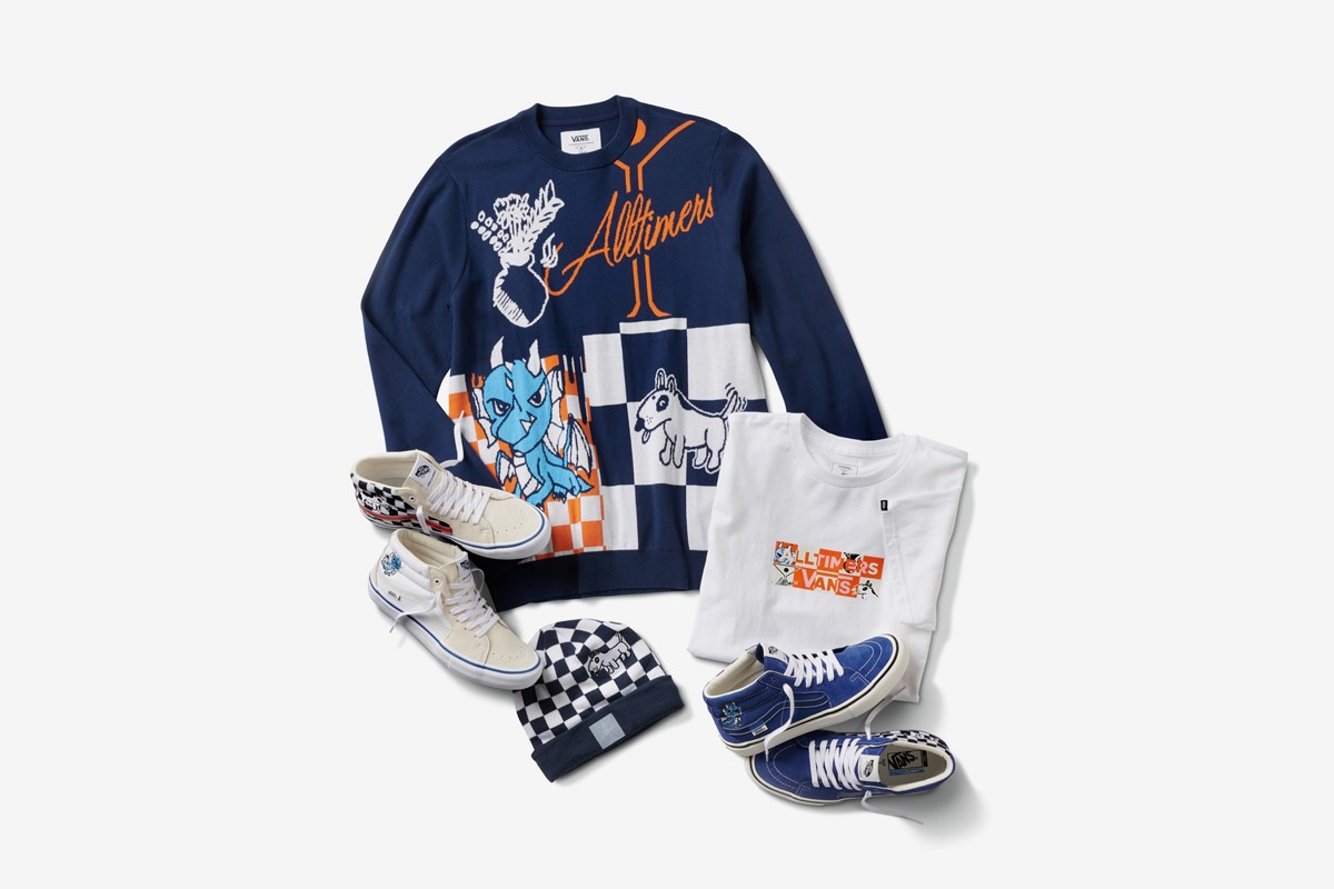 The apparel selection draws from, and unites, the various characters, logos and prints found throughout the collection. A lightweight jacquard sweater and white T-shirt feature both cartoon characters, Alltimers’ martini glass and Vans’ signature checkerboard print in a playful design. A custom beanie sports the dog and dragon character on either side, while a translucent patch adorns the cuff.