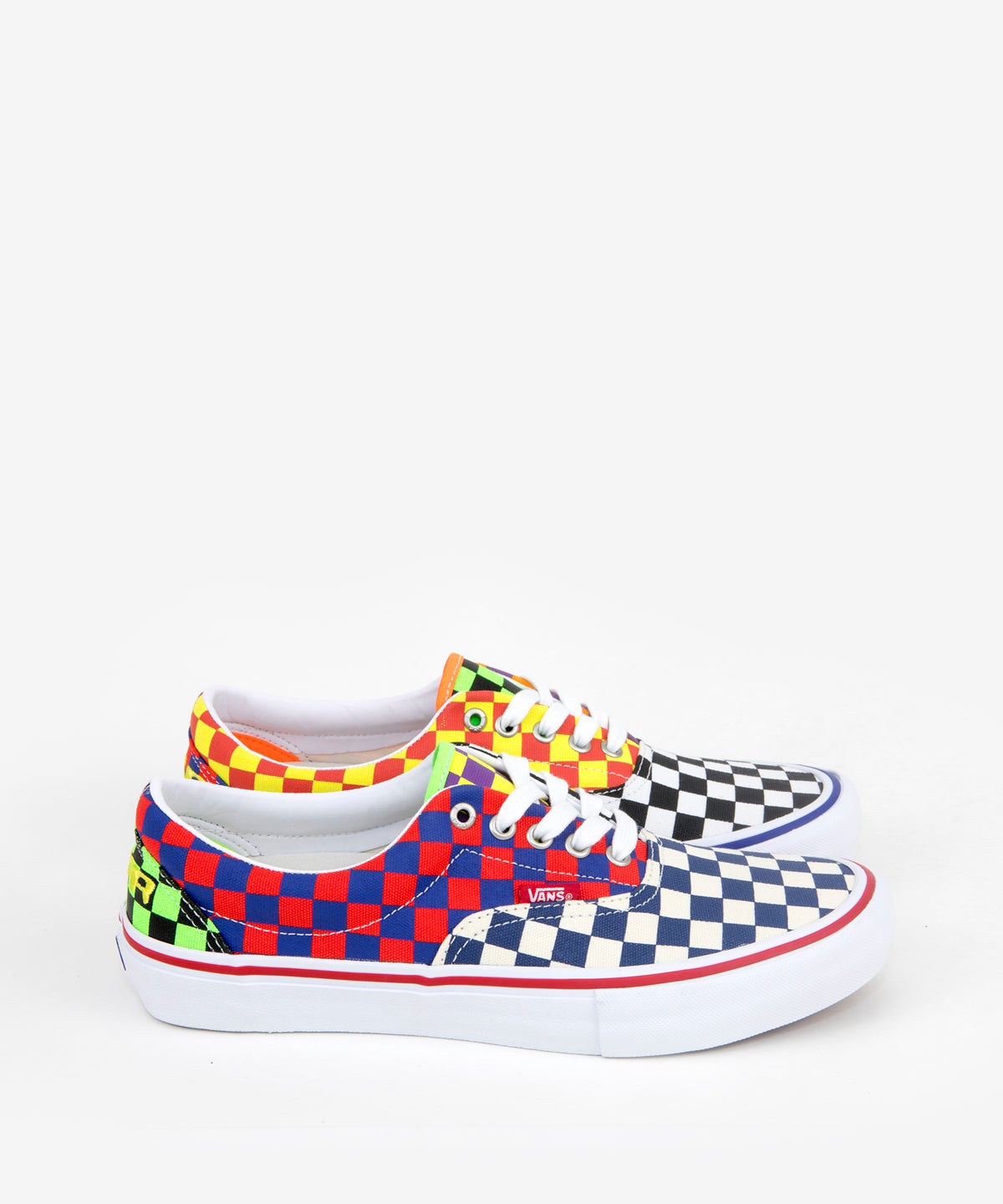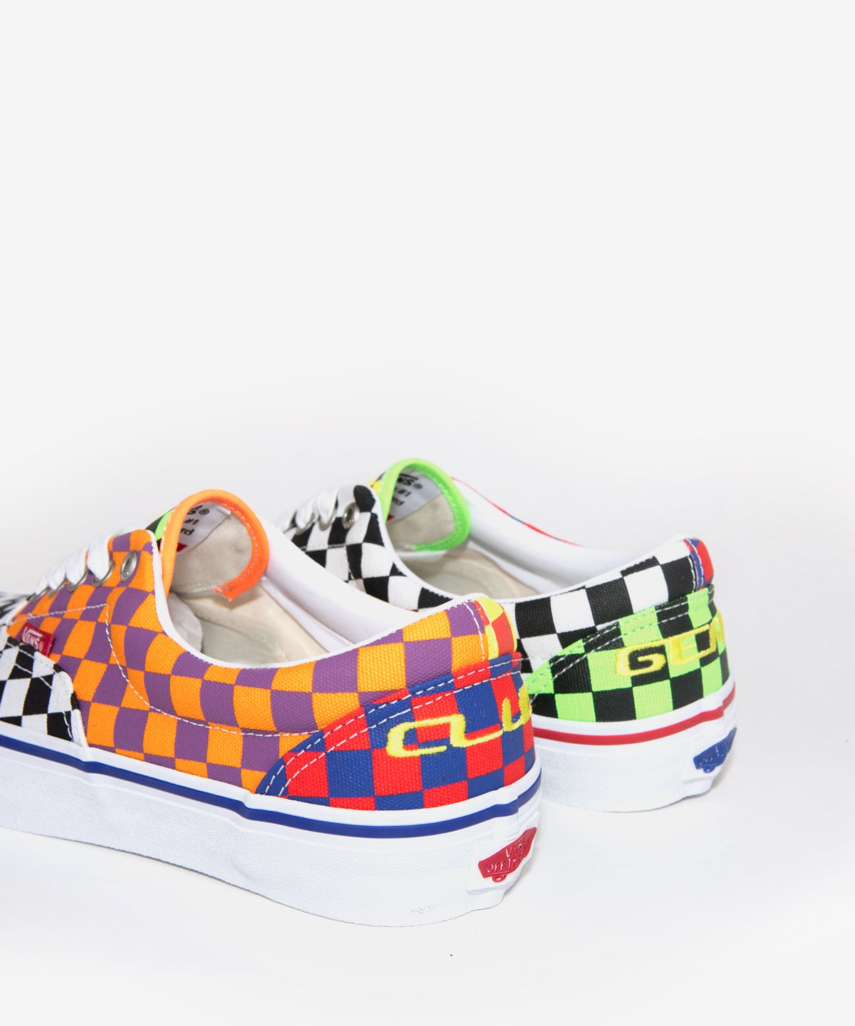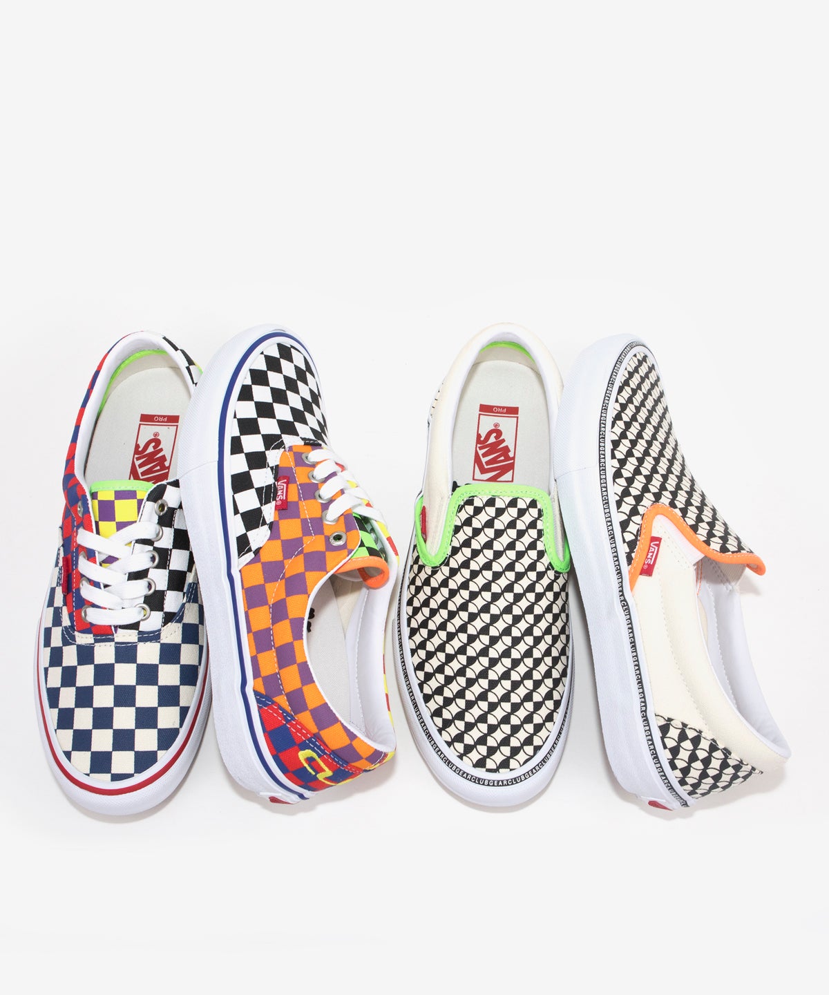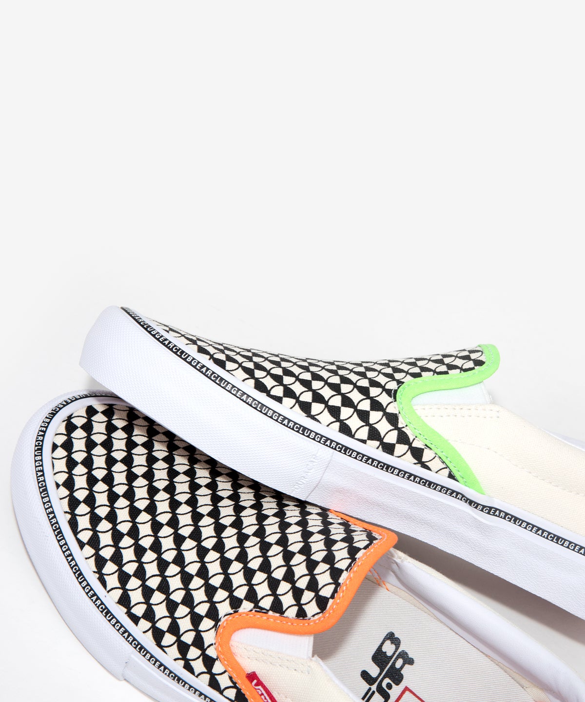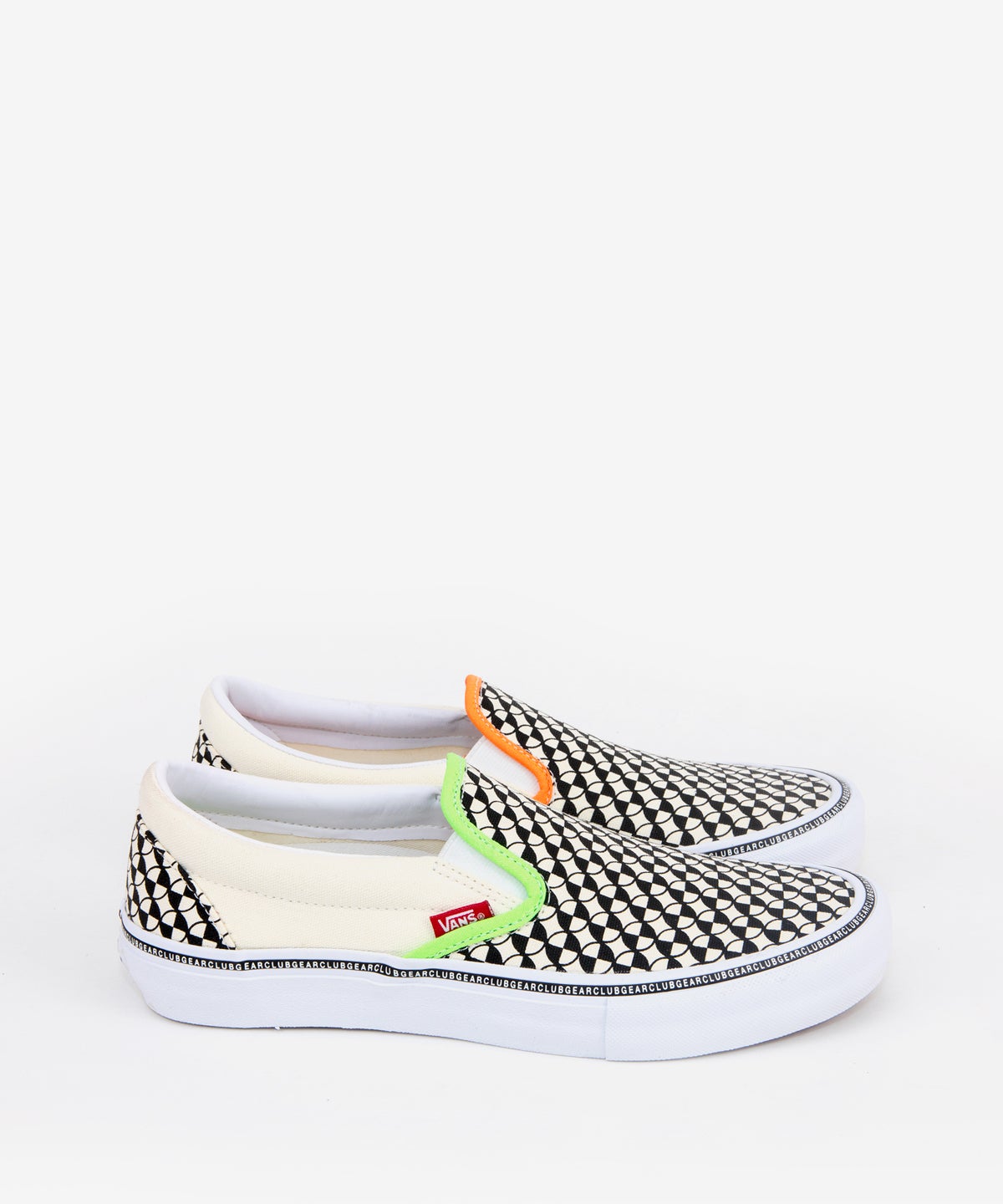 Vans Skate has teamed up with Vancouver skate brand CLUBGEAR, for this wild 90’s rave inspired collection. The Era Pro features a bright mixture of mismatched neon checkerboard prints, with yellow CLUBGEAR embroidered logos on each heel panel. Some minor neon details can also be found in the interior of each shoe. The Era Pro features a “crosshair” type of pattern on each toe, with natural white canvas side panels. The left and right shoe have mismatched neon accents, and feature foxing stripes with “CLUBGEAR” printed in a repeating pattern around the entire shoe.