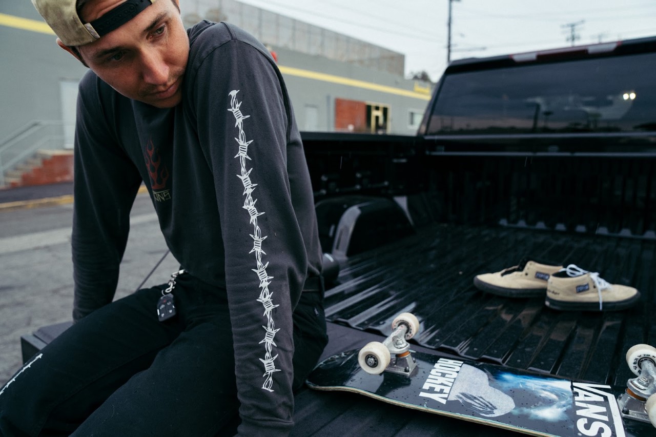 Elijah’s design inspiration carries over to an apparel collection that infuses his Southern California style into a few key pieces, including the Elijah Berle carpenter pant in black with white flame detailing, a long sleeve T-shirt in black with barbed wire down the sleeve and flamed detailing across the front chest, a woven short sleeve shirt in black with flame detailing on the collar and custom Vans patch on the chest, and a color-blocked hat with embroidery art tying back to the collection.