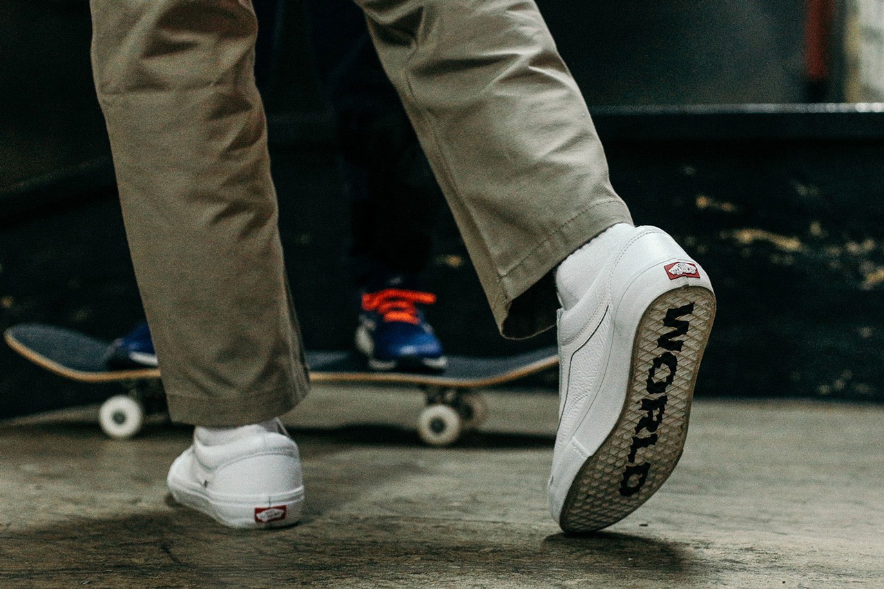 Built fully of white pebbled leather, uppers present an undeniably crisp tonal look. Signature embellishment arrives on the white laces, which offer a repeating “WORLD PEACE” print, done up in bold and blocky black letters. Rugged overlays spread across the toe cap, providing durability for all-day skate sessions. Tonal Vans tags sit under the white Jazz stripe, with a signature red rubberized badge gracing the white rubber midsole. To finalize the look, outsoles enlarge and split the “WORLD PEACE” print from the laces, with one word appearing on each shoe.