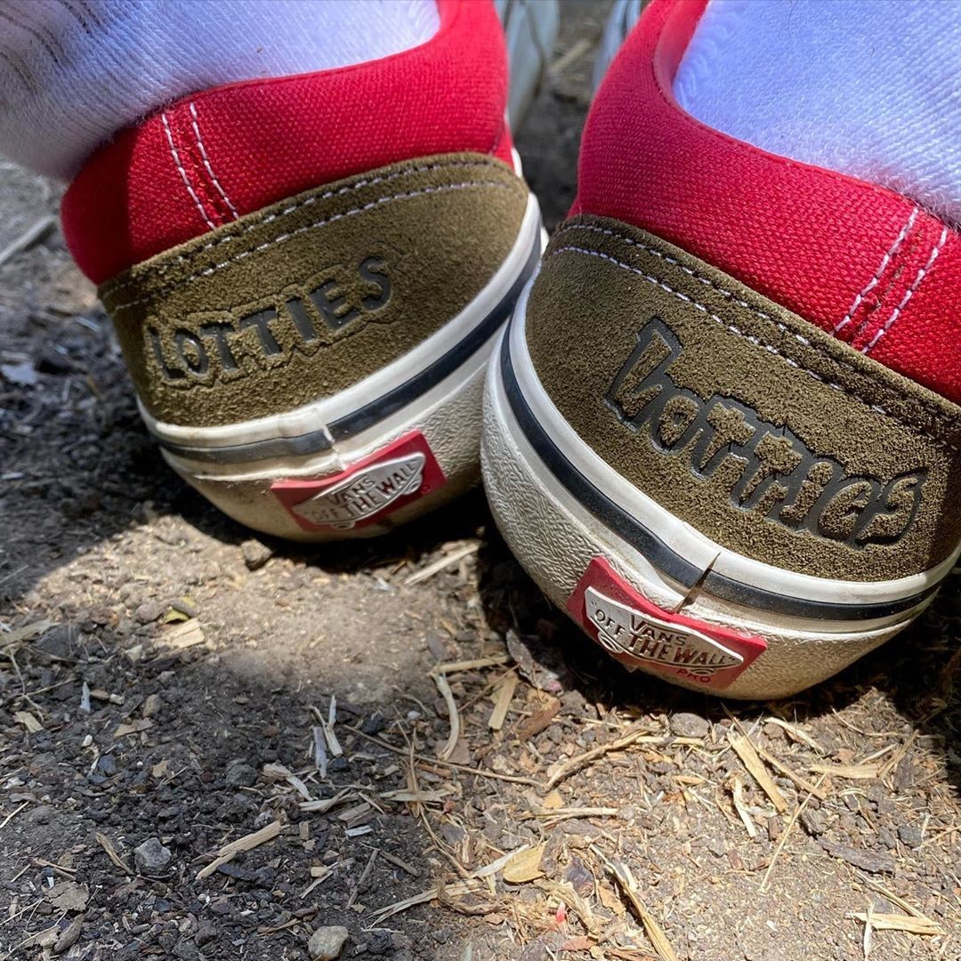 Next up is a vivid red Era that features a brown suede heel piece with yet another debossed Lotties graphic in a Goonies-style font. Lastly, the supposed Sk8-Lo swathes its quarter panels in white print and embroiders a jagged, lightning-style Lotties spellout graphic in tonal fashion on the heel.