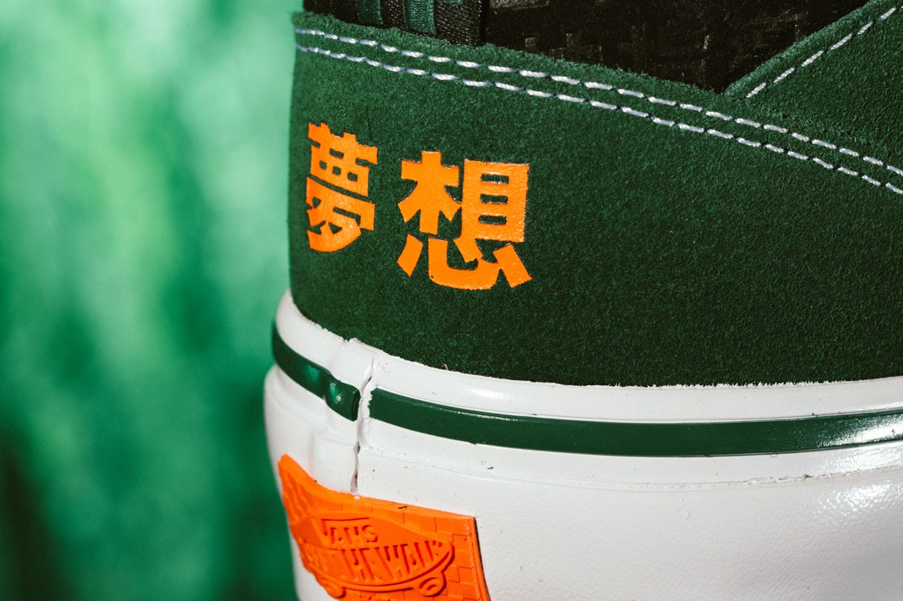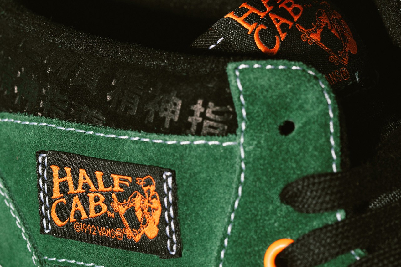 Starting out with the Skate Half Cab ’92 VCU, the kicks are anchored by their Eden green suede upper overlays that are attached to the toe boxes and quarter panels. Chinese letters are another primary design element of the kicks as they are printed in tonal fashion across the collars and mid-foot windows, as well as the heels in a bold, flame-y orange tone. Extra hits arrive by way of exposed white stitchings that outline each of the base layer’s panels.