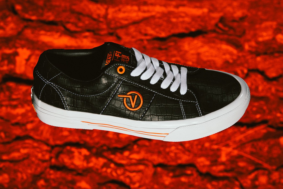 The Skate Sid VCU pair in this assemblage is constructed with a more elevated presentation. Uppers are fitted with stark black cracked leather which also is accessorized with angelic stitchings. Flying V insignias that rest on the mid-foot along with the “Vans Sci-Fi” co-branding on the tongues each stand out with more fiery essence as well.”