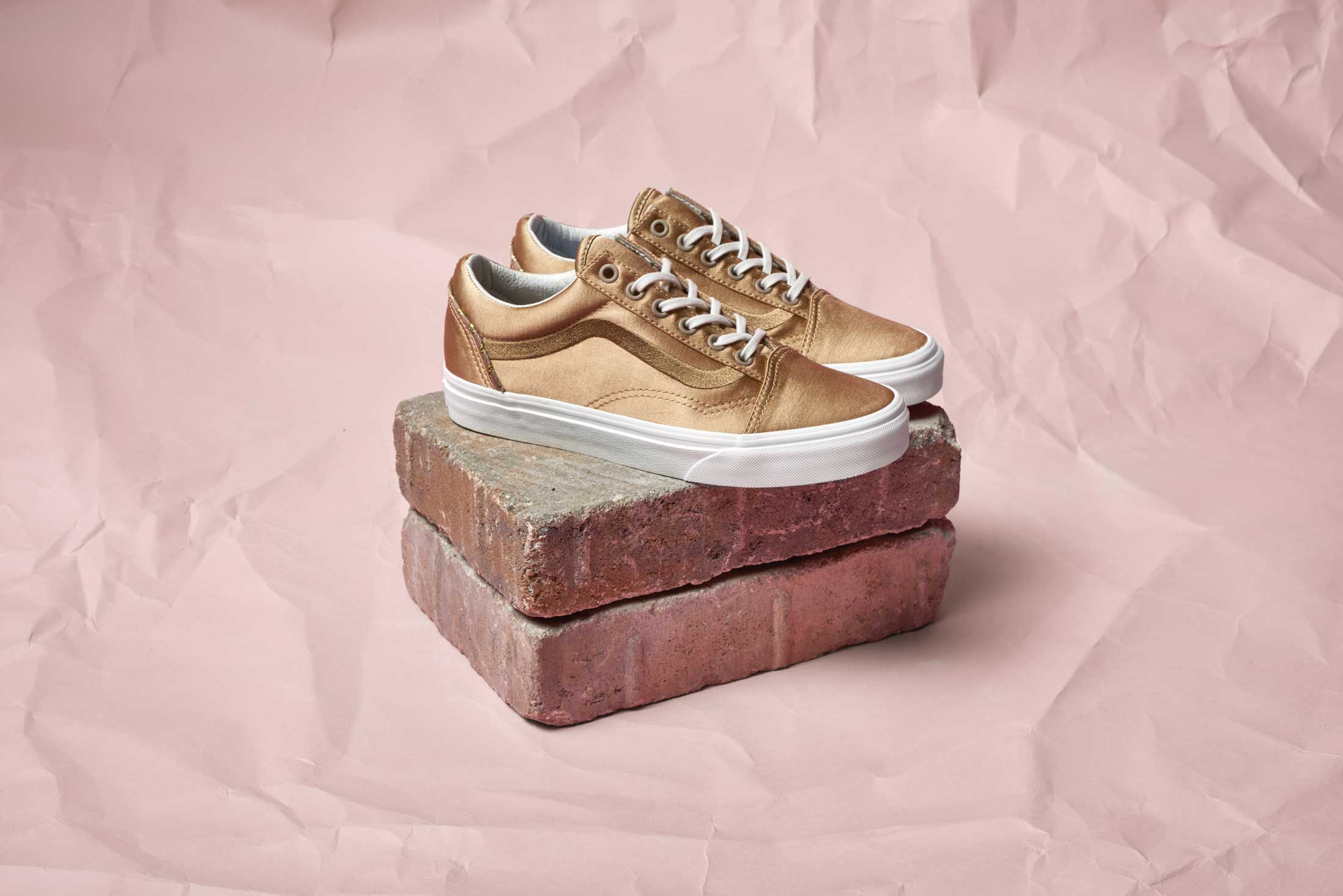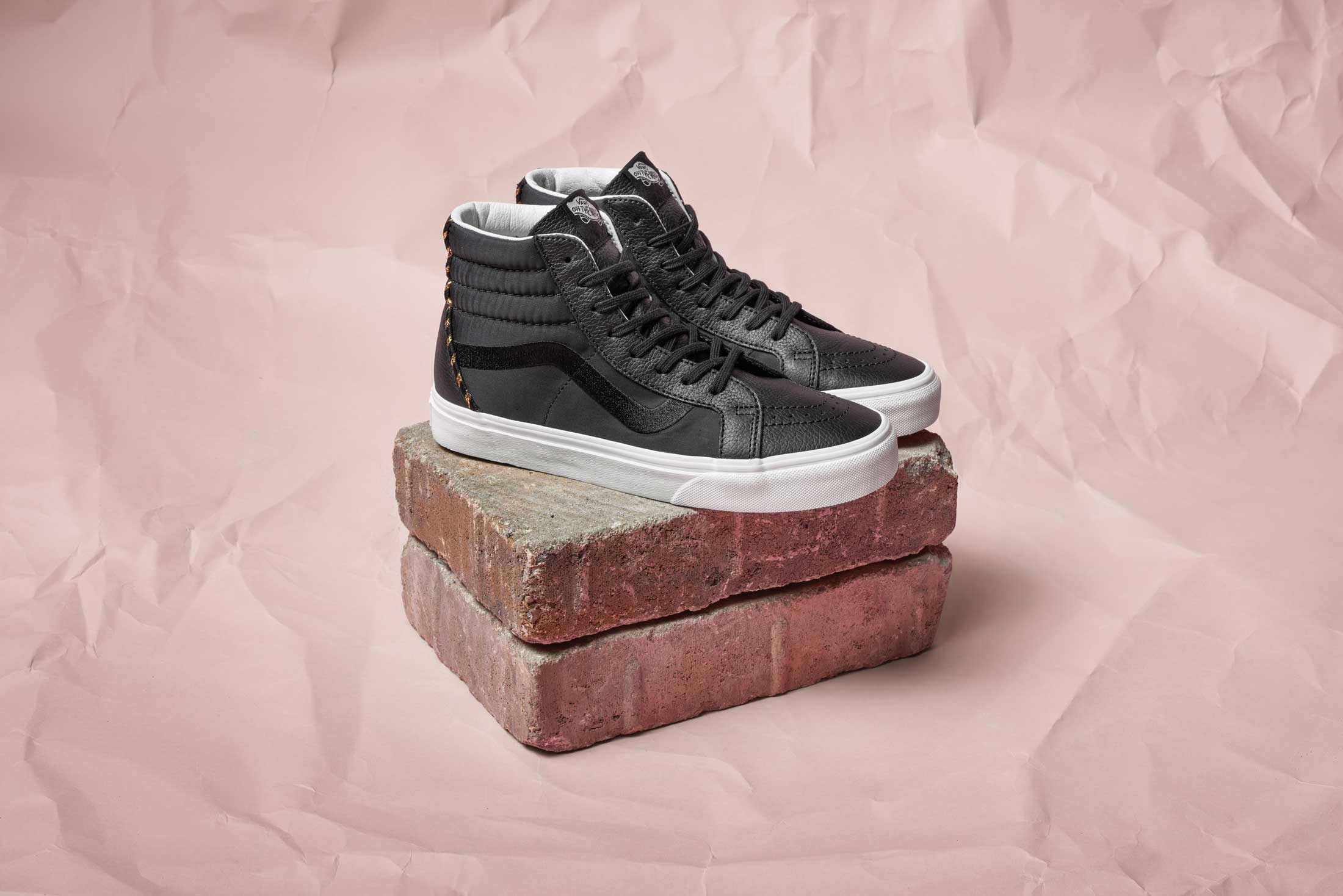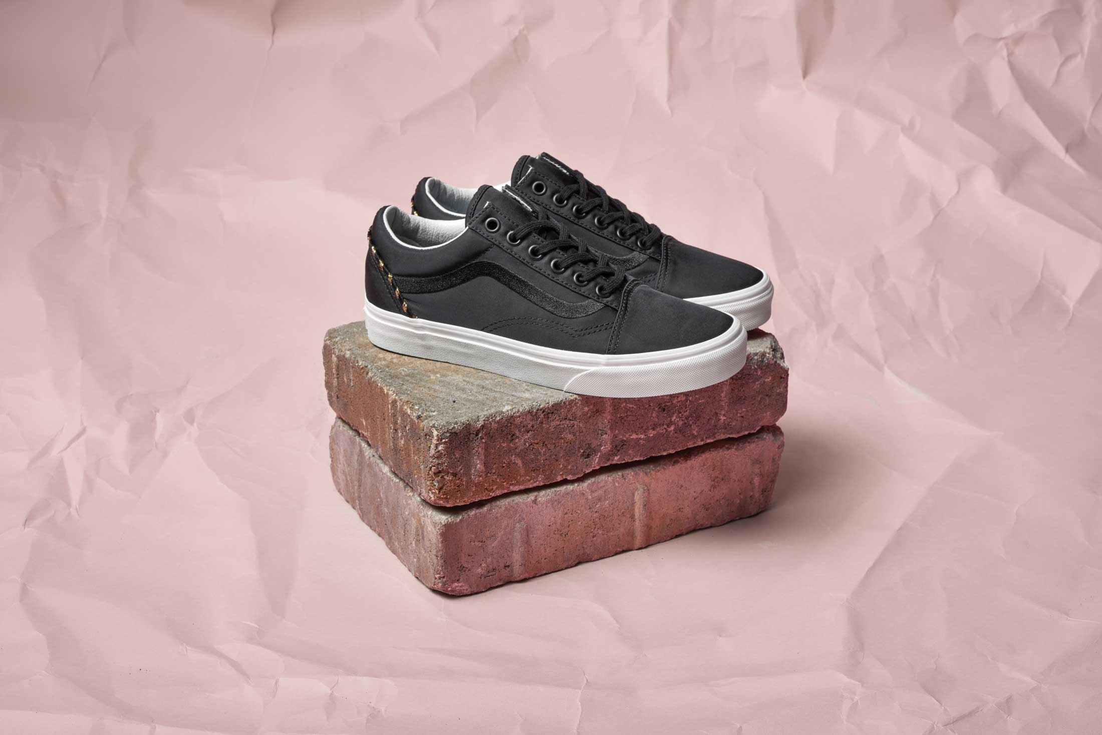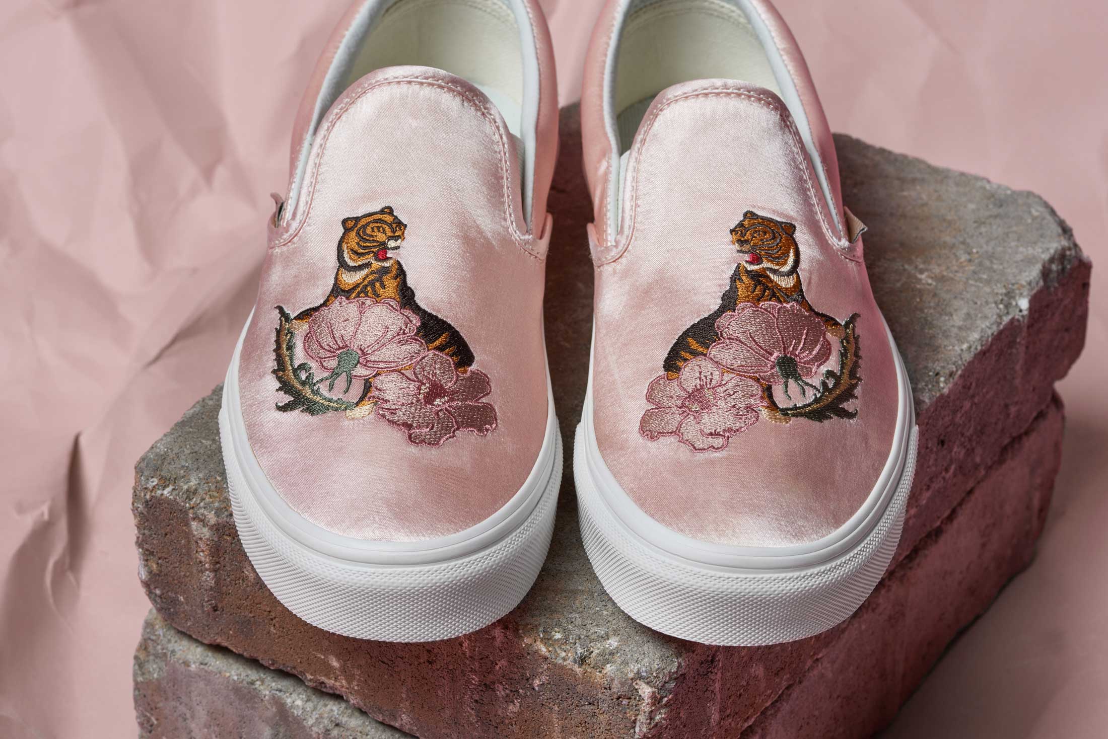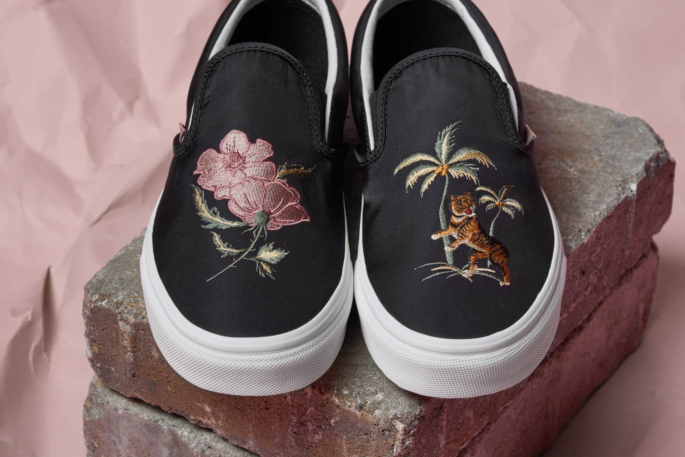 Proving Vans Classics are not just one thing, Vans designers have brought the flight satin and embroidery elements to three of the brand’s most iconic silhouettes. The Classic Slip-On features the all over satin material and embroidery across the vamp of shoe. The tiger in the poppies are mirrored across a rose-pink execution, while the black Classic Slip-On highlights the tiger in the palms and the poppy on each side. The Old Skool and Sk8-Hi Reissue take a subtle approach and use lush satin paneling throughout and feature decorative lurex cording across the heel. Each style is delivered in classic black with a metallic greige available in the Old Skool. Available in Unisex sizing (up to a mens 10).”