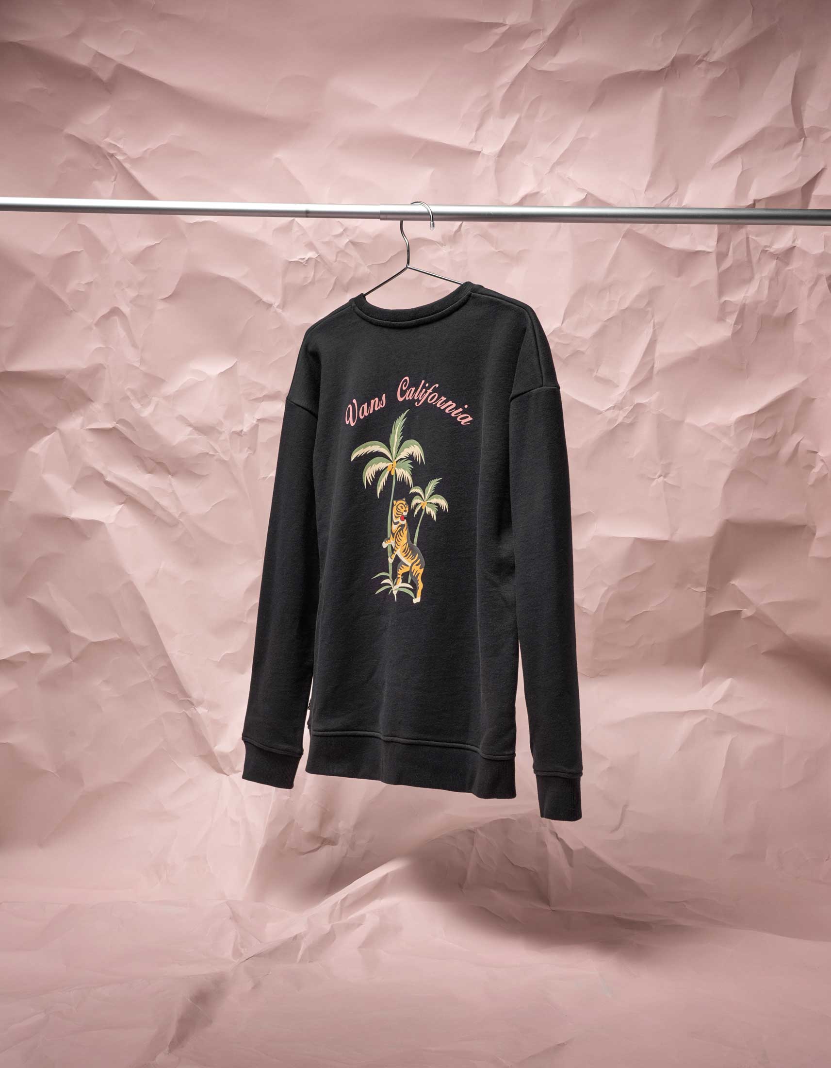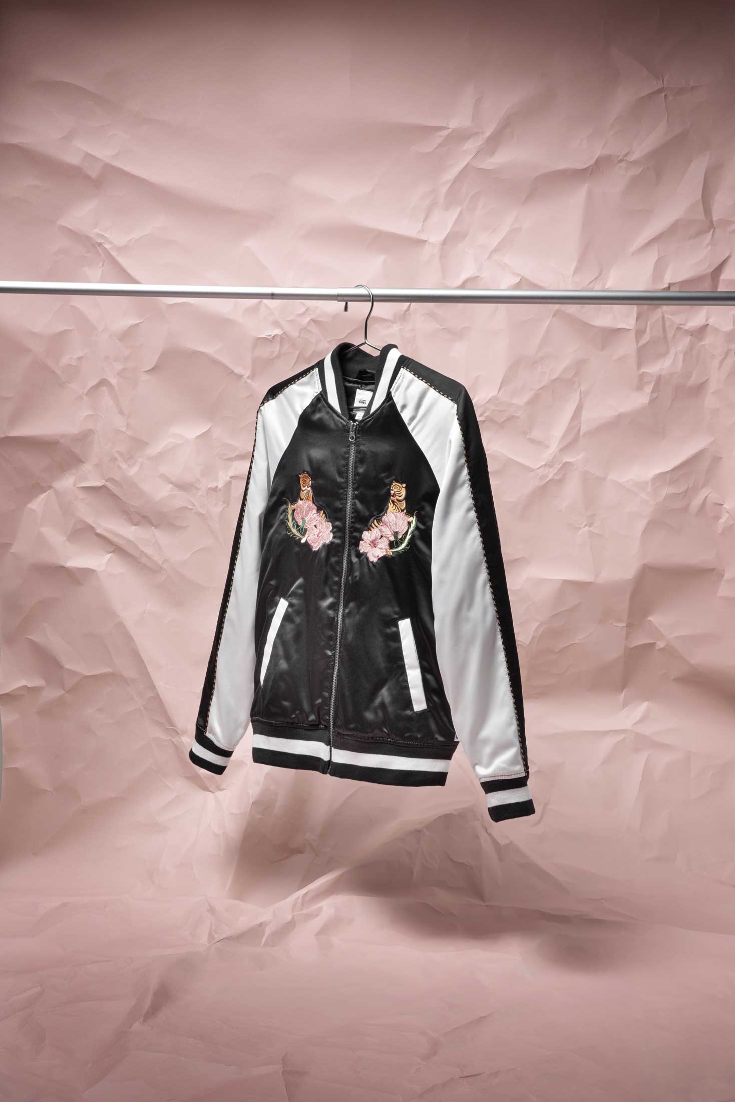 The hero piece of the capsule comes from Vans’ interpretation of the souvenir jacket, which sets the stage for the entire offering. Vans designers pay homage to the customary elements of a traditional souvenir jacket including two-toned color-blocking, striped rib detailing, quilted lining and embroidered back script and tiger. Those original elements are blended alongside nods to Vans’ home state of California with embroidered palm trees and poppy flowers.