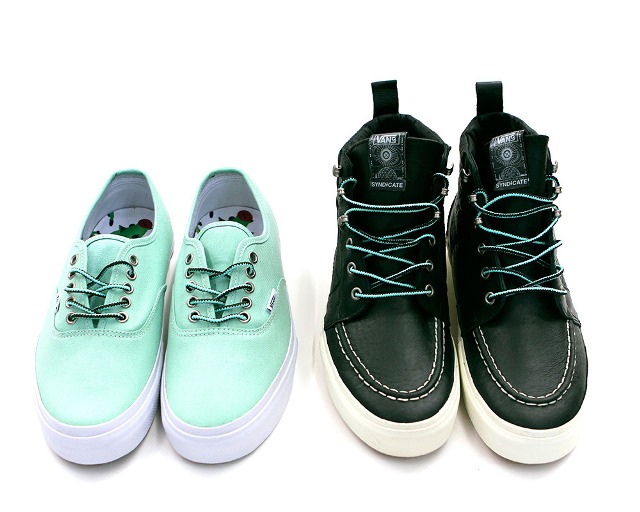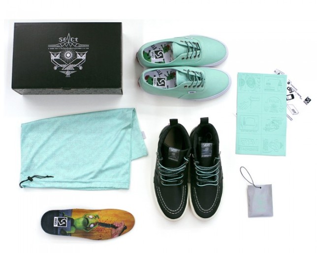 The latest Vans Syndicate release is upon us, and is slowly trickling into local Vans Syndicate dealers, like our fine peeps over at Silo. The pack takes it’s inspiration directly from Mike Hill’s two favorite shoes he wears, and the collaboration turned out to be a super dope release, and some of our design wishes made it to the final version, like the wide heel strip panel, seen on the early “Made in USA” Authentics. They toyed around with a few different variations, but we’re glad that this one stuck! The Sk8-Hi Boot “S”, although not typical for the “S” label, is a great addition to the Syndicate heritage, and is definitely a first. These resemble Mike’s work boots that he wears while out on his adventures. They come wrapped in premium dark green leather, while sitting on top of the same vanilla sole as the minty Authentic. Mint/black workboot laces are featured on both shoe, for a nice finishing touch. Oh, and one last thing! The accessories were brought back for this release! Every pair comes with a DIY rubber stamp sheet, with some Vans Syndicate, and some Alien Workshop artwork. Hooray! These are both now available at your local Vans Syndicate dealer, or if you’re having trouble finding your sizes, then check out Silo’s webstore at shop.silostore.com. All inventory should be up to date!