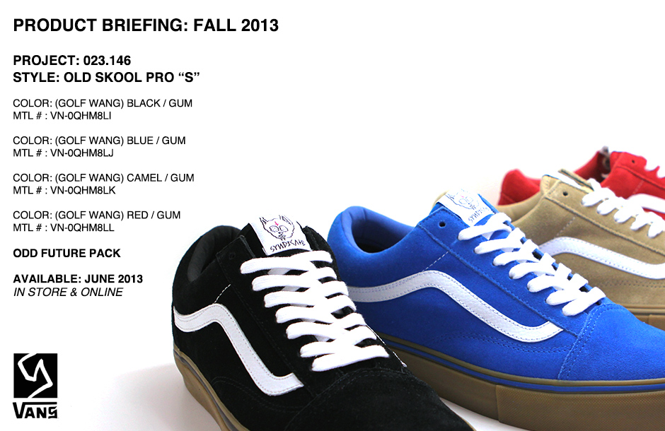 The super highly anticipated Odd Future Pack aka “Golf Wang” Old Skool Pro “S”‘s are due out any minute now. Our boy Brant @silostore has recently posted up some high-res pics of them, in all 4 colorways for us to see: Black, Blue, Camel, and Red, each sitting on top of a gum colored sole. I’m a sucker for gum soles, so you know I got mine on lock! Will you be copping, or passing? Can we all agree that these colors are awesome, regardless if you like OF? Why, yes, yes we can.