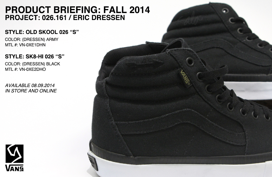 The Vans Syndicate Dressen Pack includes an Old Skool in Army / Water Resistant Canvas, a Sk8-Hi in Black / Water Resistant Canvas along with a Syndicate Crew Sock and Dressen Pocket Tee.”