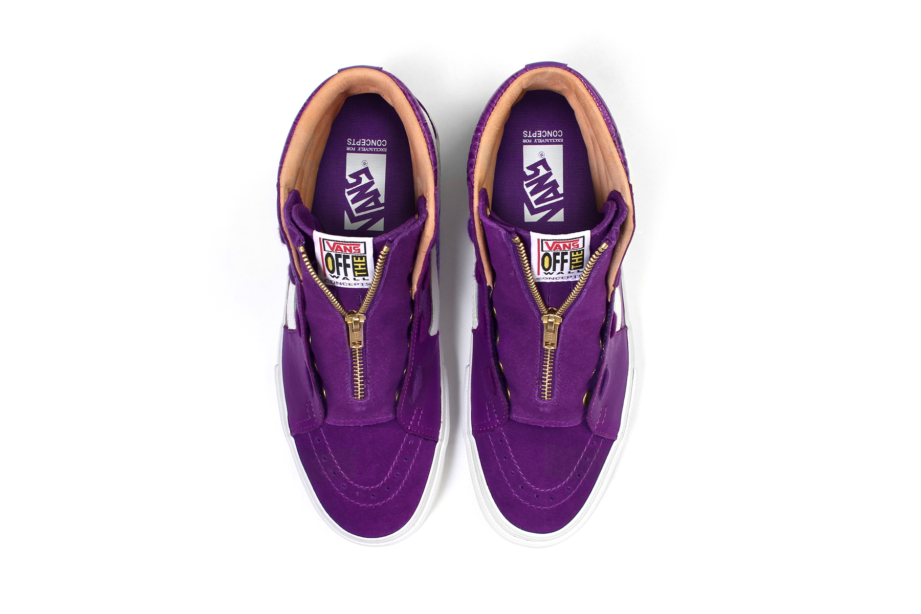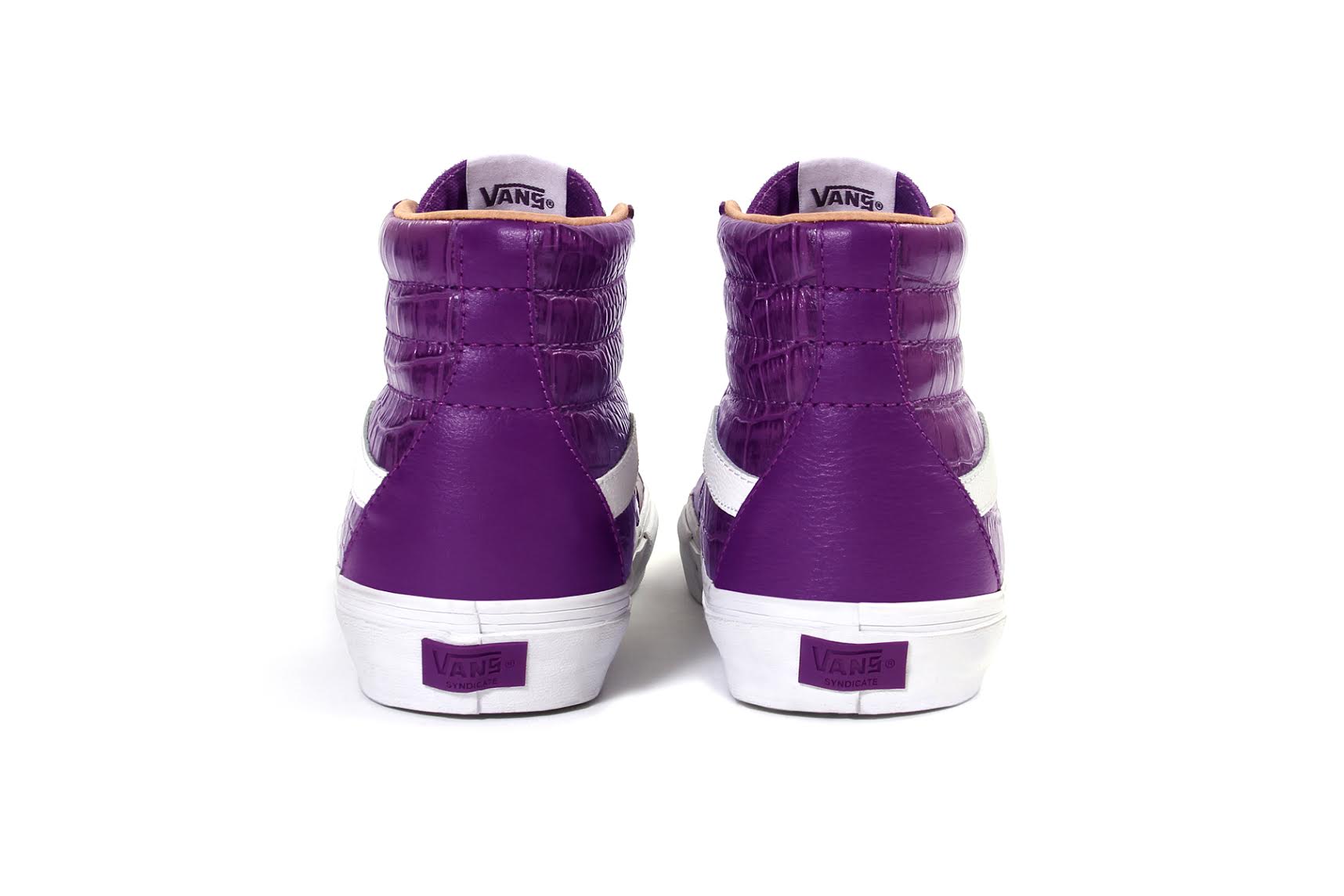 “Concepts joins Vans in launching the Van Sk8-Hi Syndicate. Set atop a classic white vulcanized rubber midsole, the design features premium materials and attention to detail. Highlighted by croc-embossed leather sidepaneling, the Sk8-Hi makes use of a premium leather lining in addition to pebbled leather eyestays. Special Concepts x Syndicate branding can be found both on the padded insoles and on the woven tongue label. 100% cotton laces allow for the additional or removal of a zippered shroud, adding a unique twist on the Sk8-Hi silhouette.