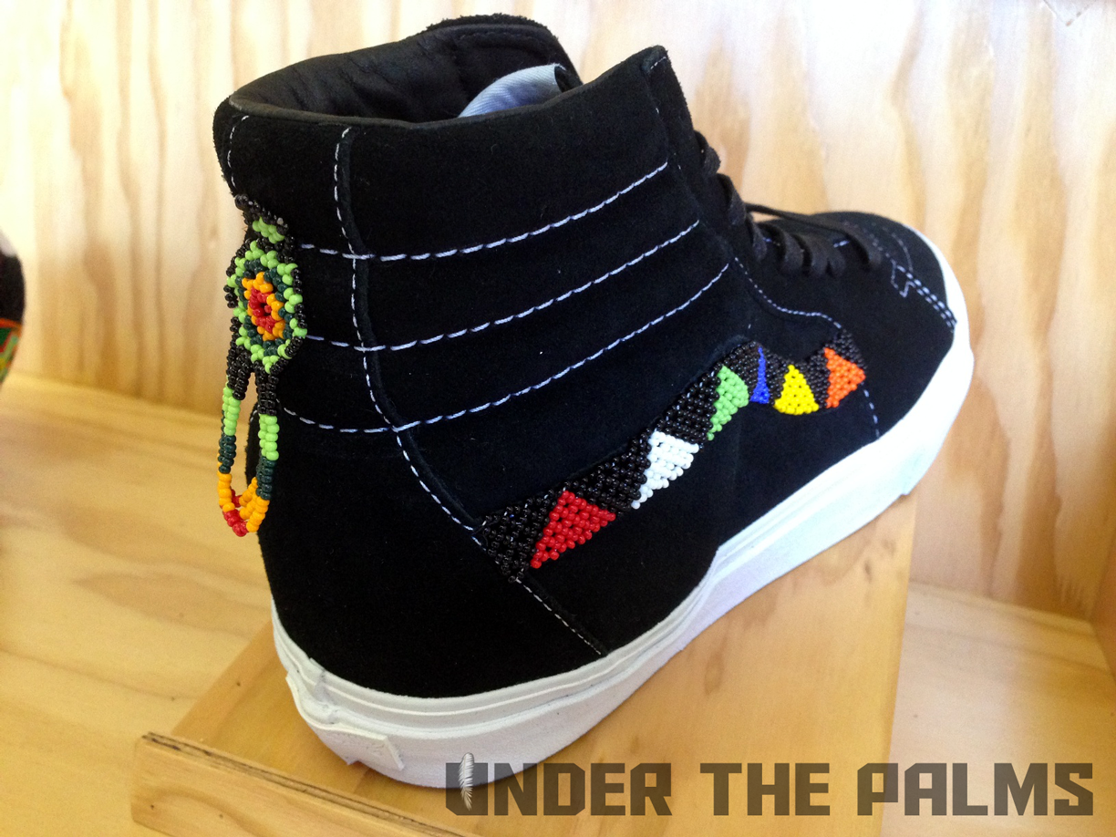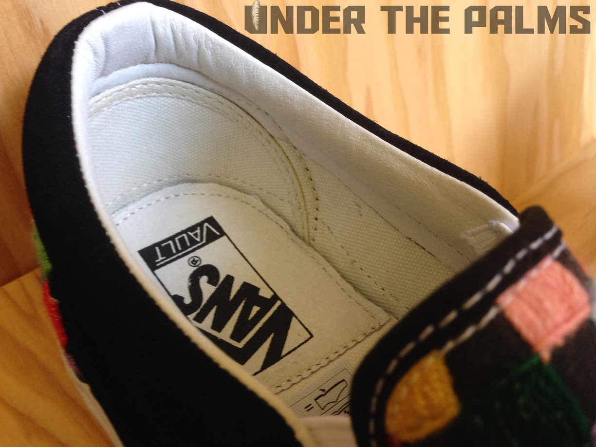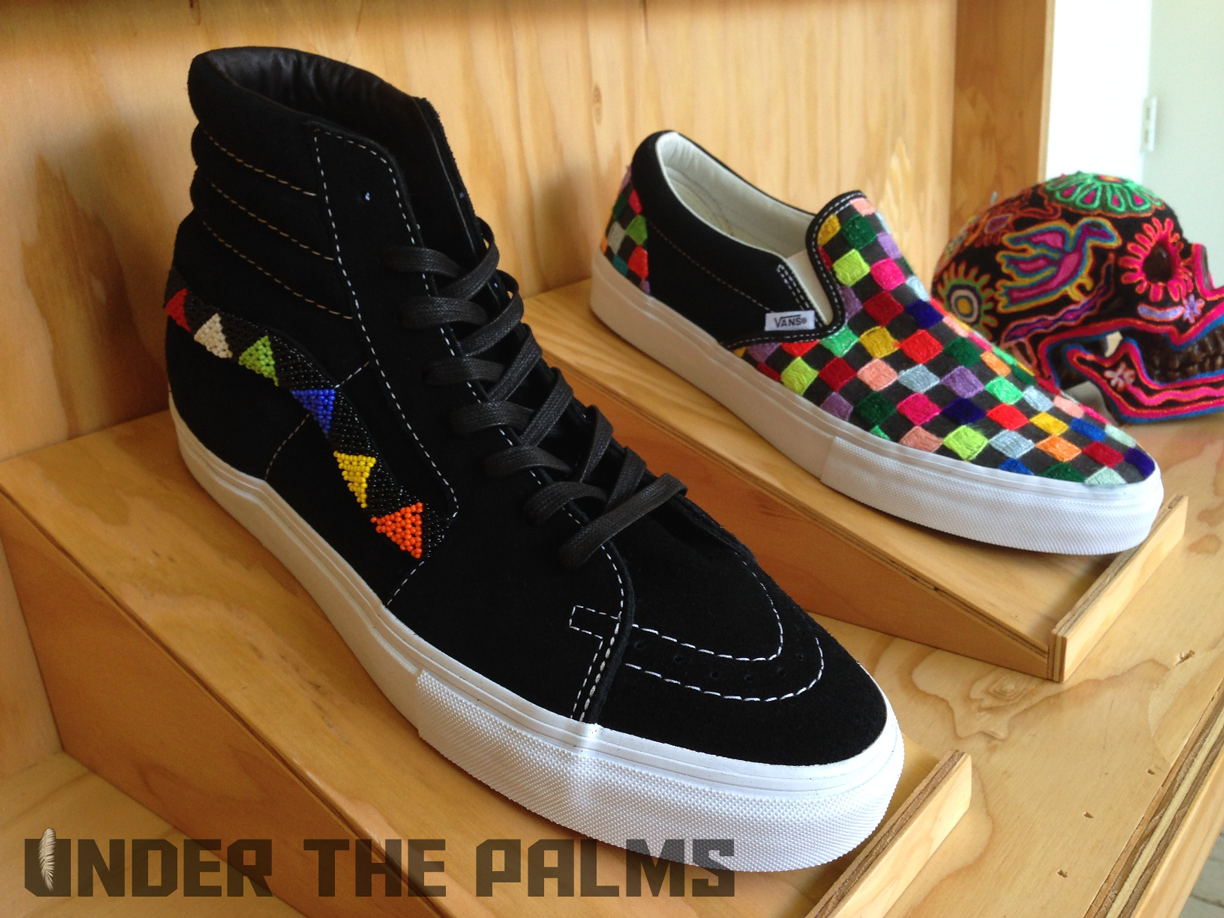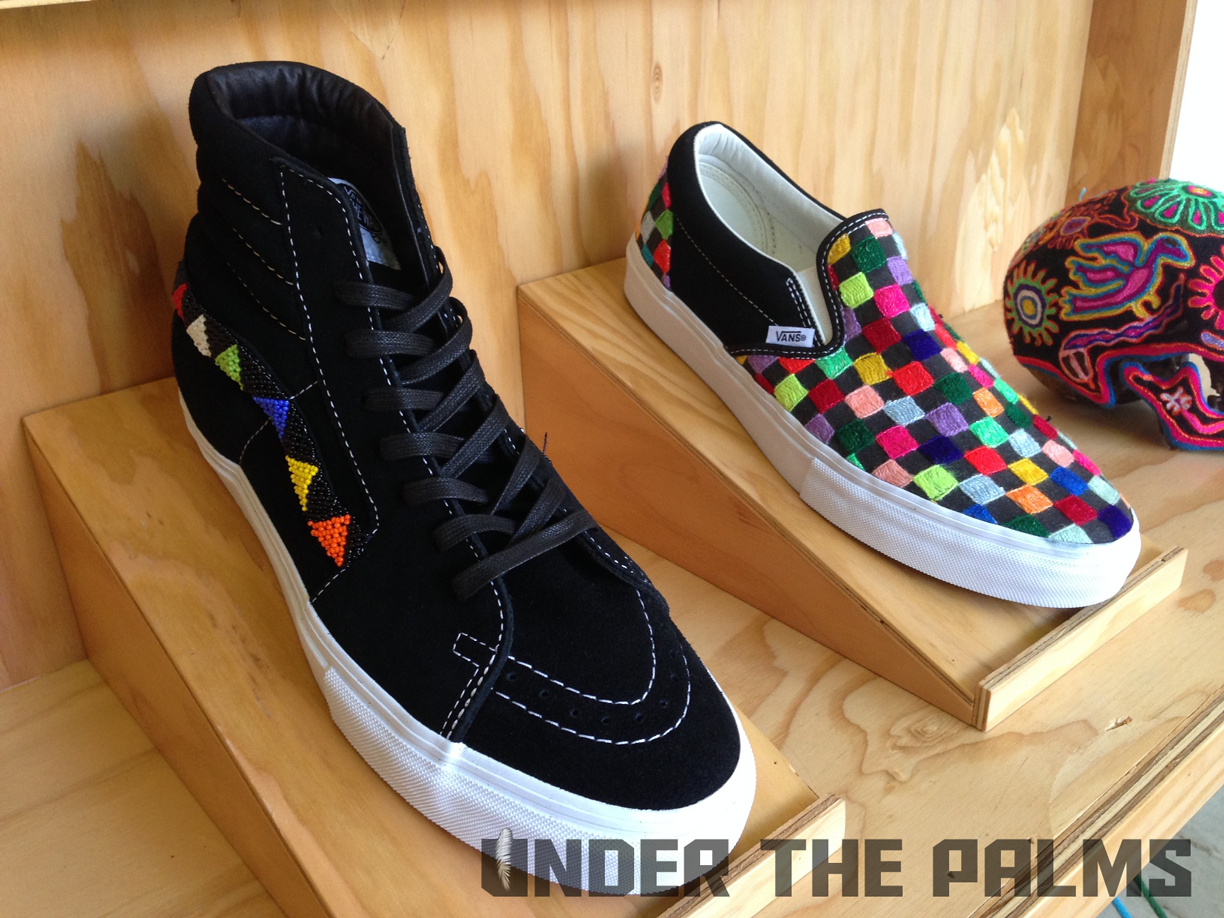 I had a chance to stop into Blends Costa Mesa today, down in the OC, and to my surprise they had the Huichol Vans on display, in an awesome build-out that Vans had made for their store. I noticed that the actual production pairs were slightly different from the official press pics that were released today, and this should answer a few questions that were raised about these, mostly the ones about the Syndicate 35th Anniversary Sk8-Hi being used as the base shoe for customization. Well, I’ve confirmed that the pairs that will be released, are in fact their own shoe, albeit very similar to said Syndicate version. The released pairs will feature pigskin linings, and the heel tabs are tonal white, to seamlessly blend in with the foxing, allowing the attention to be focused on the beadwork and hand-stitched artwork. Side flag tags are embroidered with Vault on the backside like usual, and the footbeds have the newly familiar leather heel pads that are branded with the Vault logos. SO have no fear, these aren’t just a reconstructed existing shoe. Sorry for the less-than professional photos, as all I had on me was my iphone, but I hope you appreciate the time I took to bring this info to y’all! It’s because we care damnit! Lol. Enjoy the pics, and as always, thanks to Nobu, and the Blends fam for all the continued support. BTW, these are so rare, that most shops will be only selling them in-store, but hopefully remaining pairs will be up for grabs online. 360 pairs worldwide!!!