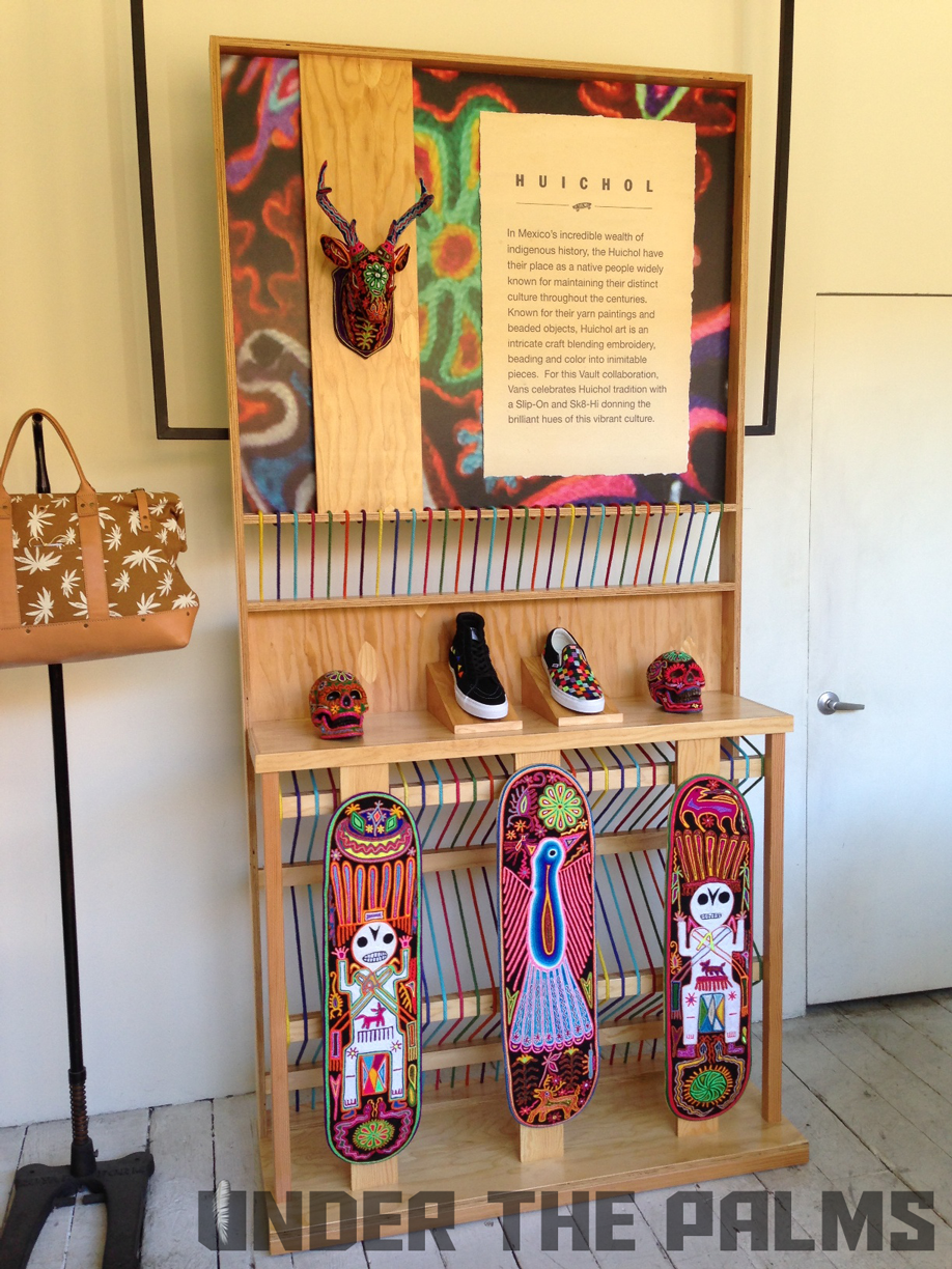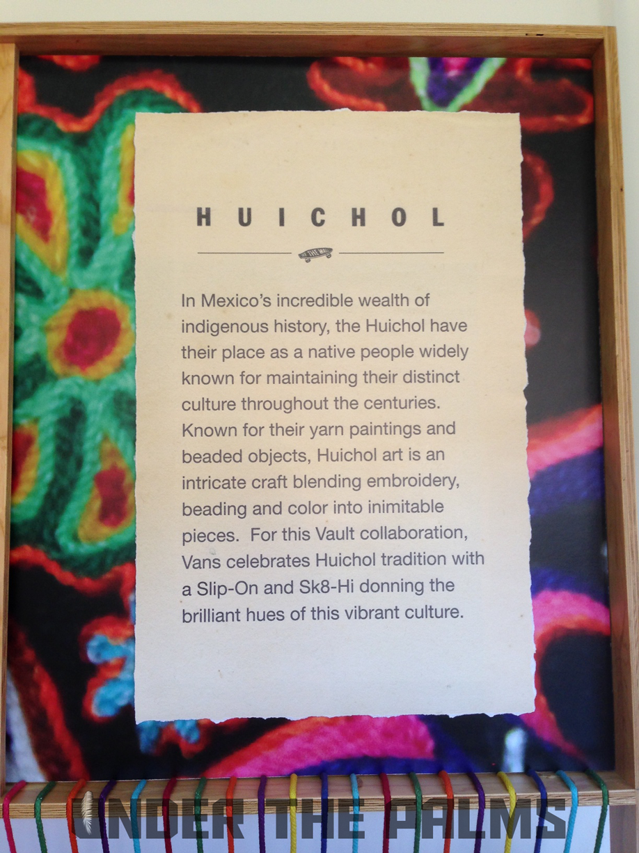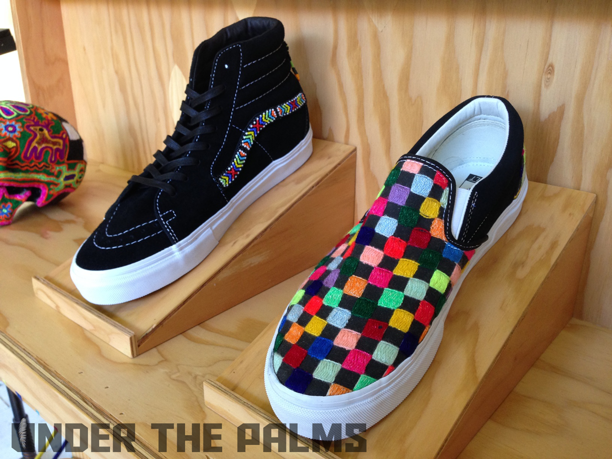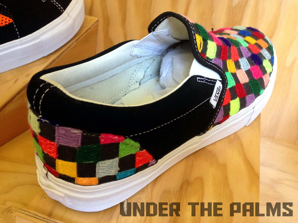 I had a chance to stop into Blends Costa Mesa today, down in the OC, and to my surprise they had the Huichol Vans on display, in an awesome build-out that Vans had made for their store. I noticed that the actual production pairs were slightly different from the official press pics that were released today, and this should answer a few questions that were raised about these, mostly the ones about the Syndicate 35th Anniversary Sk8-Hi being used as the base shoe for customization. Well, I’ve confirmed that the pairs that will be released, are in fact their own shoe, albeit very similar to said Syndicate version. The released pairs will feature pigskin linings, and the heel tabs are tonal white, to seamlessly blend in with the foxing, allowing the attention to be focused on the beadwork and hand-stitched artwork. Side flag tags are embroidered with Vault on the backside like usual, and the footbeds have the newly familiar leather heel pads that are branded with the Vault logos. SO have no fear, these aren’t just a reconstructed existing shoe. Sorry for the less-than professional photos, as all I had on me was my iphone, but I hope you appreciate the time I took to bring this info to y’all! It’s because we care damnit! Lol. Enjoy the pics, and as always, thanks to Nobu, and the Blends fam for all the continued support. BTW, these are so rare, that most shops will be only selling them in-store, but hopefully remaining pairs will be up for grabs online. 360 pairs worldwide!!!