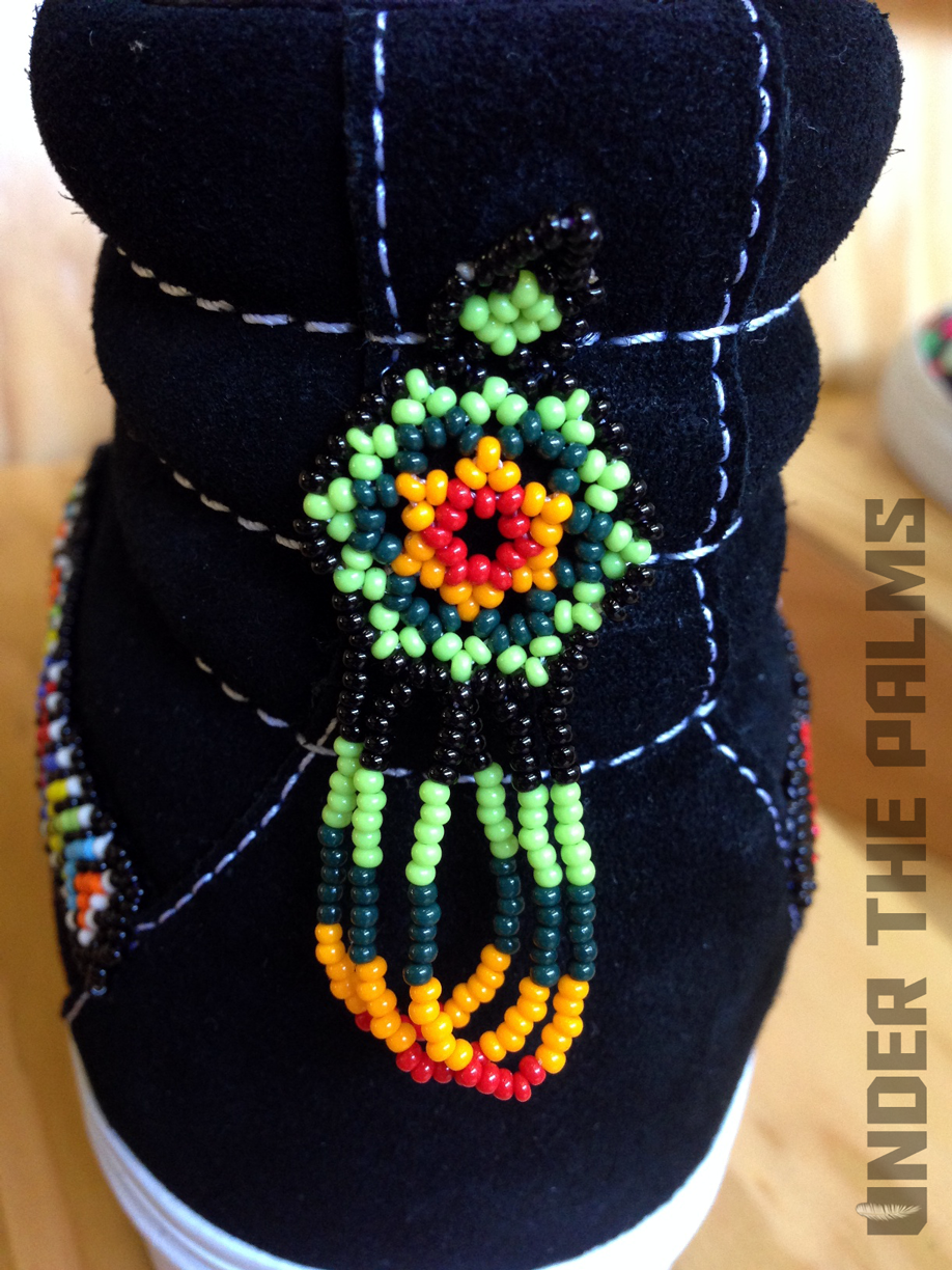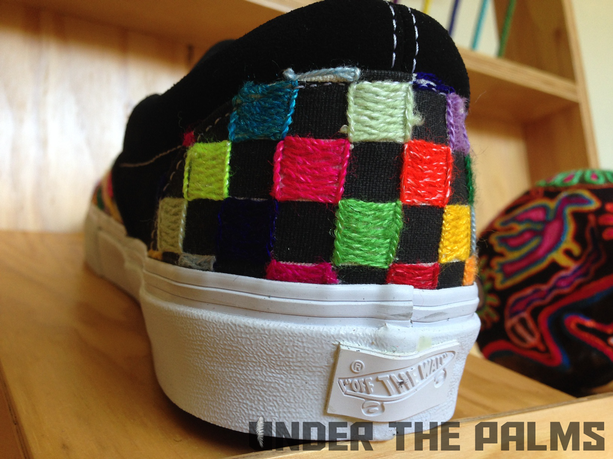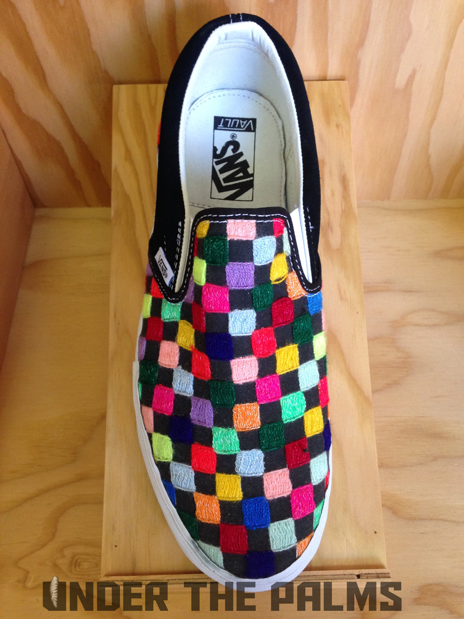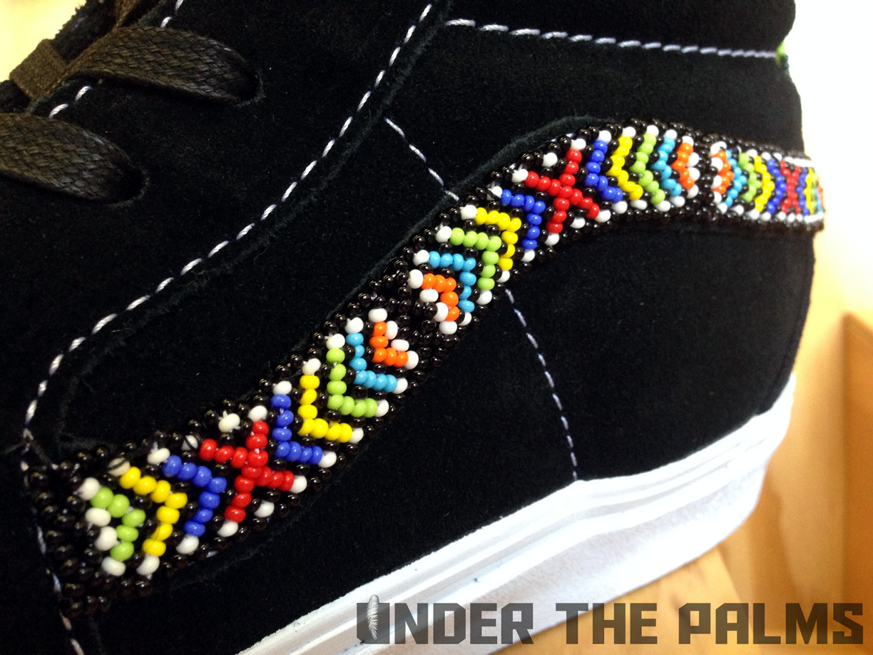 I had a chance to stop into Blends Costa Mesa today, down in the OC, and to my surprise they had the Huichol Vans on display, in an awesome build-out that Vans had made for their store. I noticed that the actual production pairs were slightly different from the official press pics that were released today, and this should answer a few questions that were raised about these, mostly the ones about the Syndicate 35th Anniversary Sk8-Hi being used as the base shoe for customization. Well, I’ve confirmed that the pairs that will be released, are in fact their own shoe, albeit very similar to said Syndicate version. The released pairs will feature pigskin linings, and the heel tabs are tonal white, to seamlessly blend in with the foxing, allowing the attention to be focused on the beadwork and hand-stitched artwork. Side flag tags are embroidered with Vault on the backside like usual, and the footbeds have the newly familiar leather heel pads that are branded with the Vault logos. SO have no fear, these aren’t just a reconstructed existing shoe. Sorry for the less-than professional photos, as all I had on me was my iphone, but I hope you appreciate the time I took to bring this info to y’all! It’s because we care damnit! Lol. Enjoy the pics, and as always, thanks to Nobu, and the Blends fam for all the continued support. BTW, these are so rare, that most shops will be only selling them in-store, but hopefully remaining pairs will be up for grabs online. 360 pairs worldwide!!!