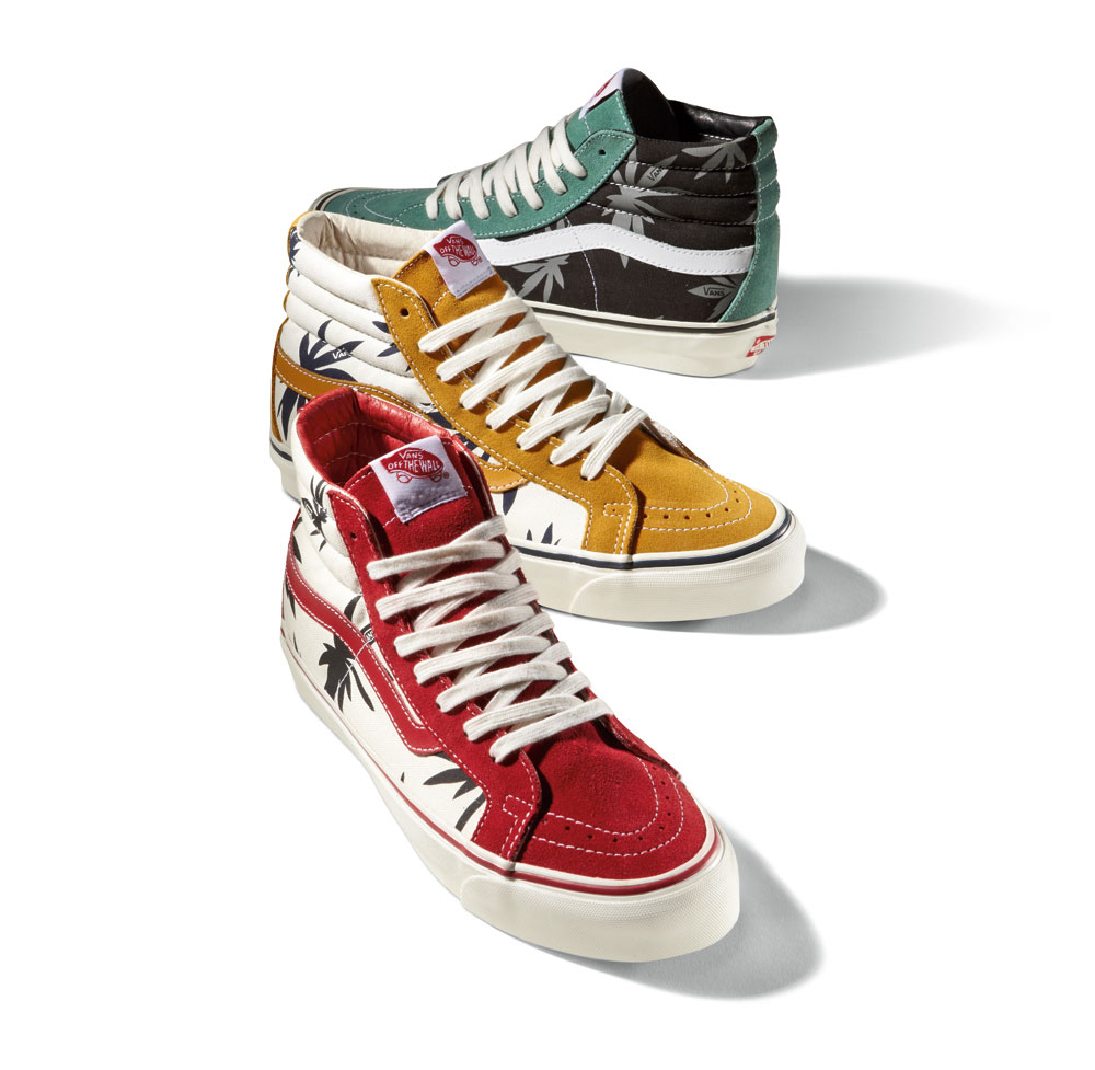 “Vault by Vans unveils the next assortment of Original Classics with three new colorways of the OG Sk8-Hi LX. Utilizing the design specs from the Sk8-Hi’s first production in 1978, the OG Sk8-Hi LX revives the archived Palm Leaf print for Black/Beryl Green, Black/Red and Navy/Bronze offerings. The spring editions of the Palm Leaf OG Sk8-Hi LX are available this May at select Vault by Vans dealers”