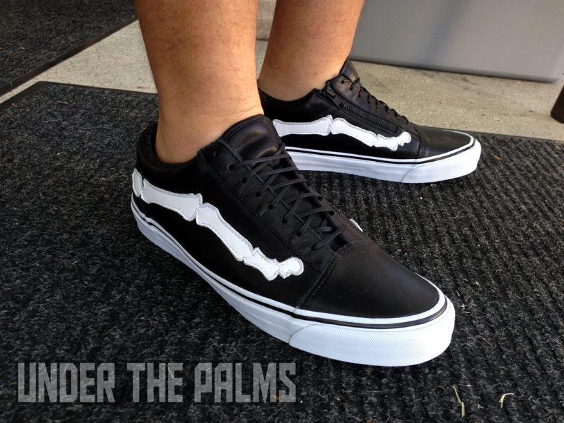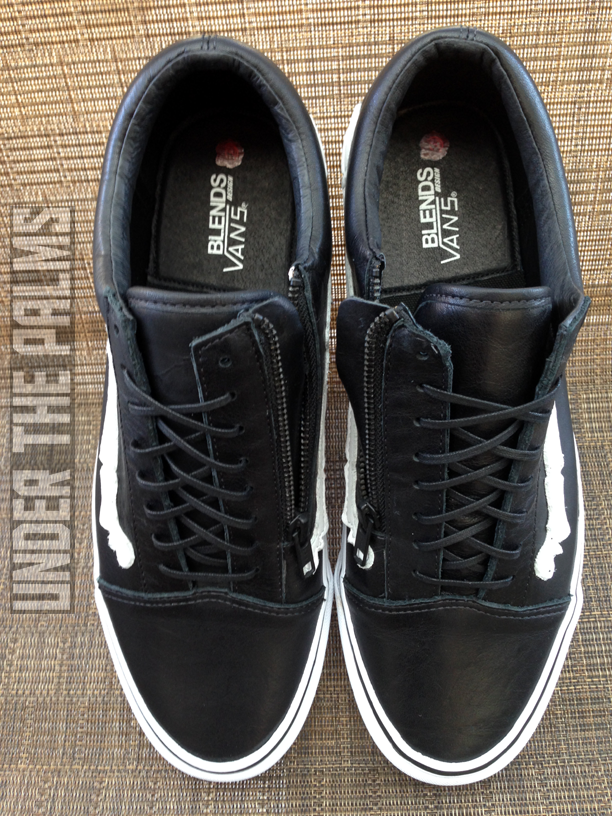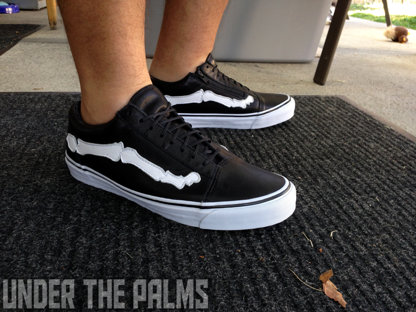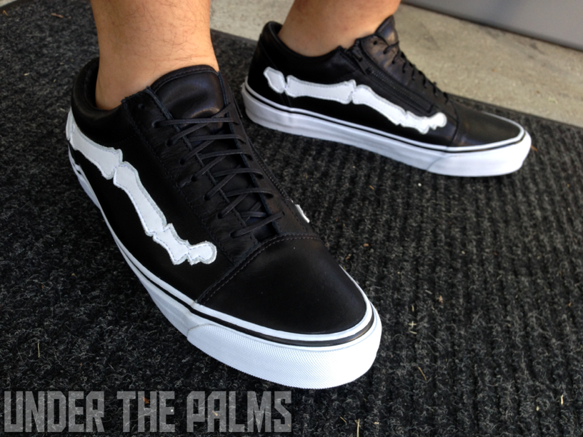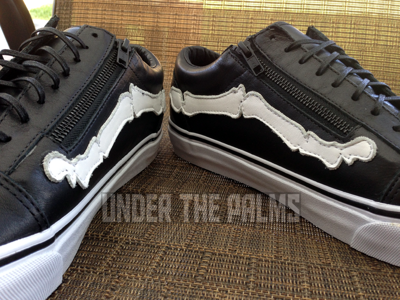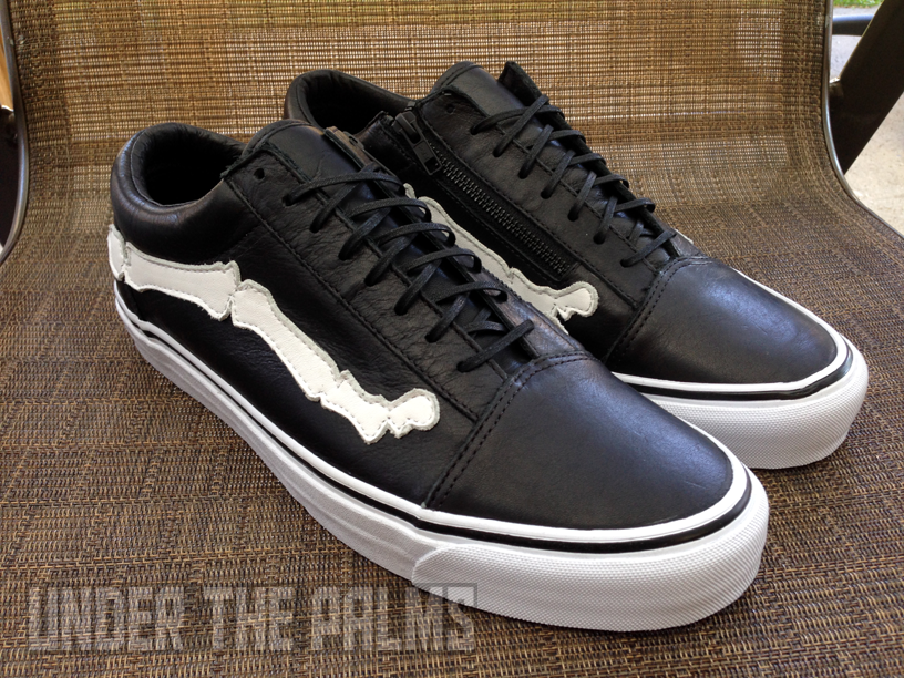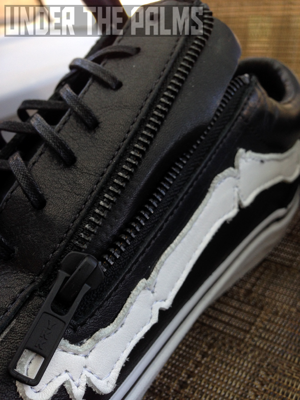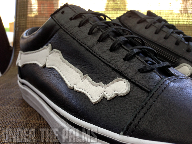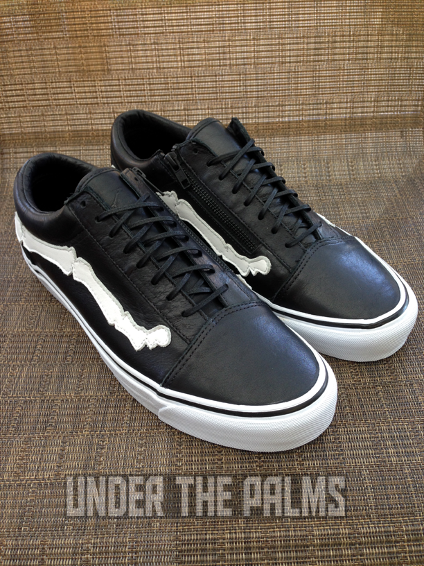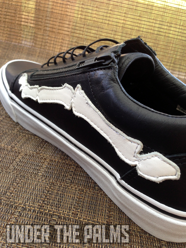 I have to give the biggest shout-out to our friends over at Blends!!! I can’t believe they’re finally here! When sample pics first popped up online of the black Old Skool with the familiar bones jazz stripe, we instantly knew who was behind this creation, and started beasting over them. It was only about a year ago that Blends released their 10th anniversary Sk8-Hi Reissue Zip LX “Bones”, and with that epic shoe, and instant cult status, a legacy was born. Now, we’re only two shoes deep into this legacy, but this awesome design is all theirs. Nobody did it before them, and quite honestly, who would dare replicate it? We’d shame them in an instant! The apparent motorcycle culture inspiration is awesome and makes for some great design aspects. Simple black colorways, with white accents, and white soles are all that you need when you have premium leather, a side zipper reminiscent of a leather motorcycle jacket, and a bad-ass bone on the side of your shoe! And let me go back to the leather on these once more. If I’m not mistaken, Blends utilized a higher grade of leather on these Old Skool Zip LX’s, than they did on the Sk8-Hi Reissue Zip LX from last year. It just feels softer, more supple, and the grain looks to be of higher grade. Take a peek at my detailed shots for a better look. Unlike the 100 pair production of last year’s release, this year there are about triple that, but that doesn’t mean you’ll be able to stroll into your local Blends location mid-afternoon and be able to pick these up. If I were you, I’d be dusting off your camping chairs, and deciding on which location you want to line up at, as these are on everyone’s radar this time, and there shouldn’t be any rain in the forecast like last year, to keep some folks at home. Bottom line…don’t underestimate these if you want them. I’ll be seeing some of you in line on Saturday morning, if you plan to go to the Costa Mesa location. There will also be pairs allocated for Blends online shop, so stay tuned to their newsletter, twitter, Instagram, etc. for drop info and pricing.