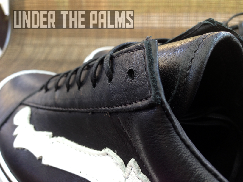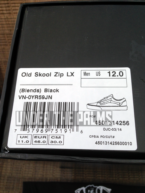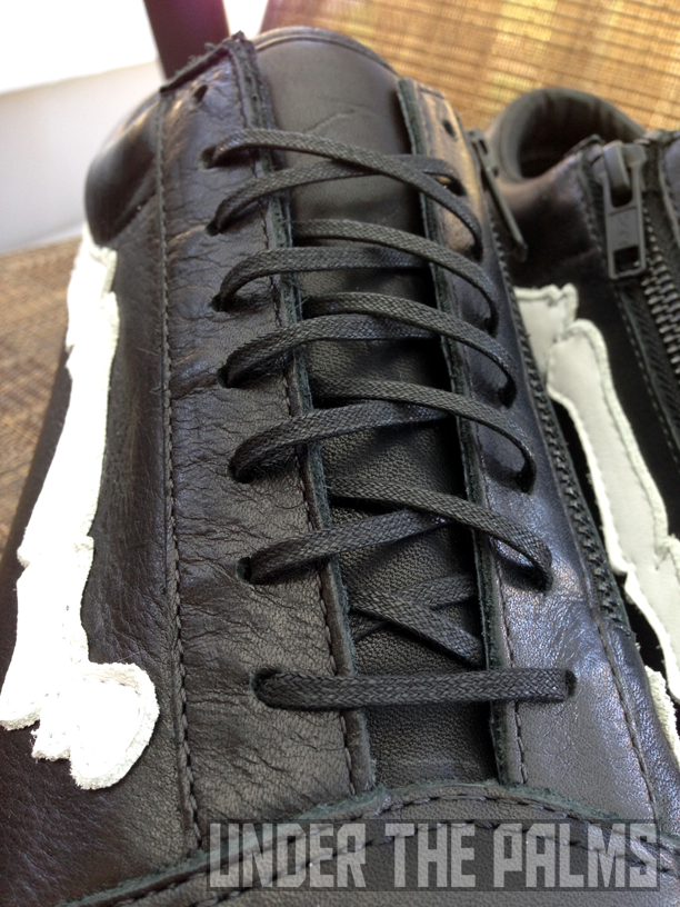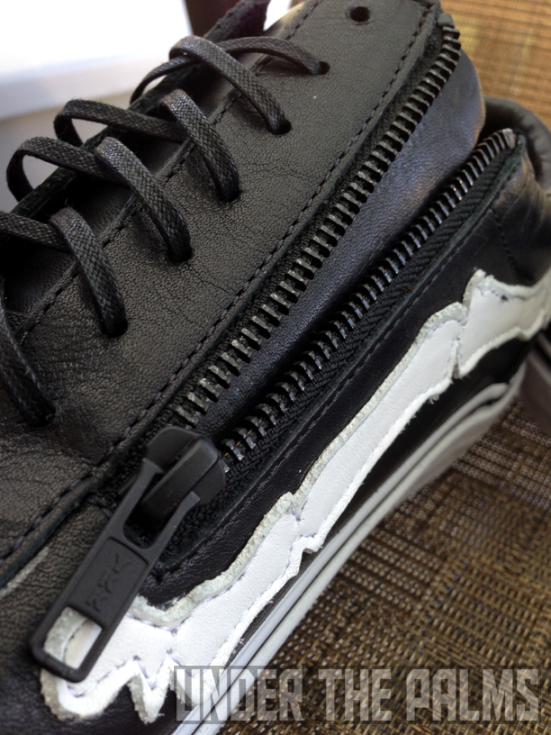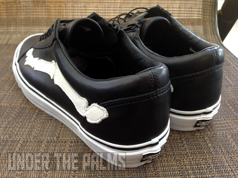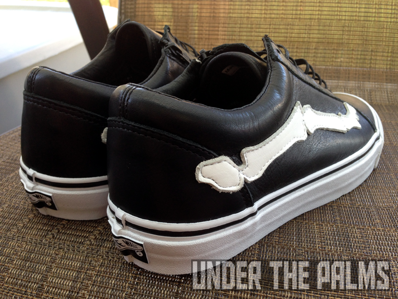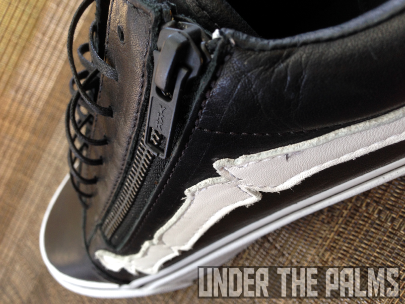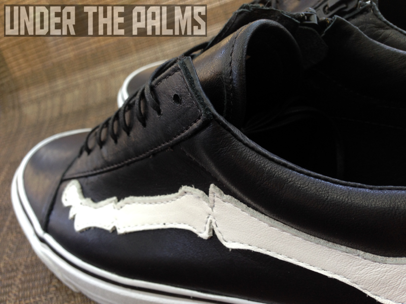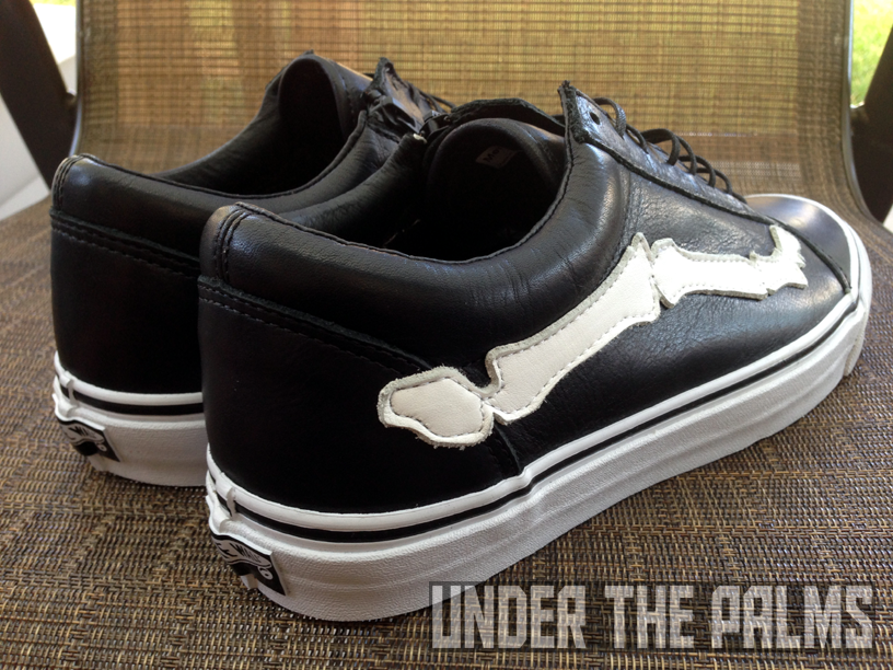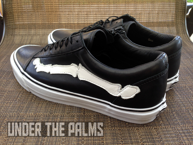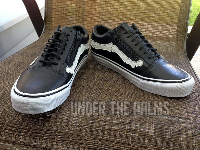I have to give the biggest shout-out to our friends over at Blends!!! I can’t believe they’re finally here! When sample pics first popped up online of the black Old Skool with the familiar bones jazz stripe, we instantly knew who was behind this creation, and started beasting over them. It was only about a year ago that Blends released their 10th anniversary Sk8-Hi Reissue Zip LX “Bones”, and with that epic shoe, and instant cult status, a legacy was born. Now, we’re only two shoes deep into this legacy, but this awesome design is all theirs. Nobody did it before them, and quite honestly, who would dare replicate it? We’d shame them in an instant! The apparent motorcycle culture inspiration is awesome and makes for some great design aspects. Simple black colorways, with white accents, and white soles are all that you need when you have premium leather, a side zipper reminiscent of a leather motorcycle jacket, and a bad-ass bone on the side of your shoe! And let me go back to the leather on these once more. If I’m not mistaken, Blends utilized a higher grade of leather on these Old Skool Zip LX’s, than they did on the Sk8-Hi Reissue Zip LX from last year. It just feels softer, more supple, and the grain looks to be of higher grade. Take a peek at my detailed shots for a better look. Unlike the 100 pair production of last year’s release, this year there are about triple that, but that doesn’t mean you’ll be able to stroll into your local Blends location mid-afternoon and be able to pick these up. If I were you, I’d be dusting off your camping chairs, and deciding on which location you want to line up at, as these are on everyone’s radar this time, and there shouldn’t be any rain in the forecast like last year, to keep some folks at home. Bottom line…don’t underestimate these if you want them. I’ll be seeing some of you in line on Saturday morning, if you plan to go to the Costa Mesa location. There will also be pairs allocated for Blends online shop, so stay tuned to their newsletter, twitter, Instagram, etc. for drop info and pricing.