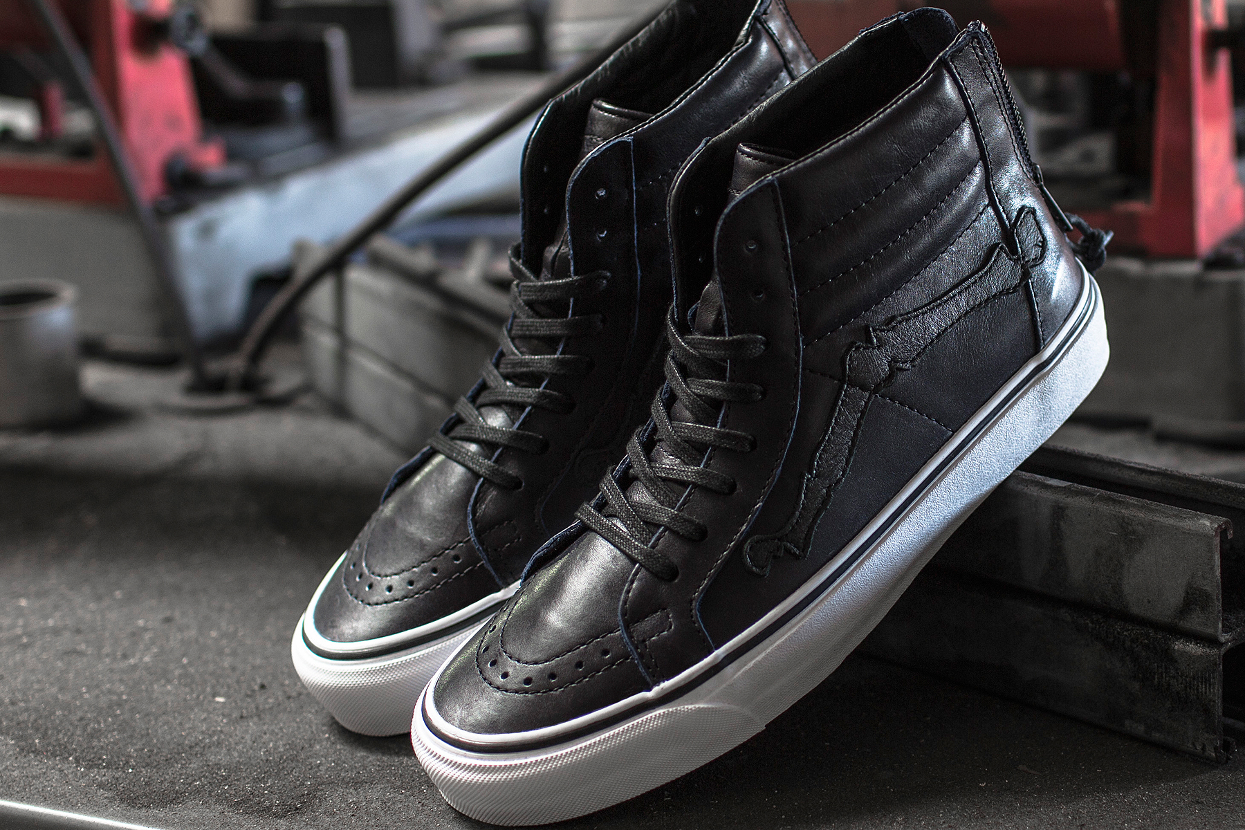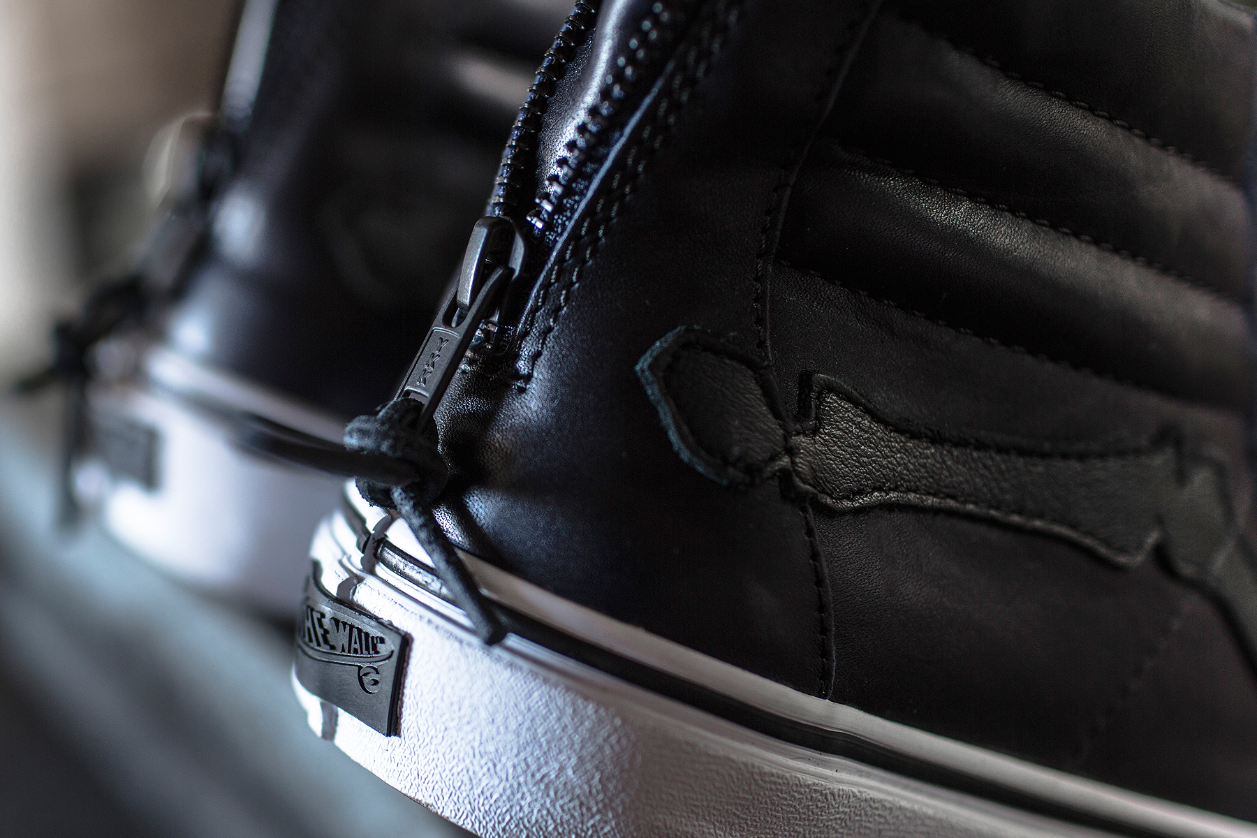 The shoes sport a modest balance of black detailing found throughout the upper, from the heel zipper, the midsole foxing, the flat waxed shoe strings, and “Bone” shaped Jazz Stripe atop Vans’ iconic waffle sole.